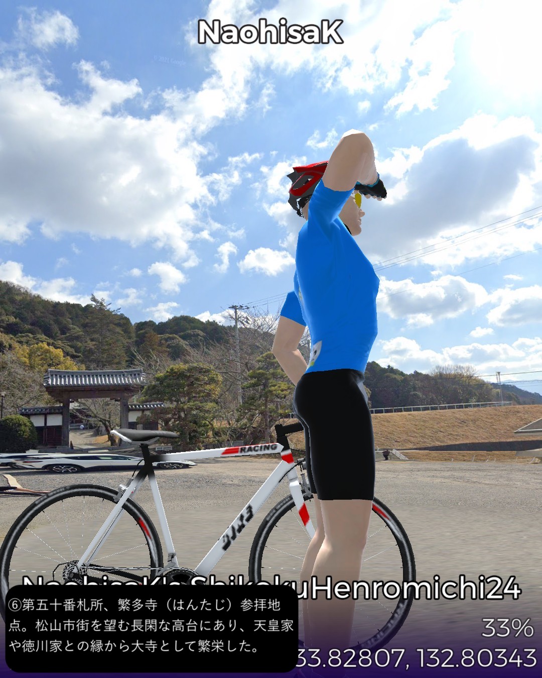 VRサイクリング、四国遍路道24日目。いよいよ残る霊場をカウントダウンしつつお遍路を完遂して四国から抜けるプロセスに入る。松山城脇をスタートし、松山市北部に位置する第五十二番太山寺、第五十三番円明寺を参拝した後、Uターンして松山市街の東側、道後温泉を抜けてさらに南下しつつ第五十一番石手寺、第五十番繁多寺、第四十九番浄土寺、第四十八番西林寺と霊場密集地帯をやっつけた後、東へ針路を転じて国道を進む。最後は石鎚山系の中腹にある第六十番横峰寺の参拝地点まで64kmの長丁場。前半の太山寺から西林寺まではほぼ遍路道で、前回の第四十七番八坂寺までの遍路道の先を逆に戻ってくるルートとなる。この辺の密集した霊場は、豊かな平原に展開しているせいか、四国霊場に多い山の寺に比べると、大きな伽藍と重要文化財を数多く有する立派な霊場となっている。後半のルートは遍路道でも旧街道でもない国道沿いに、延々と平原を進んだ後、石鎚山系の端の山道をまた延々と進む。次第に四国山脈の中心であり、近畿以西の西日本最高峰でもある石鎚山系が近づいて来て見え隠れするが、やはりここまでに足を踏み入れてきた四国の山々とは一線を画す高嶺の気高さが感じられる山容だ。中部地方のアルプスの雰囲気がある。その山系の中にある横峰寺も簡単にアクセスできる場所ではなく、かなり手前でストリートビューの打ち止めとなった。次回はいよいよ巡礼の旅もラストスパートで一気にVRお遍路を完遂させる予定である。