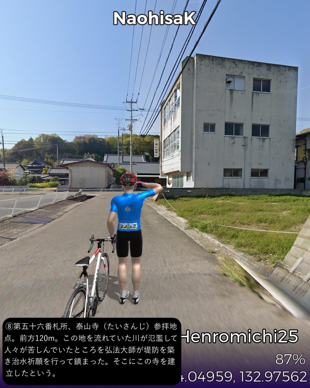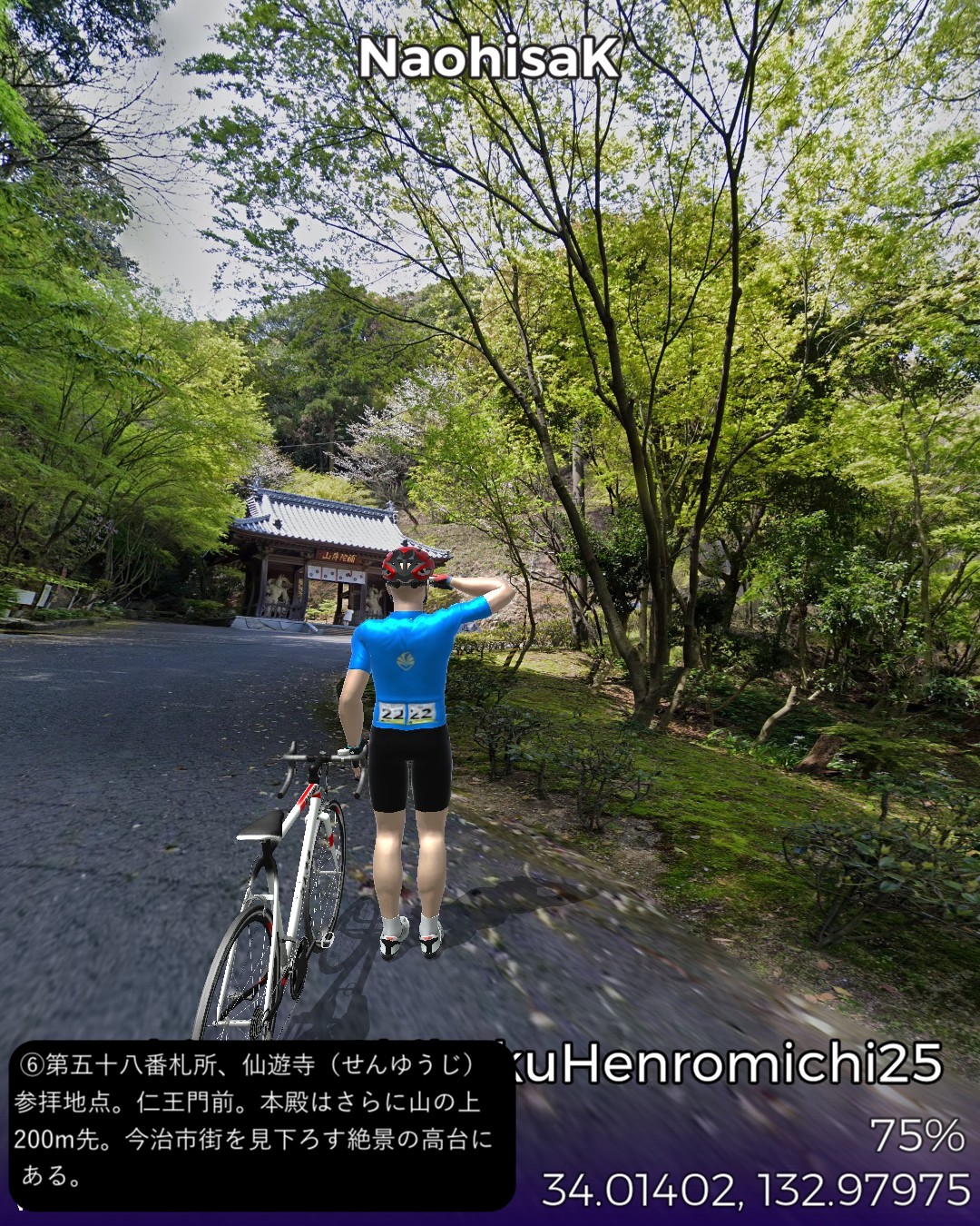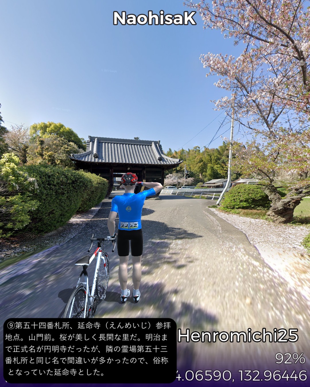 VRサイクリング、四国遍路道25日目。いよいよ今回が最終日。第六十番札所の麓、前回通った道の途中を起点とし、西条市に密集する霊場を一気に攻め、第六十一番札所香園寺から第六十四番札所前神寺を回る。その後針路を北西に転じて今治方面へ進み。こちらも密集する霊場を第五十九番国分寺から58番、57番、56番、54番、と参拝して最後に今治市街の中心にある55番南光坊(南伸坊のおにぎり頭を連想する)をゴールとする51kmの行程。お遍路はほとんどが霊場ごとに山登りをさせられるが、今回は10箇所を一気に巡礼するが、第六十一番札所、仙遊寺で少し山道がある他は海岸に近い平地を進む楽勝のルート。これで非常にアブノーマルな順番となったが四国八十八箇所霊場の巡礼を完了した。当然ストリートビューの都合で霊場内部には立ち入れなかったが、ほとんどの場合山門前で参拝することができた。お遍路を完了する結願(けちがん)と称するのはおこがましいが、なんちゃって結願あるいはVR結願を成就したということにしておこう。さて次回はいよいよ四国を退出することになる。どのような脱出ルートかはあえて言わないが予想はつくと思う。