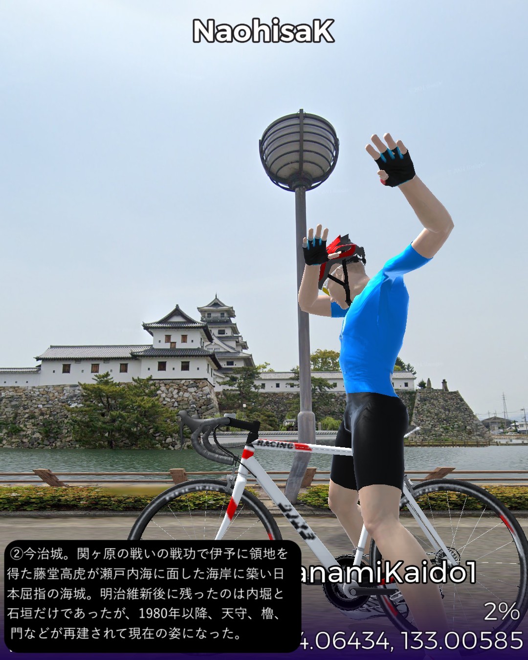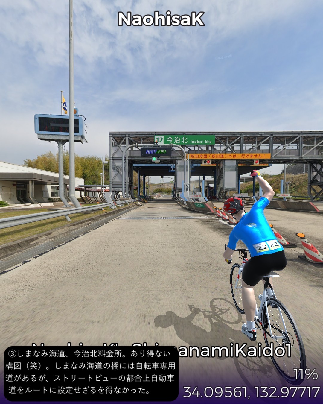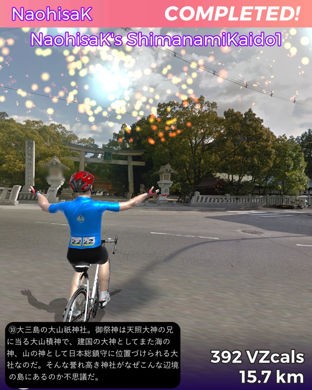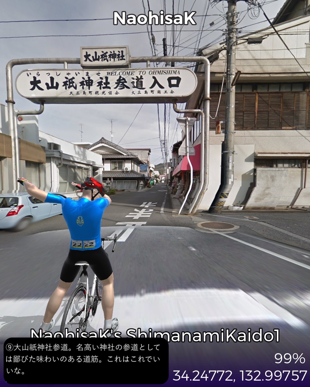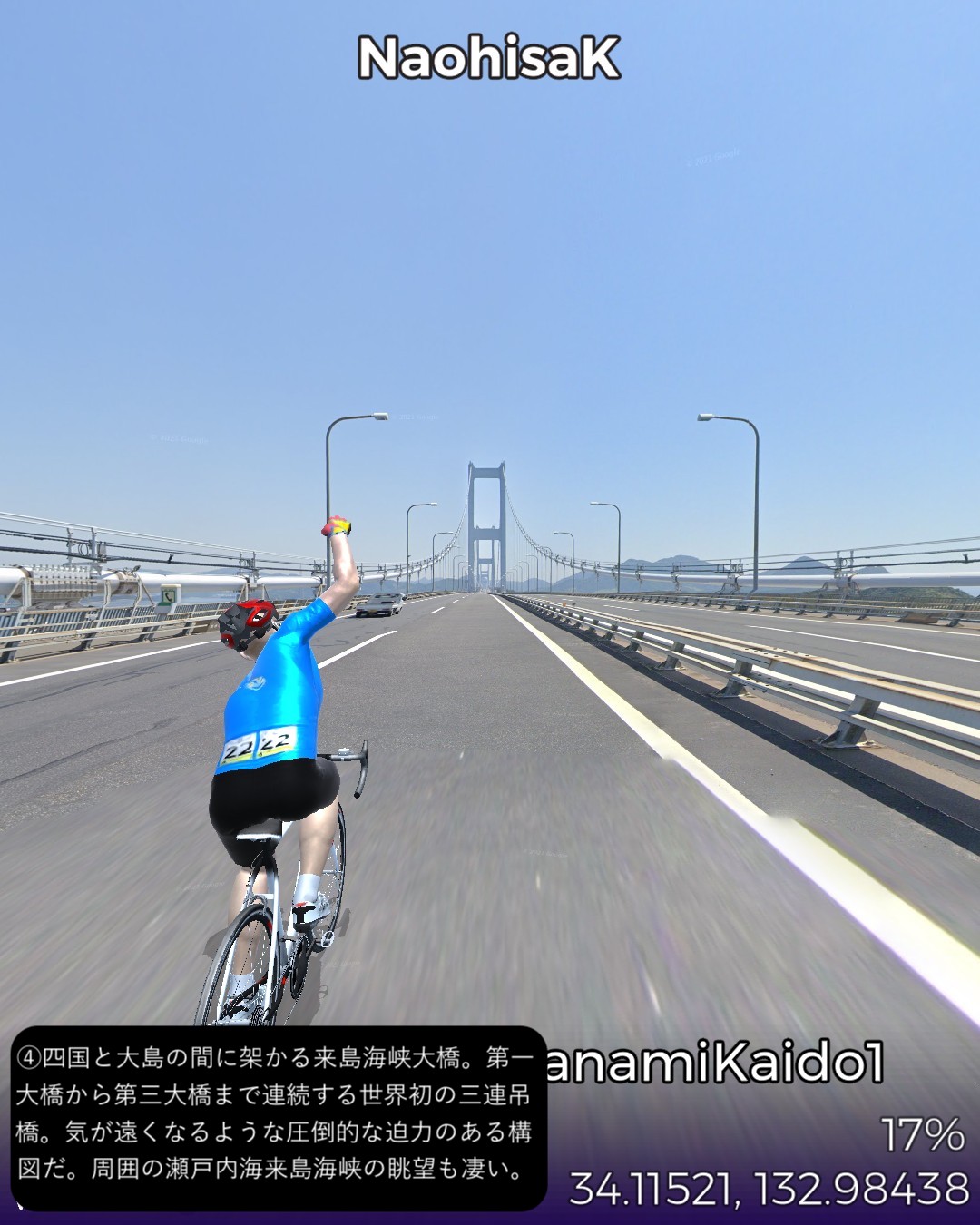 VRサイクリング。四国のお遍路巡礼の旅を終えて、今治からしまなみ海道を通って中国地方、広島県の尾道へ抜けるルートへ進むこととする。本日はその1日目。今治から壮大な三連吊橋の来島海峡大橋を延々と渡り、大島、伯方島を抜けて、芸予諸島最大の島、大三島の日本総鎮守として崇められてきた大山祇神社をゴールとする54kmの行程。今治と言えばタオルしか連想できなかったが、世界でも例を見ない船舶関係の産業の集積都市らしい。海運業では北欧、香港、ギリシャのピレウスと並ぶ世界四大船主として今治が挙げられ、「今治オーナー」と総称される家族経営の船主会社が70社以上あり、タンカーや貨物船など約900隻を保有し日本郵船や商船三井にレンタルしているという。また造船業では今や日本最大の今治造船の本拠地である。しまなみ海道で来島海峡大橋を渡る手前左側の波止浜地区に今治造船の広大な造船所が広がっている。こうした事実が日本国民に広く知られていないようなのは何故だろう。しまなみ海道の各橋には専用の自転車道が付いていて、世界中のサイクリストの聖地となっているが、VRサイクリングとしては残念ながら自転車道のストリートビューがないので、掟破りではあるが自動車専用道のしまなみ海道を通るのを許容することとする。ゴールとした大山祇神社は、その昔海賊が闊歩していた芸予諸島の辺境の島にありながら、天照大神の兄に当る大山積神を祀る、西日本屈指の品格を有する大社でそのロケーションのギャップに驚く。