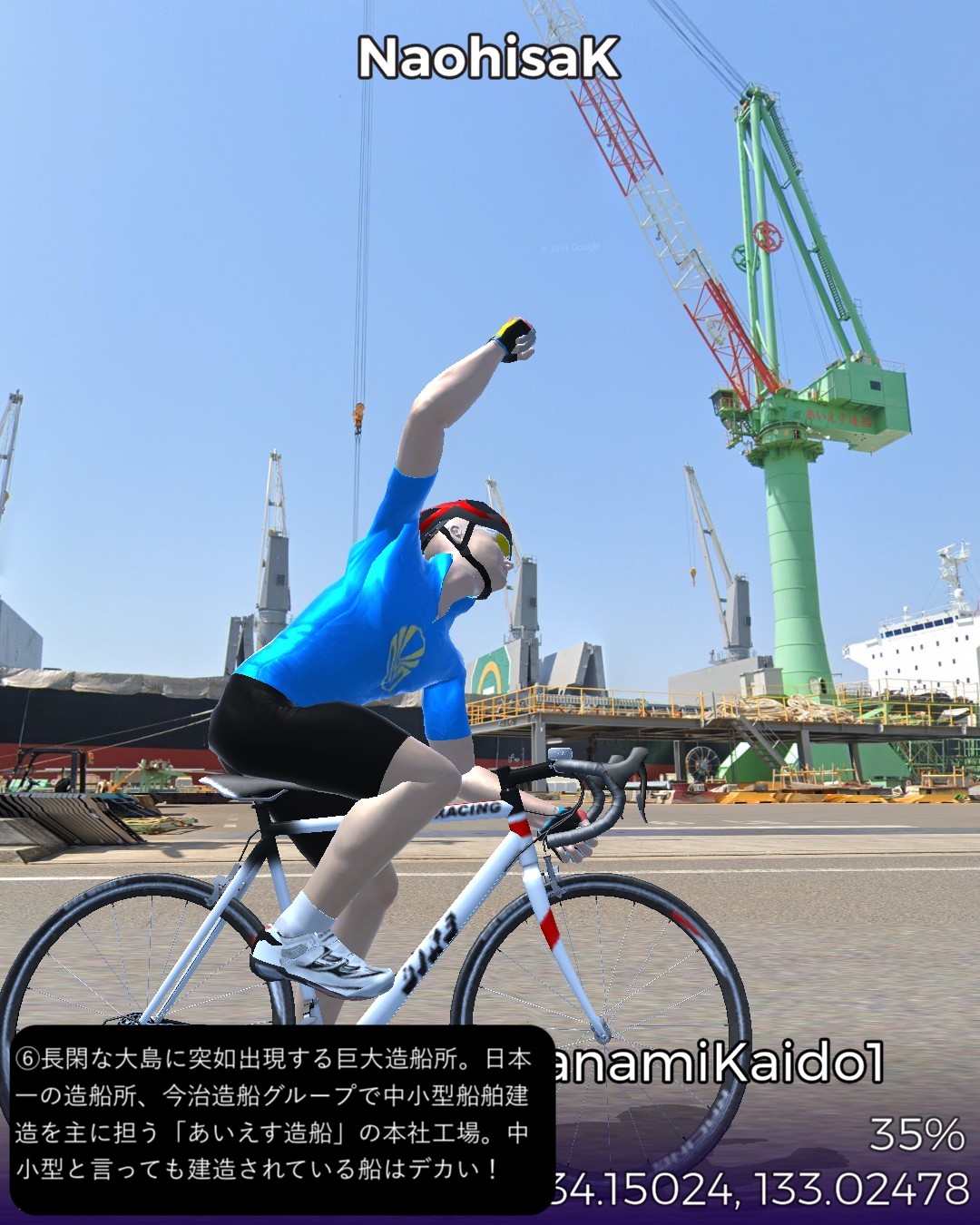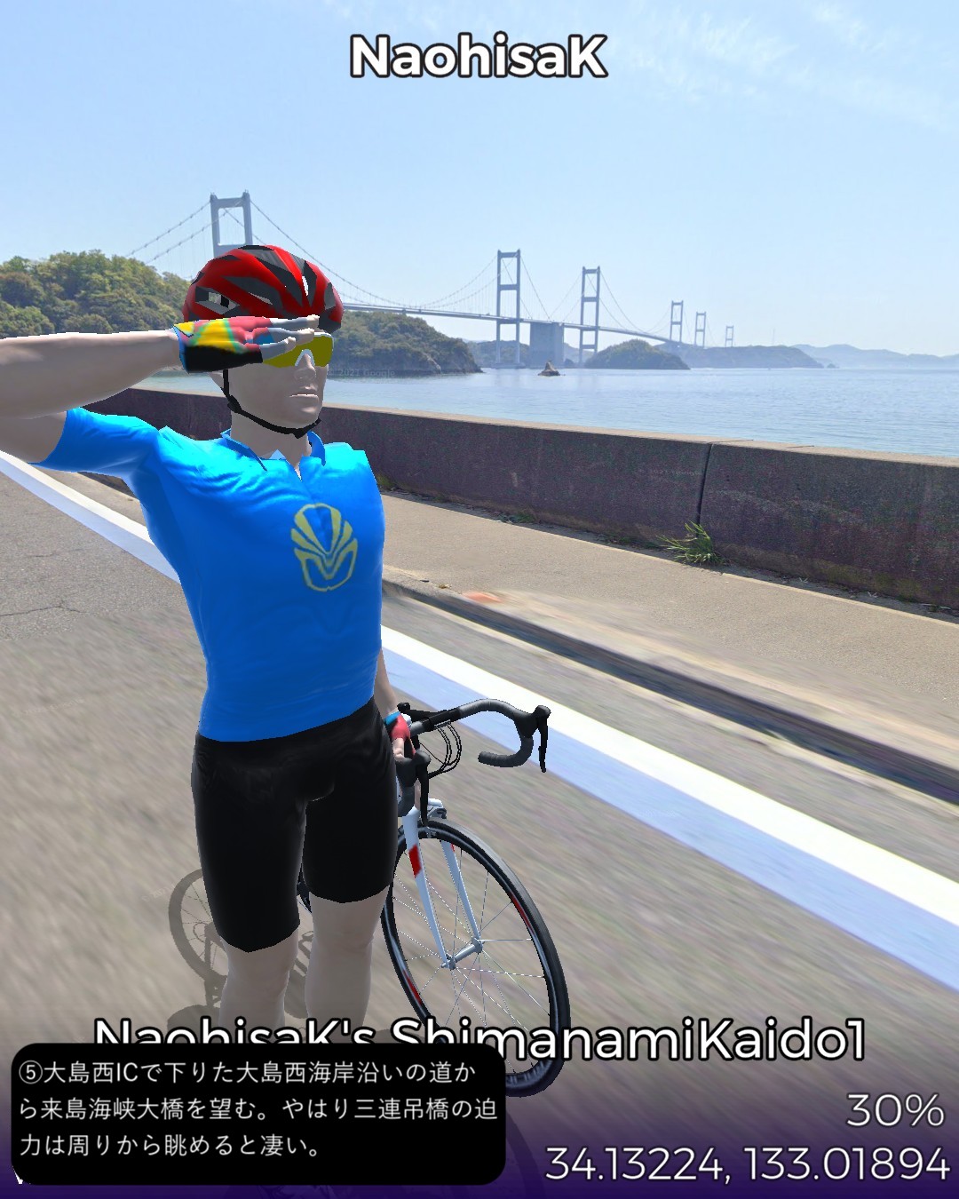 VRサイクリング。四国のお遍路巡礼の旅を終えて、今治からしまなみ海道を通って中国地方、広島県の尾道へ抜けるルートへ進むこととする。本日はその1日目。今治から壮大な三連吊橋の来島海峡大橋を延々と渡り、大島、伯方島を抜けて、芸予諸島最大の島、大三島の日本総鎮守として崇められてきた大山祇神社をゴールとする54kmの行程。今治と言えばタオルしか連想できなかったが、世界でも例を見ない船舶関係の産業の集積都市らしい。海運業では北欧、香港、ギリシャのピレウスと並ぶ世界四大船主として今治が挙げられ、「今治オーナー」と総称される家族経営の船主会社が70社以上あり、タンカーや貨物船など約900隻を保有し日本郵船や商船三井にレンタルしているという。また造船業では今や日本最大の今治造船の本拠地である。しまなみ海道で来島海峡大橋を渡る手前左側の波止浜地区に今治造船の広大な造船所が広がっている。こうした事実が日本国民に広く知られていないようなのは何故だろう。しまなみ海道の各橋には専用の自転車道が付いていて、世界中のサイクリストの聖地となっているが、VRサイクリングとしては残念ながら自転車道のストリートビューがないので、掟破りではあるが自動車専用道のしまなみ海道を通るのを許容することとする。ゴールとした大山祇神社は、その昔海賊が闊歩していた芸予諸島の辺境の島にありながら、天照大神の兄に当る大山積神を祀る、西日本屈指の品格を有する大社でそのロケーションのギャップに驚く。