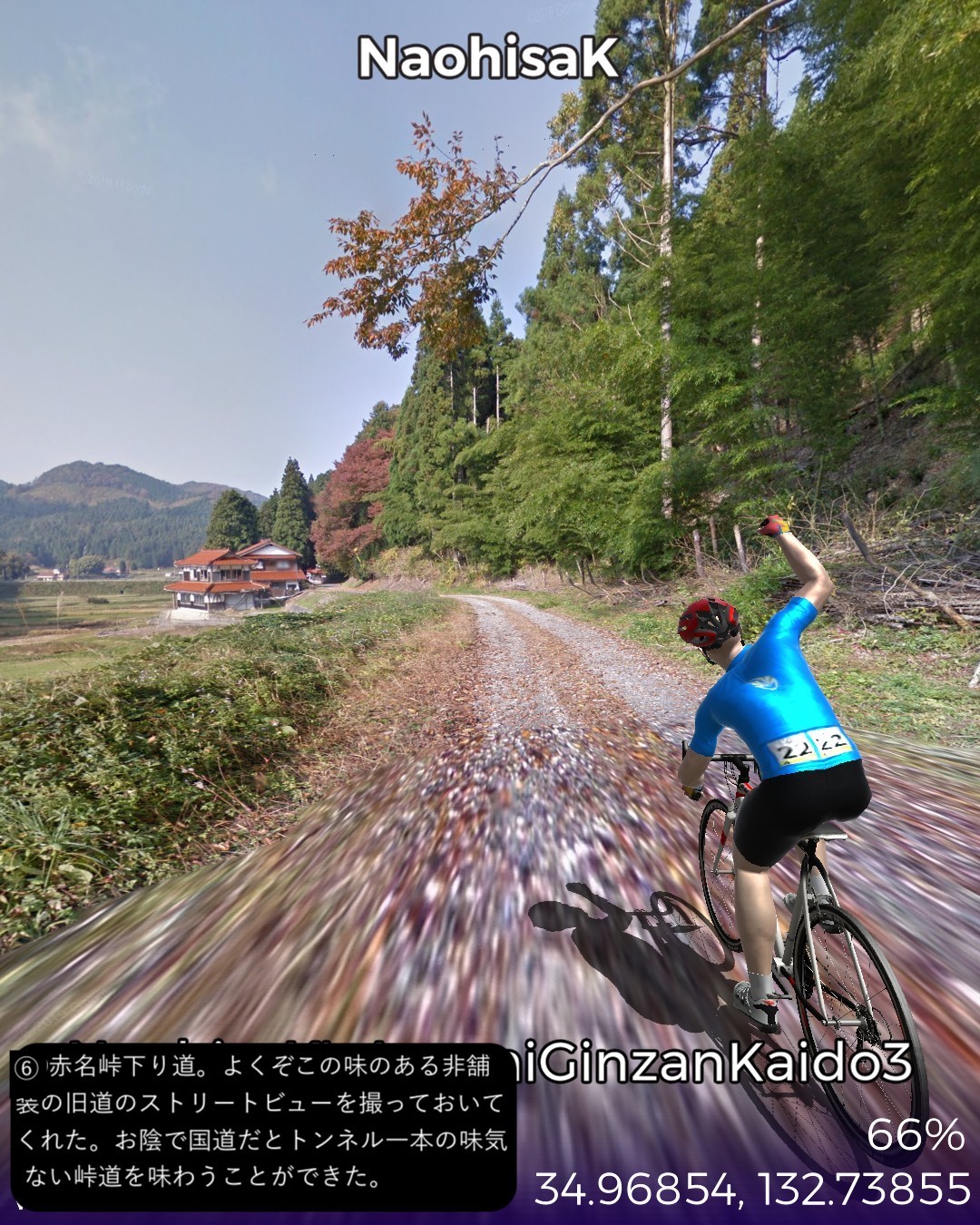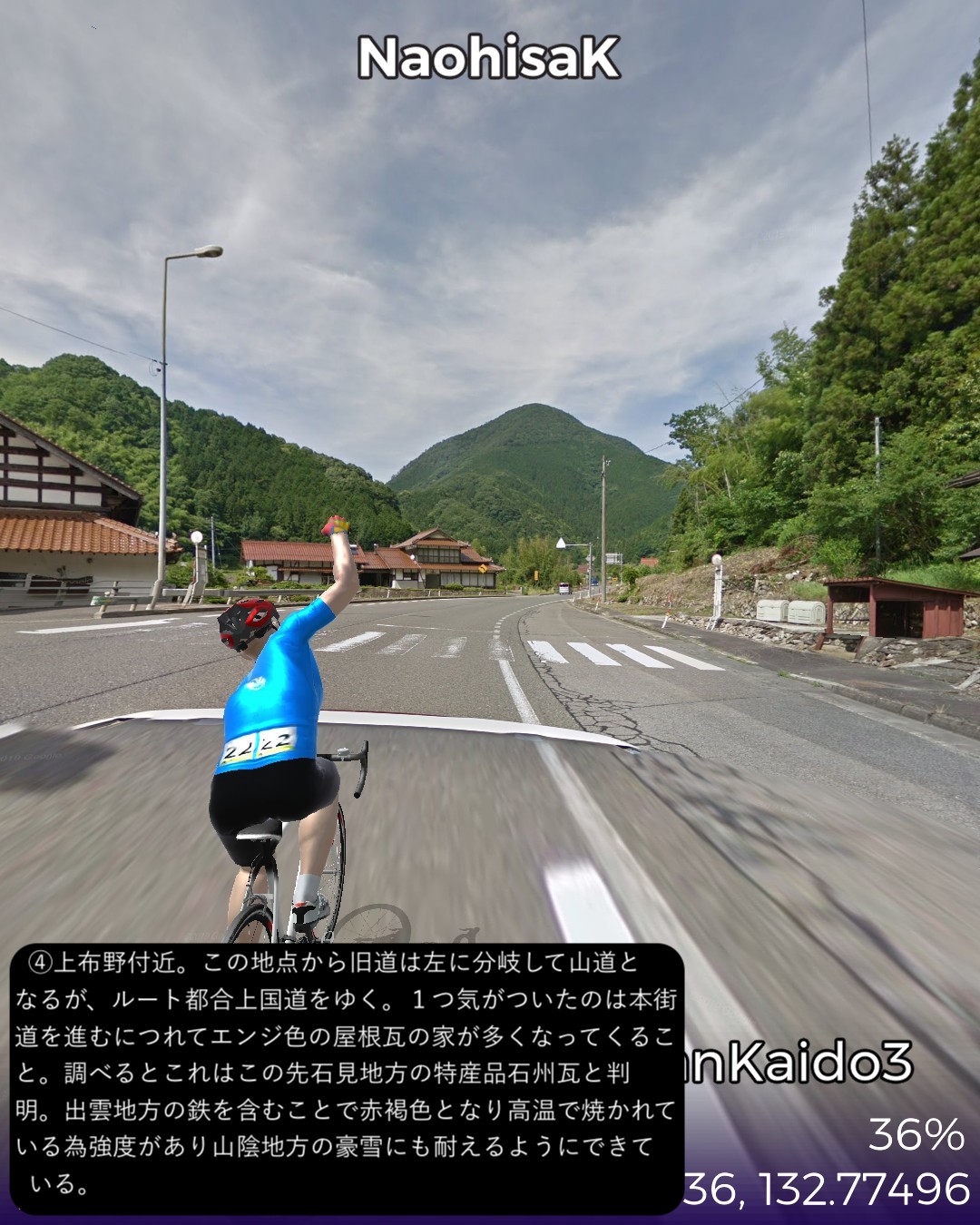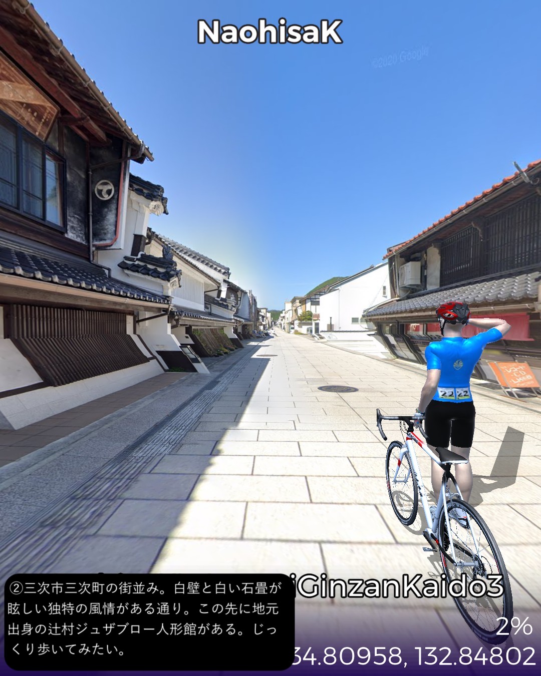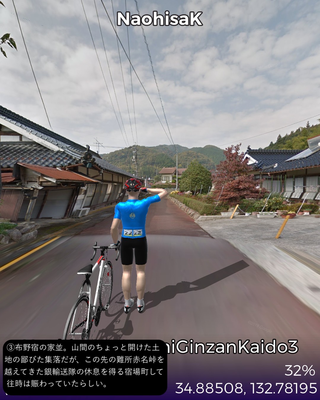 VRサイクリング、石見銀山街道3日目。広島県北部の都市、三次(みよし)宿をスタートし、街道最大の難所赤名峠を越えて島根県に入り九日市宿まで40kmの行程。三次宿は前回のゴール周辺は特に特徴のない地方都市であったが、今回スタート地点から市街中央、江の川に架かる巴橋を渡った三次市三次町界隈は古い街並が保存されていて観光資源となっていた。白壁と白い石畳の街並みが他にはない雰囲気を醸し出していて印象的だ。その先は少しずつ登り道を進んでゆき、布野宿を過ぎると難所赤名峠に差し掛かる。ここは珍しく非舗装の旧道の峠道にストリートビューが付いていたので趣きのある峠道を走れた。赤名峠を越えると石見の国、島根県に入る。峠を下った最初の集落が街道の宿場らしい趣きのある赤名宿。江戸時代にはここから銀運搬の峠越えの荷継ぎの役を近隣の村々が強いられたらしい。銀山街道を進んでいて1つ気がついたことがある。尾道から北上して行くにつれ、街道沿いでエンジ色の瓦屋根の家々の割合が増えてきて、三次宿の先ではほぼ100%に近くなっているのだ。調べるとこれは石見地方の特産品、石州瓦と判明した。この地域特有の鉄を含む石を使っていることから赤褐色を帯びるが、高温で焼かれている為強度があり山陰地方の豪雪にも耐えるようにできているということだ。納得。次回は本日のゴール九日市宿を出ていよいよ石見銀山に至る。