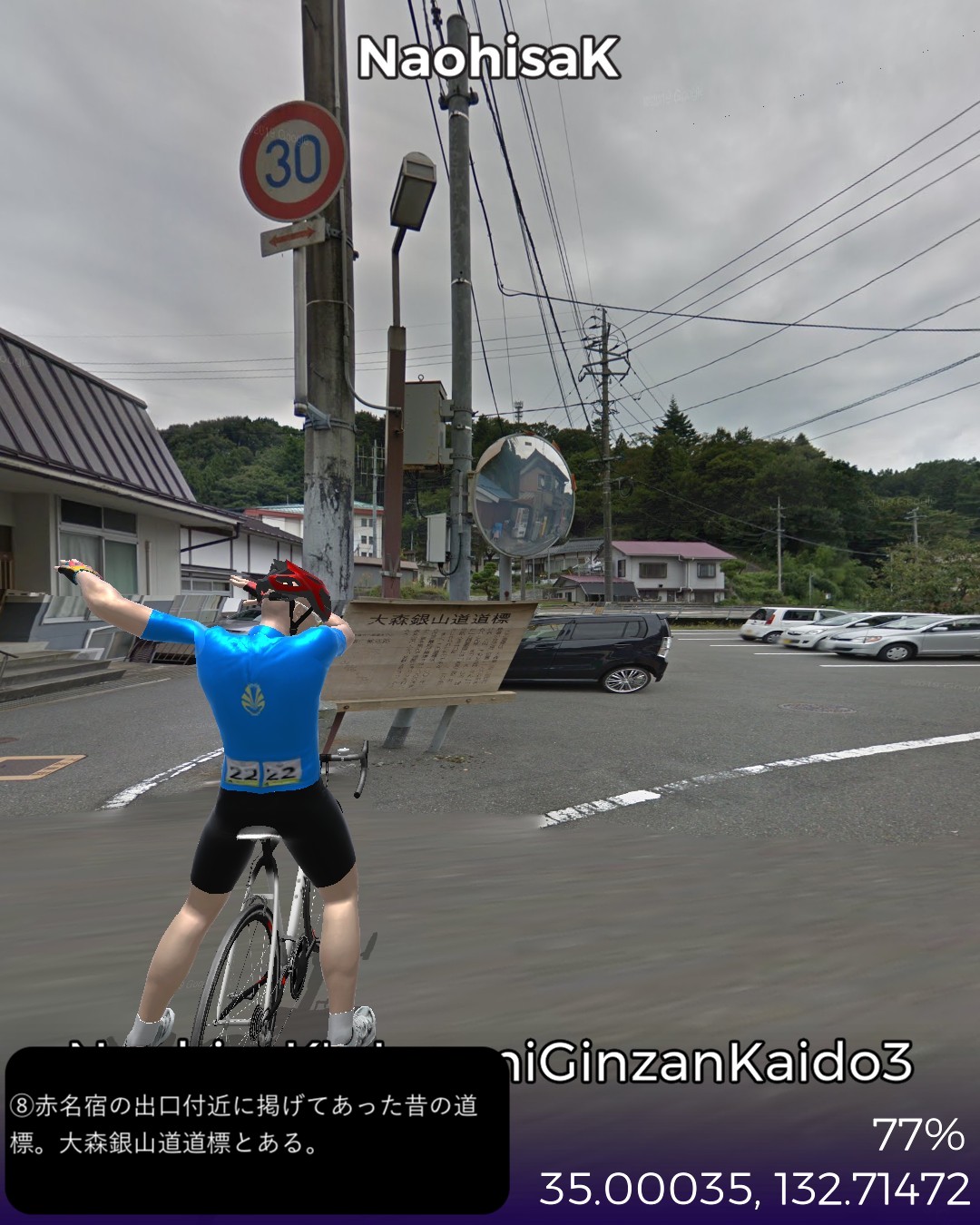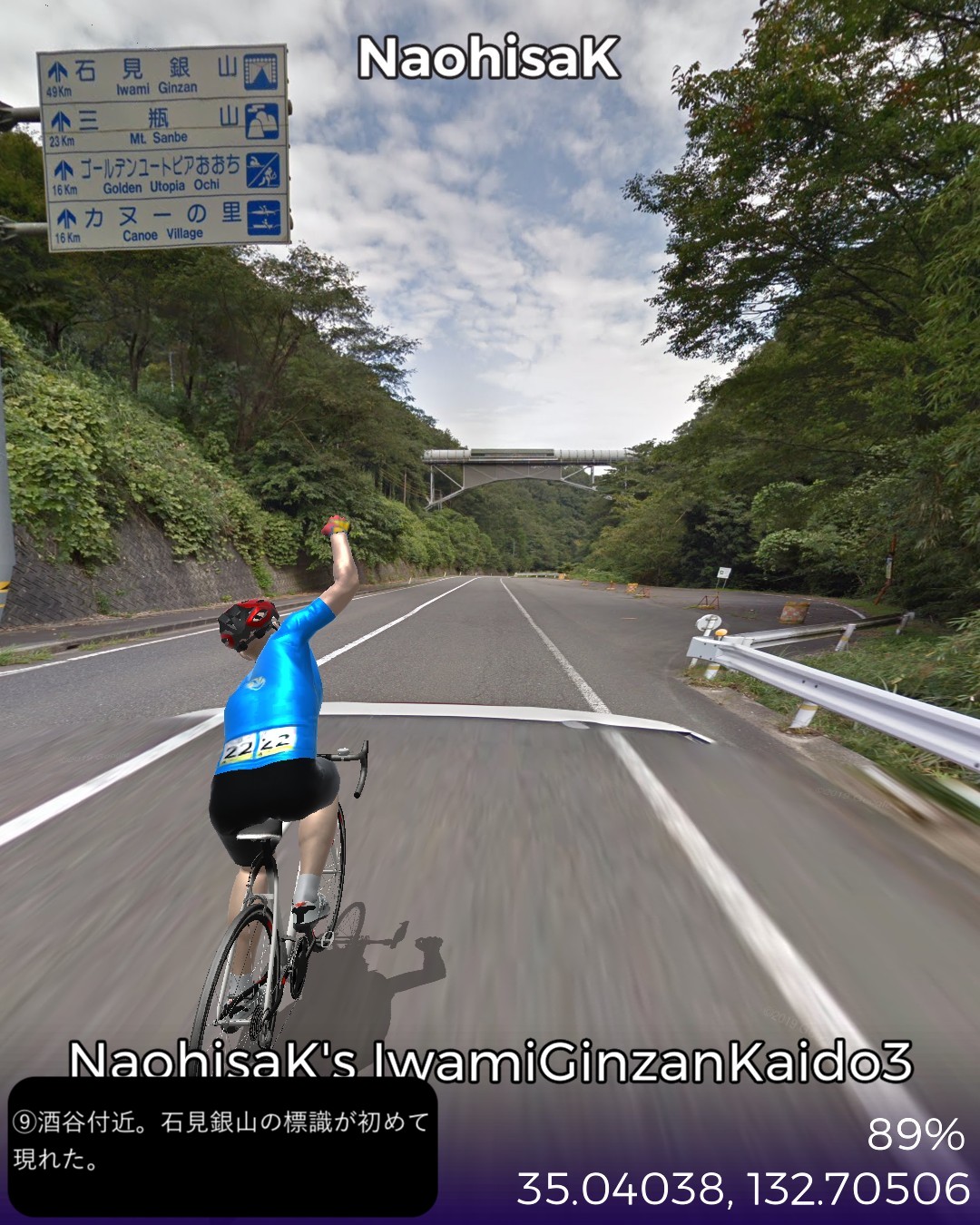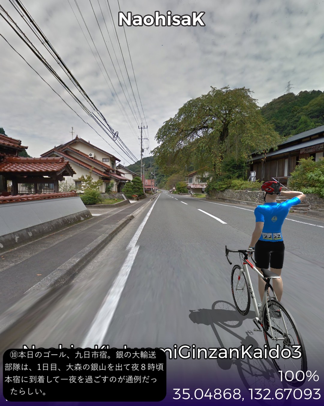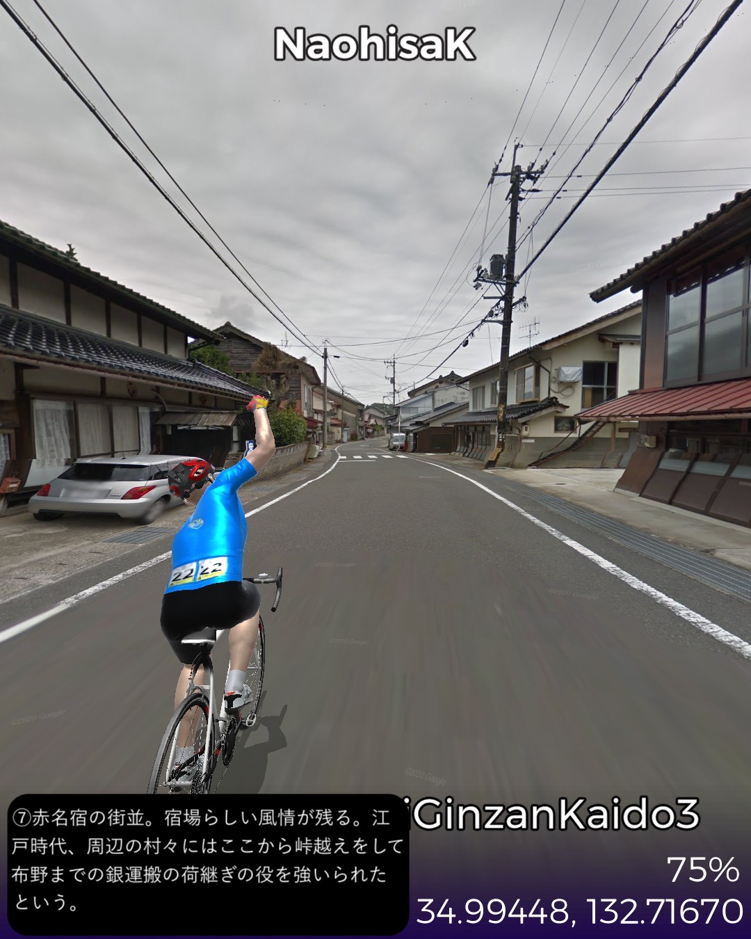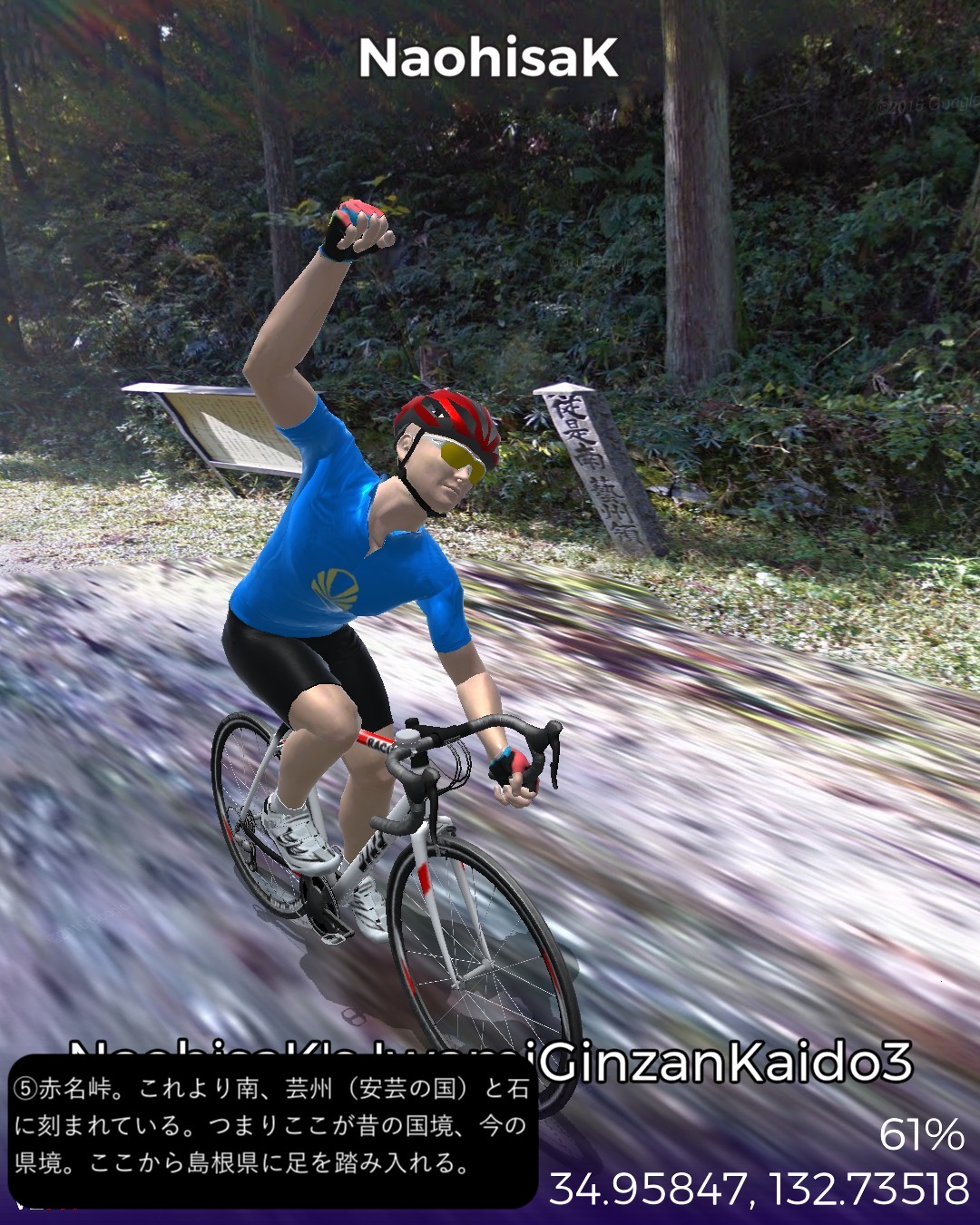 VRサイクリング、石見銀山街道3日目。広島県北部の都市、三次(みよし)宿をスタートし、街道最大の難所赤名峠を越えて島根県に入り九日市宿まで40kmの行程。三次宿は前回のゴール周辺は特に特徴のない地方都市であったが、今回スタート地点から市街中央、江の川に架かる巴橋を渡った三次市三次町界隈は古い街並が保存されていて観光資源となっていた。白壁と白い石畳の街並みが他にはない雰囲気を醸し出していて印象的だ。その先は少しずつ登り道を進んでゆき、布野宿を過ぎると難所赤名峠に差し掛かる。ここは珍しく非舗装の旧道の峠道にストリートビューが付いていたので趣きのある峠道を走れた。赤名峠を越えると石見の国、島根県に入る。峠を下った最初の集落が街道の宿場らしい趣きのある赤名宿。江戸時代にはここから銀運搬の峠越えの荷継ぎの役を近隣の村々が強いられたらしい。銀山街道を進んでいて1つ気がついたことがある。尾道から北上して行くにつれ、街道沿いでエンジ色の瓦屋根の家々の割合が増えてきて、三次宿の先ではほぼ100%に近くなっているのだ。調べるとこれは石見地方の特産品、石州瓦と判明した。この地域特有の鉄を含む石を使っていることから赤褐色を帯びるが、高温で焼かれている為強度があり山陰地方の豪雪にも耐えるようにできているということだ。納得。次回は本日のゴール九日市宿を出ていよいよ石見銀山に至る。