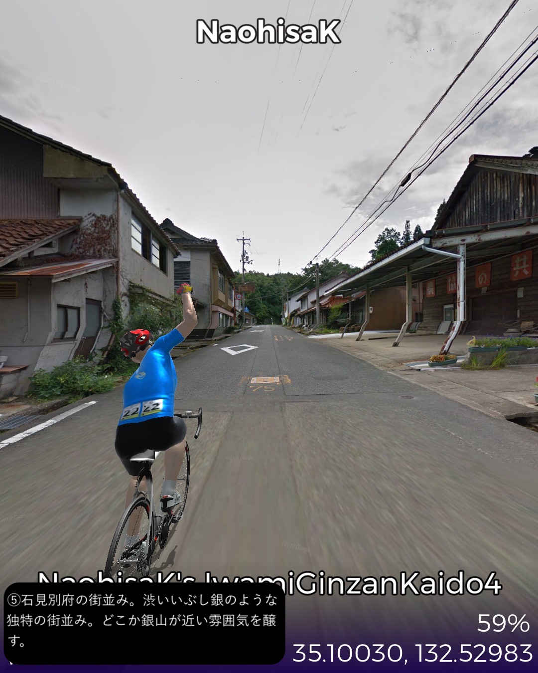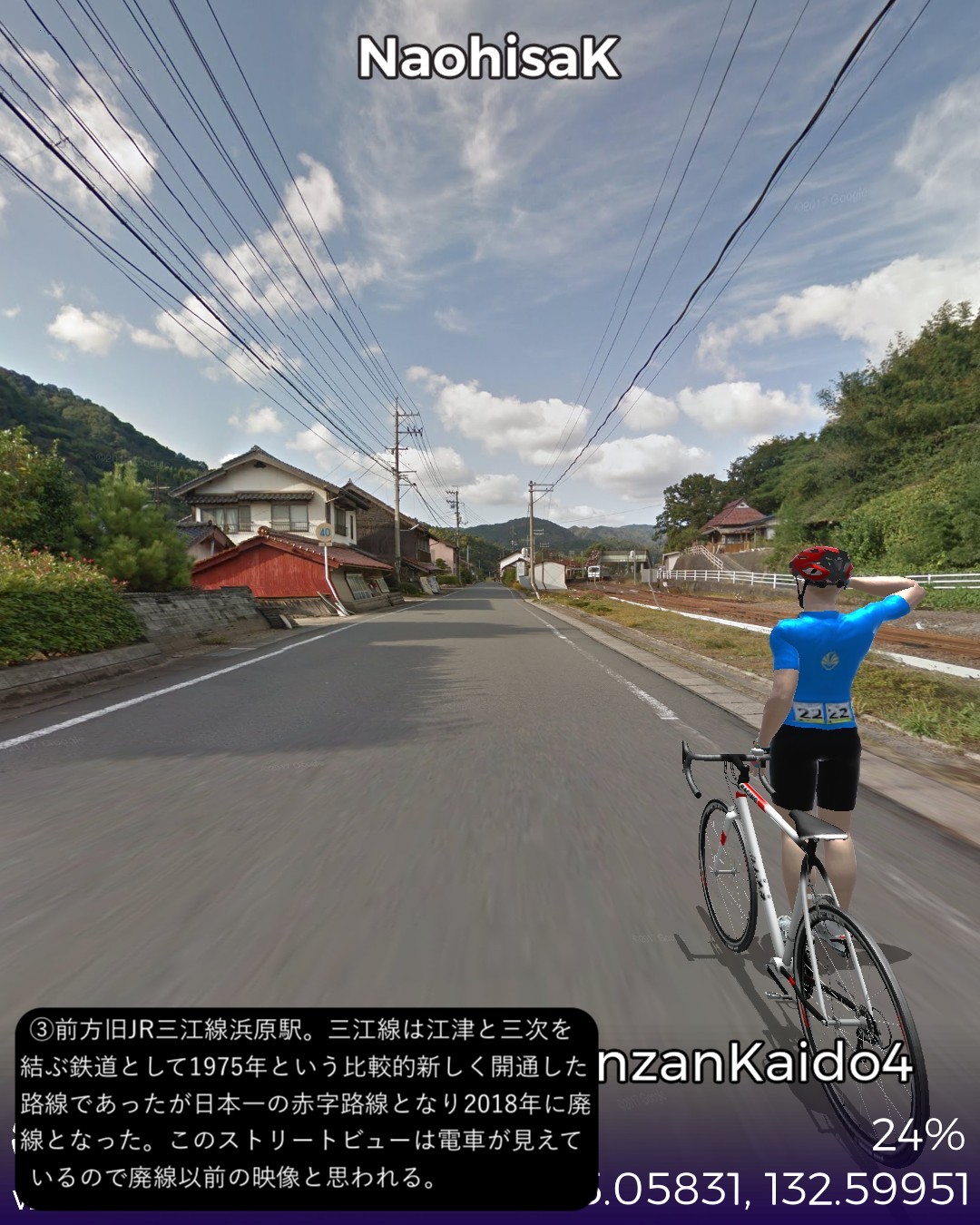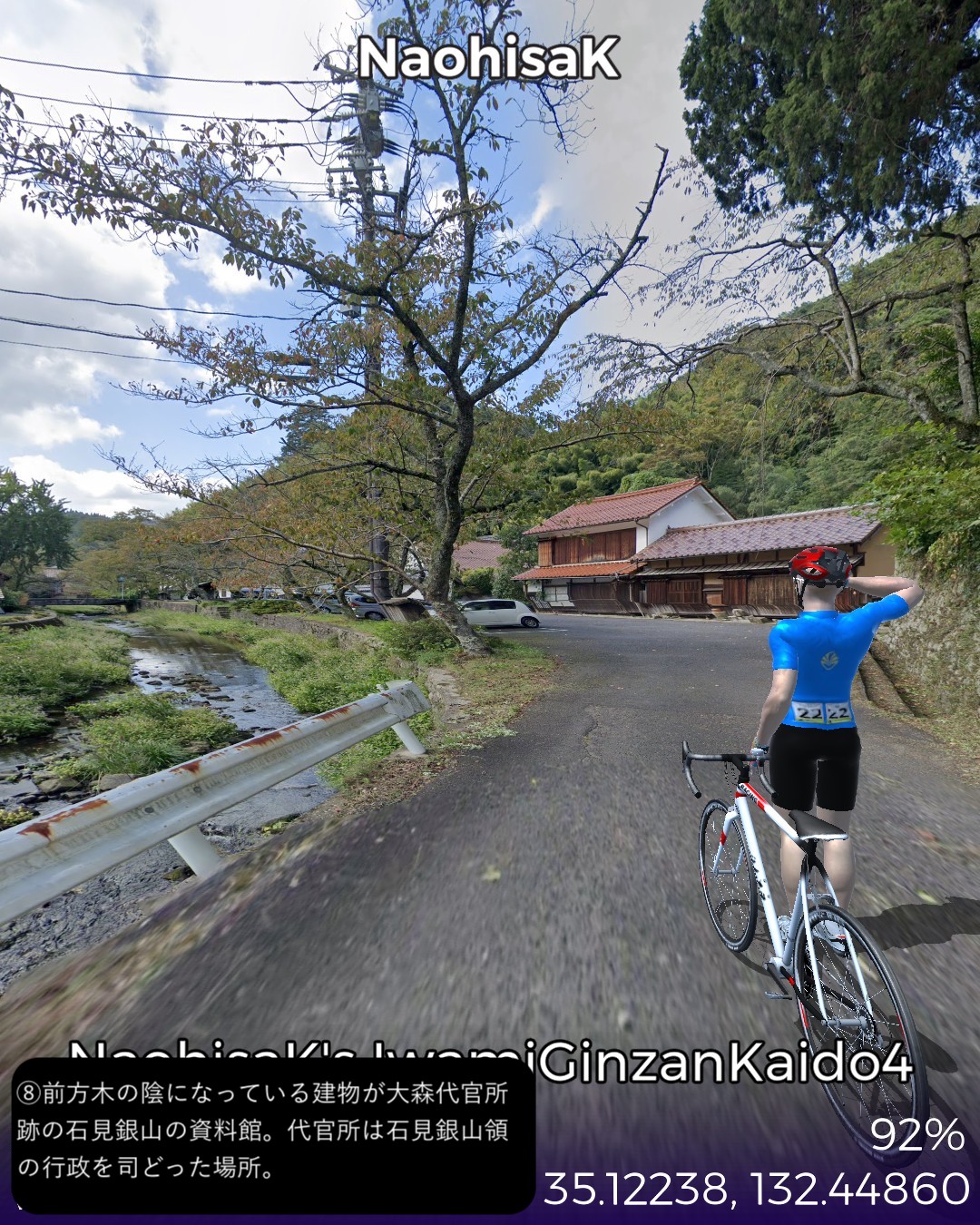 VRサイクリング、石見銀山街道4日目。九日市宿を出て山間をどんどん進んでゆき石見銀山に辿り着くまでの31kmの行程。九日市宿は銀輸送隊の1日目の宿となっていたのでちょうど1日分の行程となる。途中で地図にない鉄道の線路が街道により沿ってきてこんなところに鉄道路線があったとは知らなかったので驚いた。調べてみると日本海に面した江津と三次間を結ぶJR三江線であったが、1975年という比較的新しい路線ながら日本一の赤字路線となり2018年に廃線となったようだ。私が鉄道に最も興味を持っていた中学生の頃にはなかった路線なので存在を知らなかったわけだが既に廃線になっていたとは山間を走る風景の良さそうな路線だけに残念。廃線と言いつつ浜原駅には列車が止まっていたので2018年以前のストリートビュー映像だったようだ。ゴールの世界遺産、石見銀山には鉱山の歴史的街並みが保存されていたがこれが実にいい雰囲気。国内でも指折りのアクセスの悪さがなければ、中山道の妻籠宿や東海道の関宿に匹敵するような観光資源になるであろうがそうならないのがいいんだね。ゴール地点は明治時代の製錬所跡としたがここは建てられてから既に銀鉱脈が枯渇しかけていることがわかってすぐに閉鎖になった場所だ。江戸時代の頃の廃坑の探検ルートが整備されているようだ。さてここから次にどこへ進んでゆこうか。