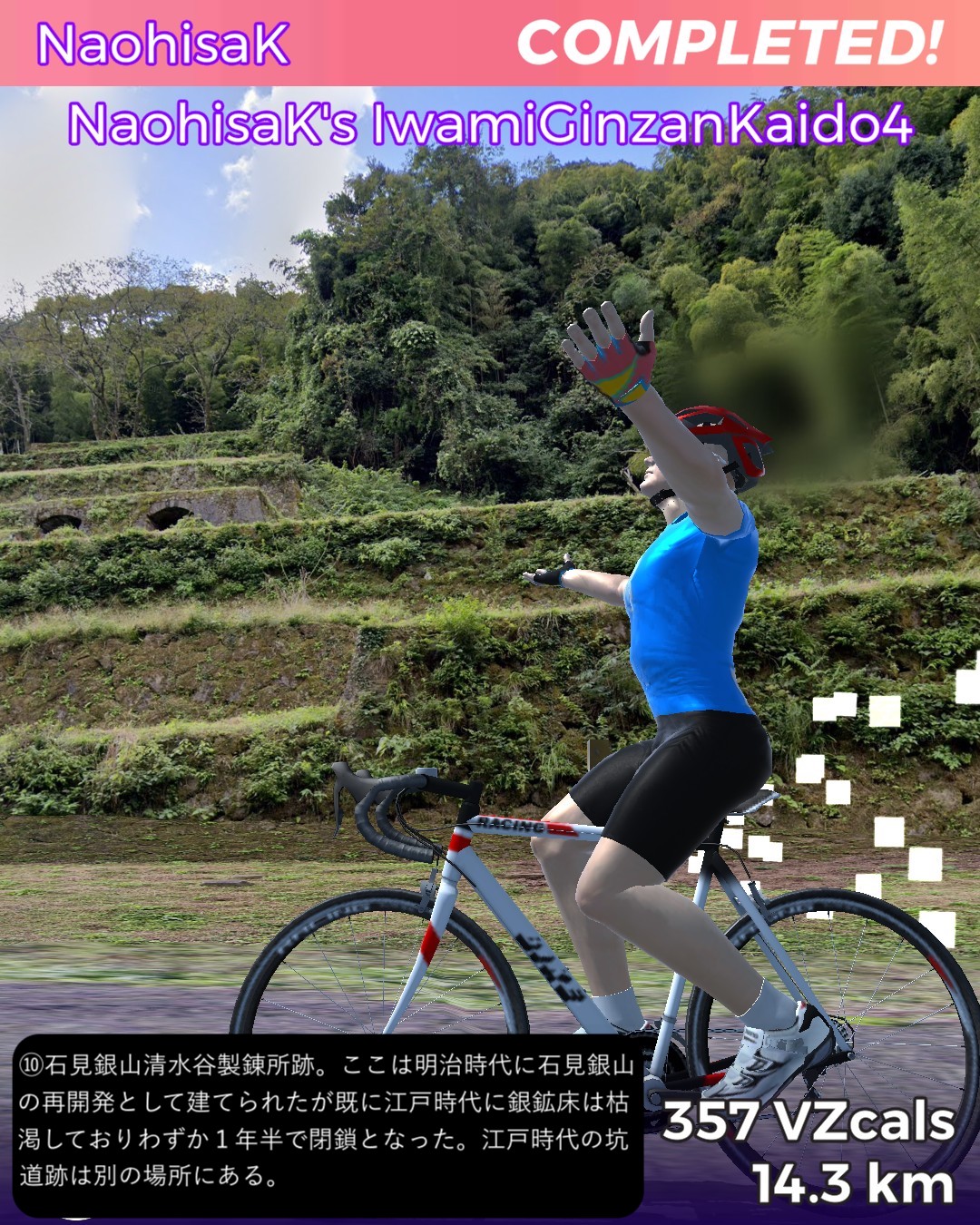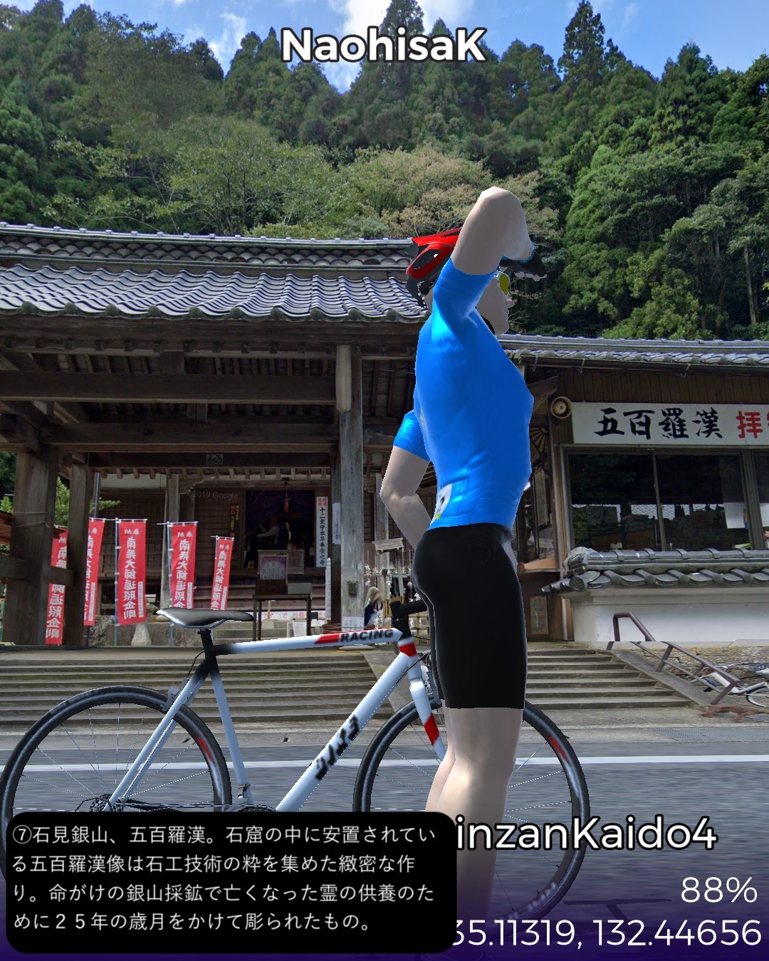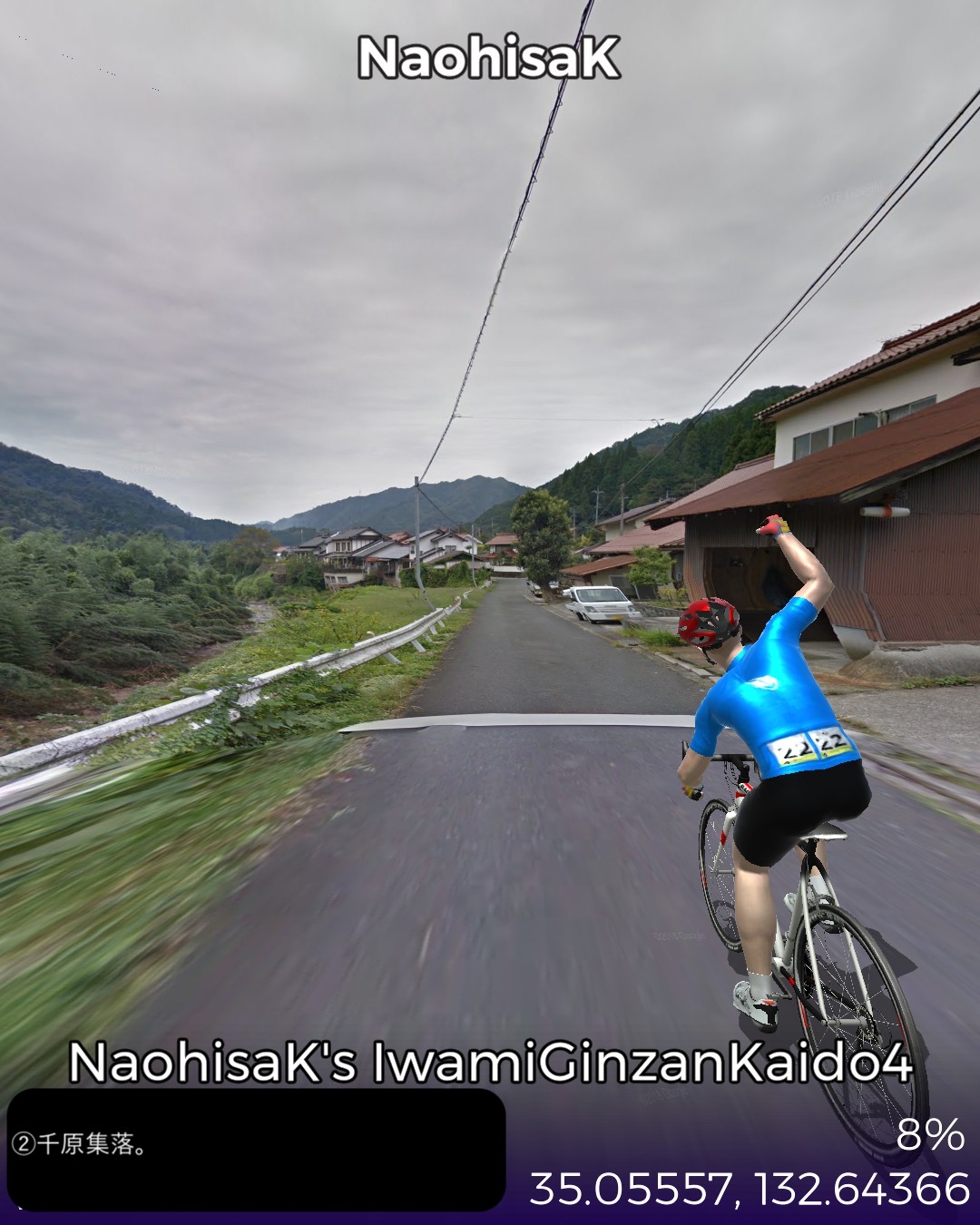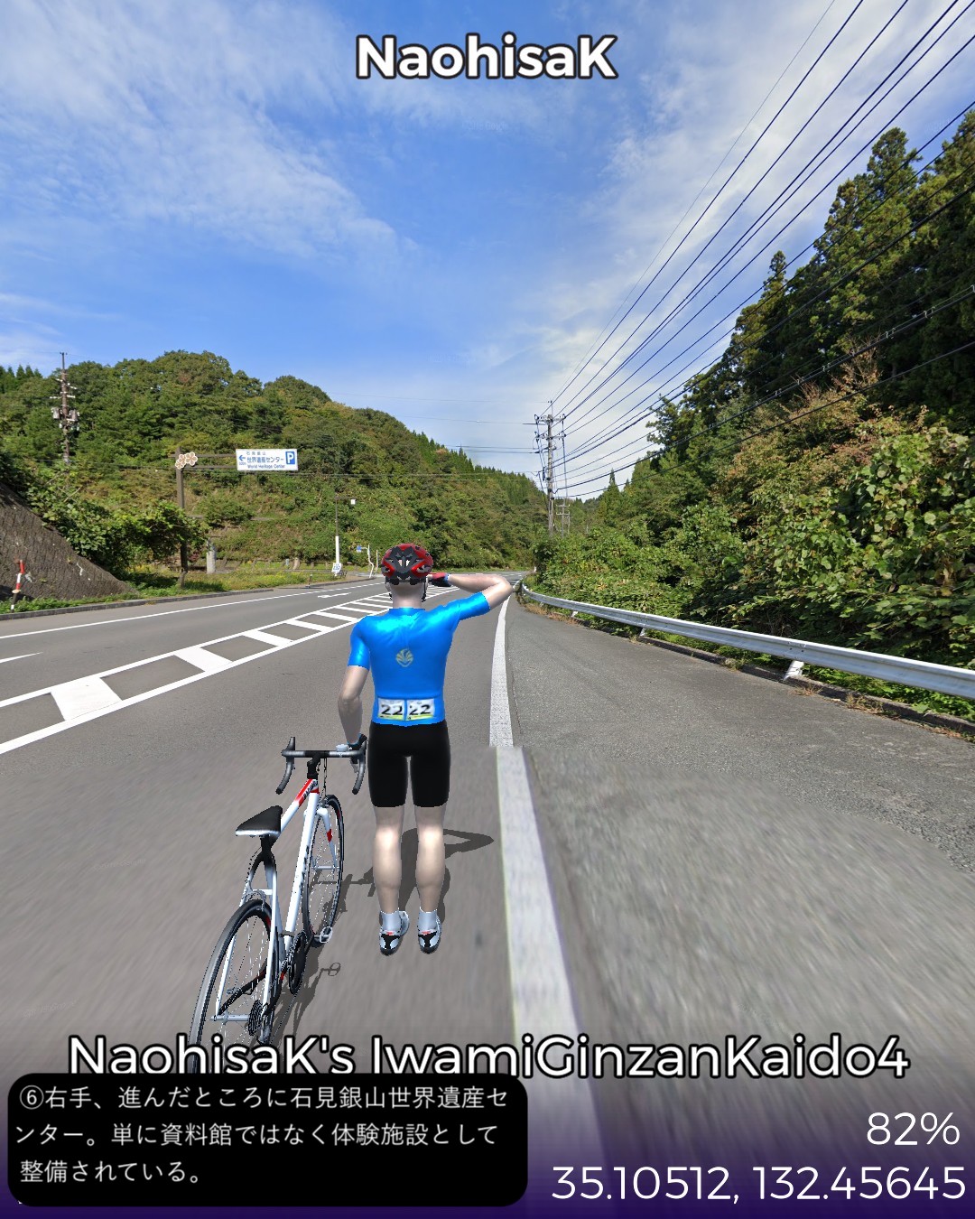 VRサイクリング、石見銀山街道4日目。九日市宿を出て山間をどんどん進んでゆき石見銀山に辿り着くまでの31kmの行程。九日市宿は銀輸送隊の1日目の宿となっていたのでちょうど1日分の行程となる。途中で地図にない鉄道の線路が街道により沿ってきてこんなところに鉄道路線があったとは知らなかったので驚いた。調べてみると日本海に面した江津と三次間を結ぶJR三江線であったが、1975年という比較的新しい路線ながら日本一の赤字路線となり2018年に廃線となったようだ。私が鉄道に最も興味を持っていた中学生の頃にはなかった路線なので存在を知らなかったわけだが既に廃線になっていたとは山間を走る風景の良さそうな路線だけに残念。廃線と言いつつ浜原駅には列車が止まっていたので2018年以前のストリートビュー映像だったようだ。ゴールの世界遺産、石見銀山には鉱山の歴史的街並みが保存されていたがこれが実にいい雰囲気。国内でも指折りのアクセスの悪さがなければ、中山道の妻籠宿や東海道の関宿に匹敵するような観光資源になるであろうがそうならないのがいいんだね。ゴール地点は明治時代の製錬所跡としたがここは建てられてから既に銀鉱脈が枯渇しかけていることがわかってすぐに閉鎖になった場所だ。江戸時代の頃の廃坑の探検ルートが整備されているようだ。さてここから次にどこへ進んでゆこうか。