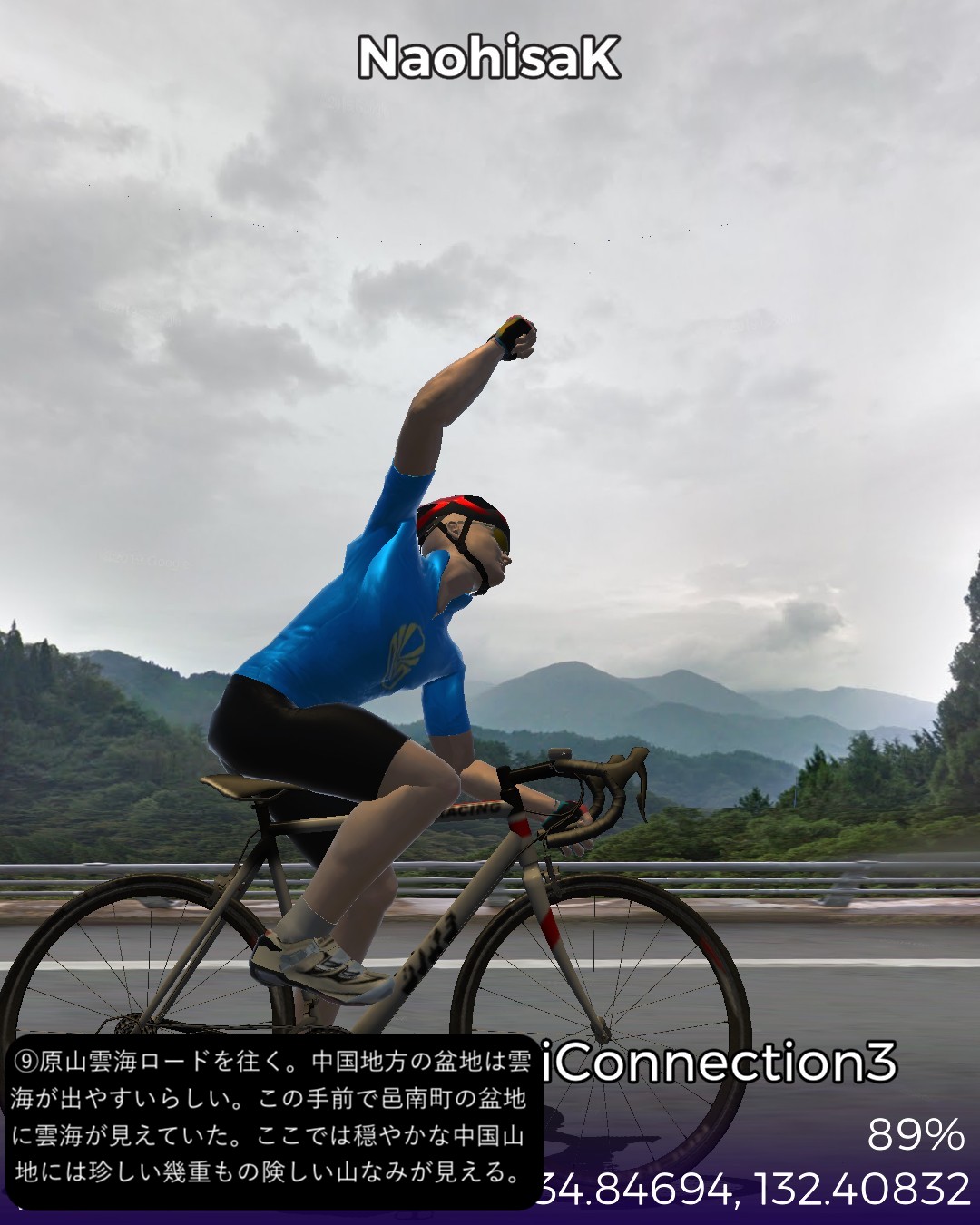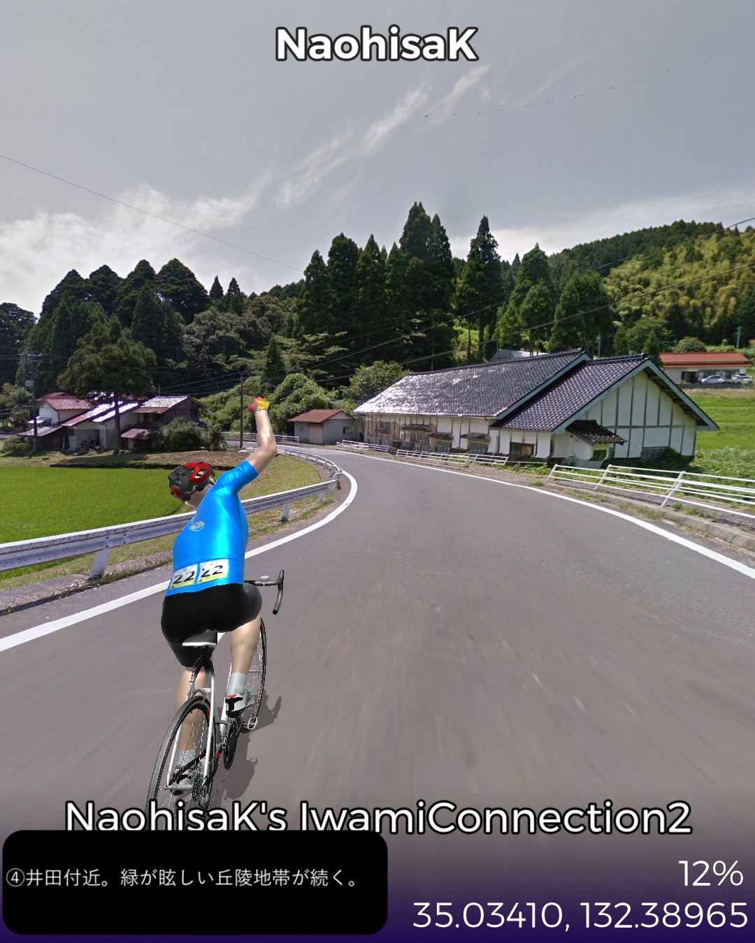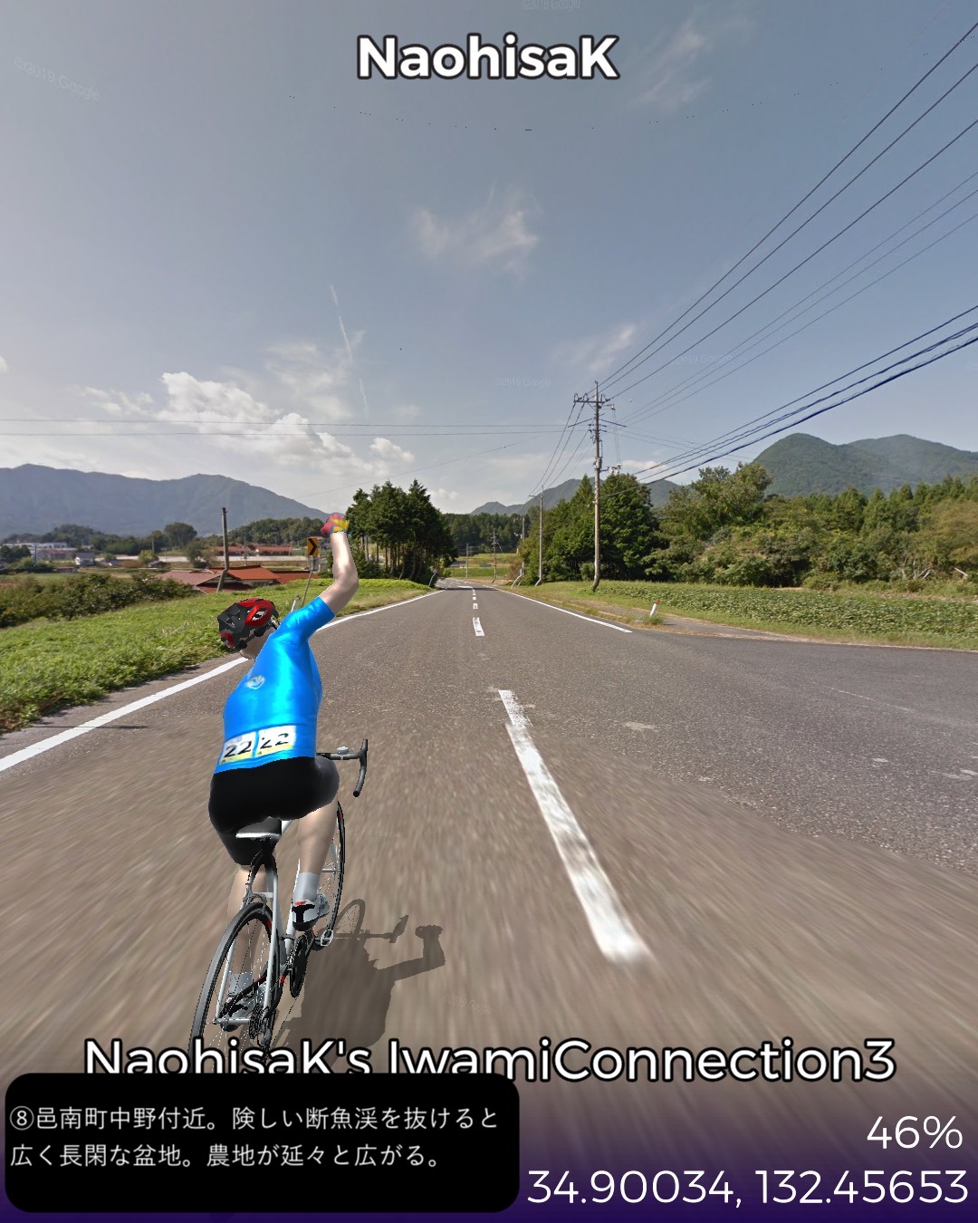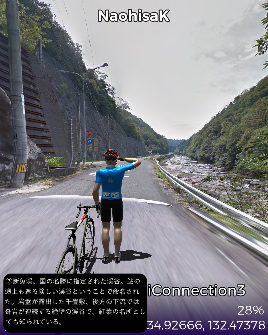 VRサイクリング、石見銀山街道で石見銀山まで到達した後は広島方面へ向かうこととし、山陰の浜田と広島を結ぶ石州街道へ中継する名もなき道を往く。石見銀山から川本町、邑南町を通り石州街道の宿場町市木宿まで49kmの行程。島根県、石見地方の山間部をウロウロするので石見コネクションとルートを命名してみた。ルート全般に緑溢れる丘陵地帯にオレンジ色の石州瓦の屋根の家々が点在する欧州の田舎のような風景が美しい。険しい山道は少なかったが、その中で魚の遡上も阻止するというところから断魚渓という名の渓谷を通った。千畳敷の河原に奇岩の絶壁が続くなかなかの景勝地であった。石見銀山もそうだが、日本でもマイナーでアクセスの悪いワーストに入りそうな島根県の山奥なので観光資源が知られておらず過小評価されているような気がする。