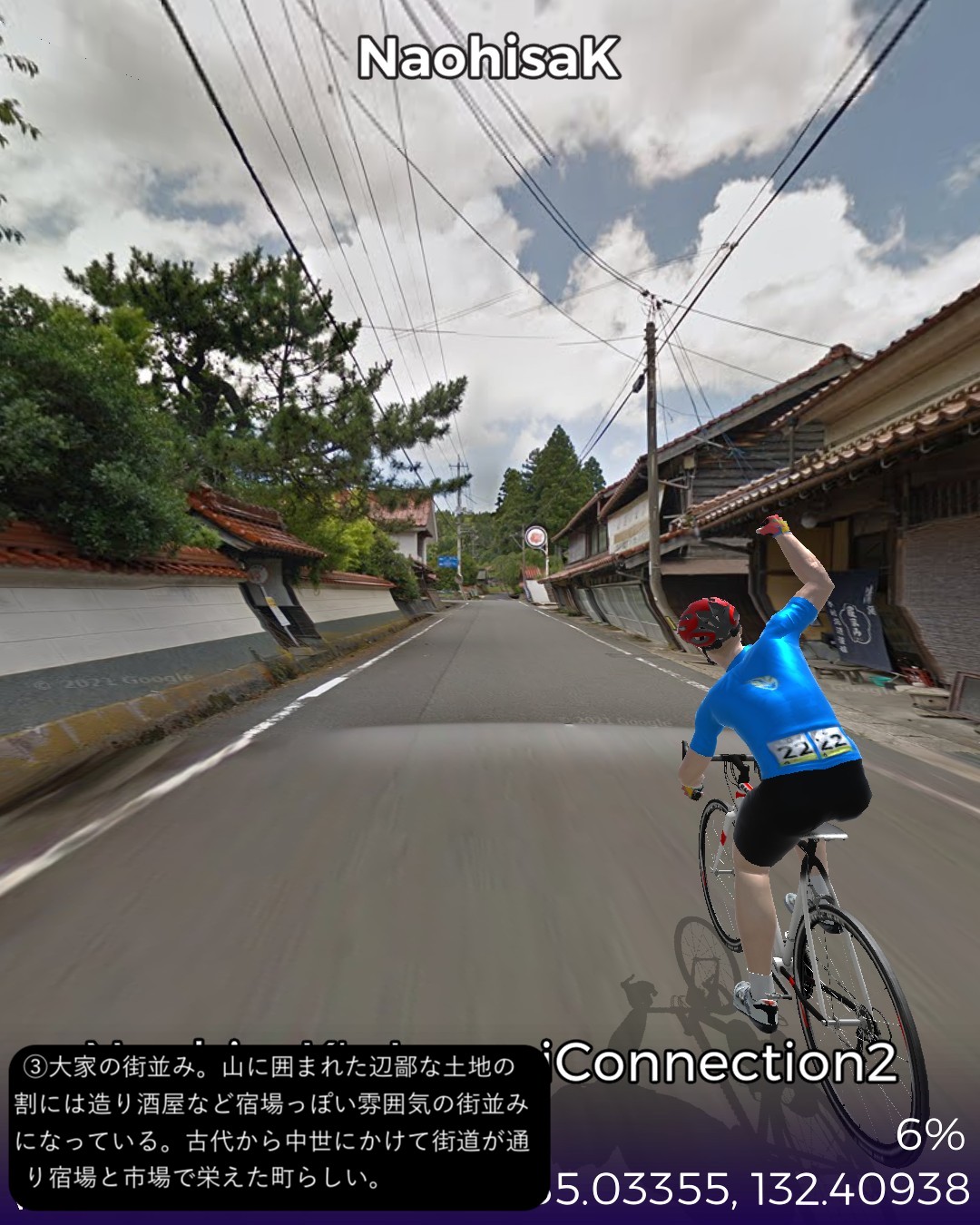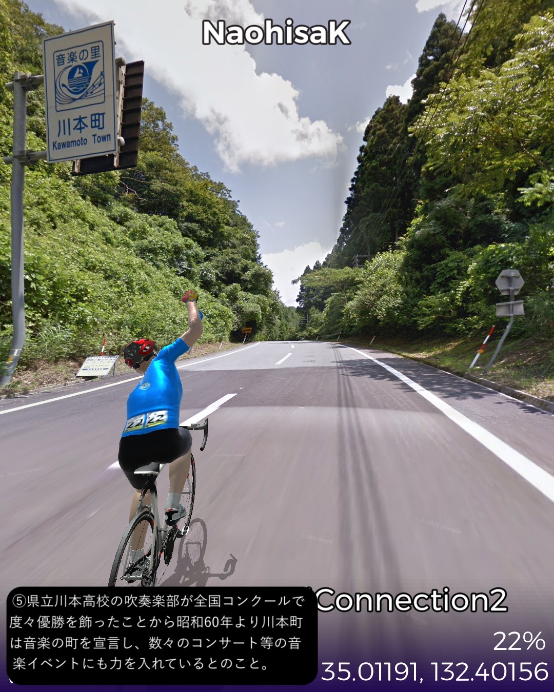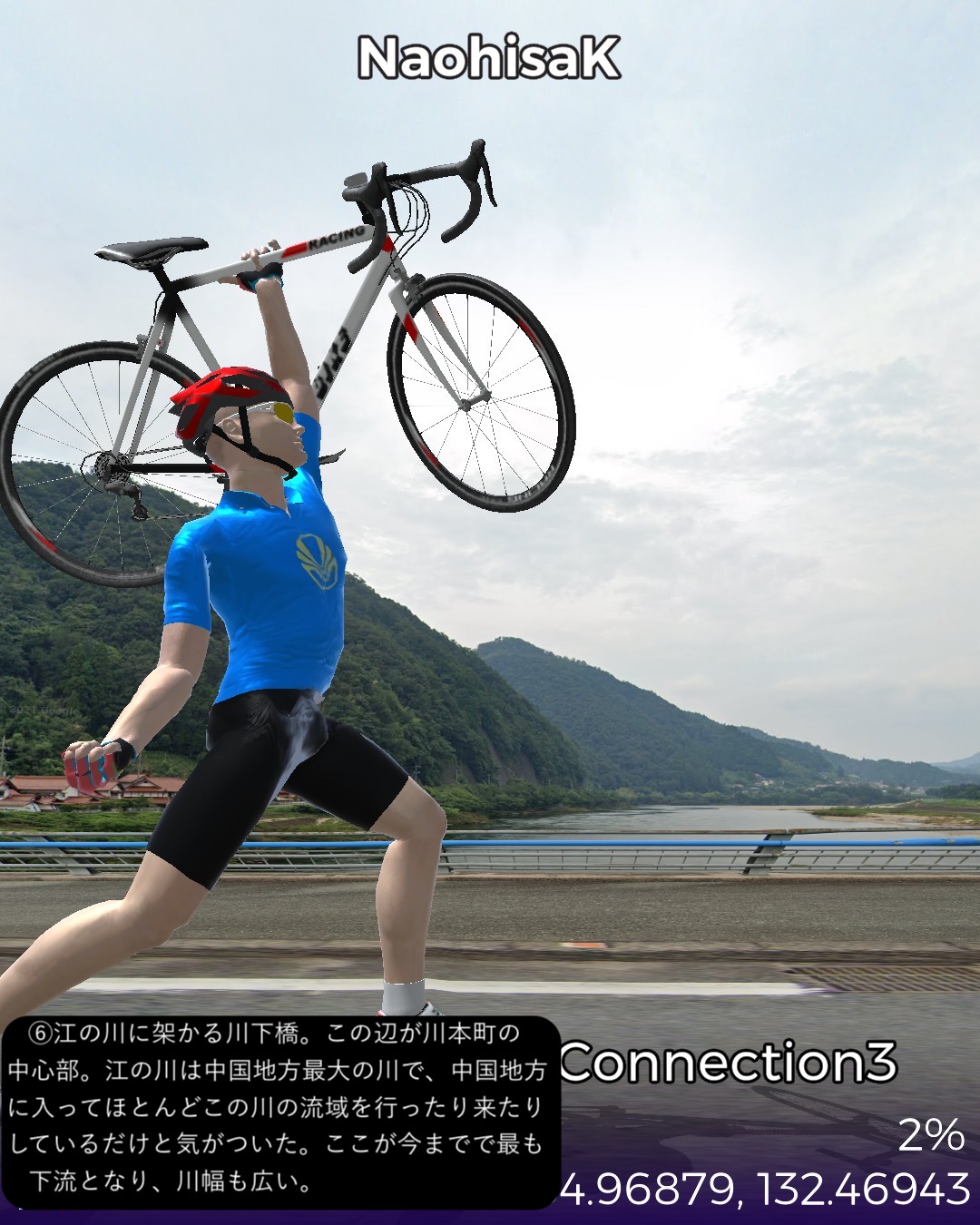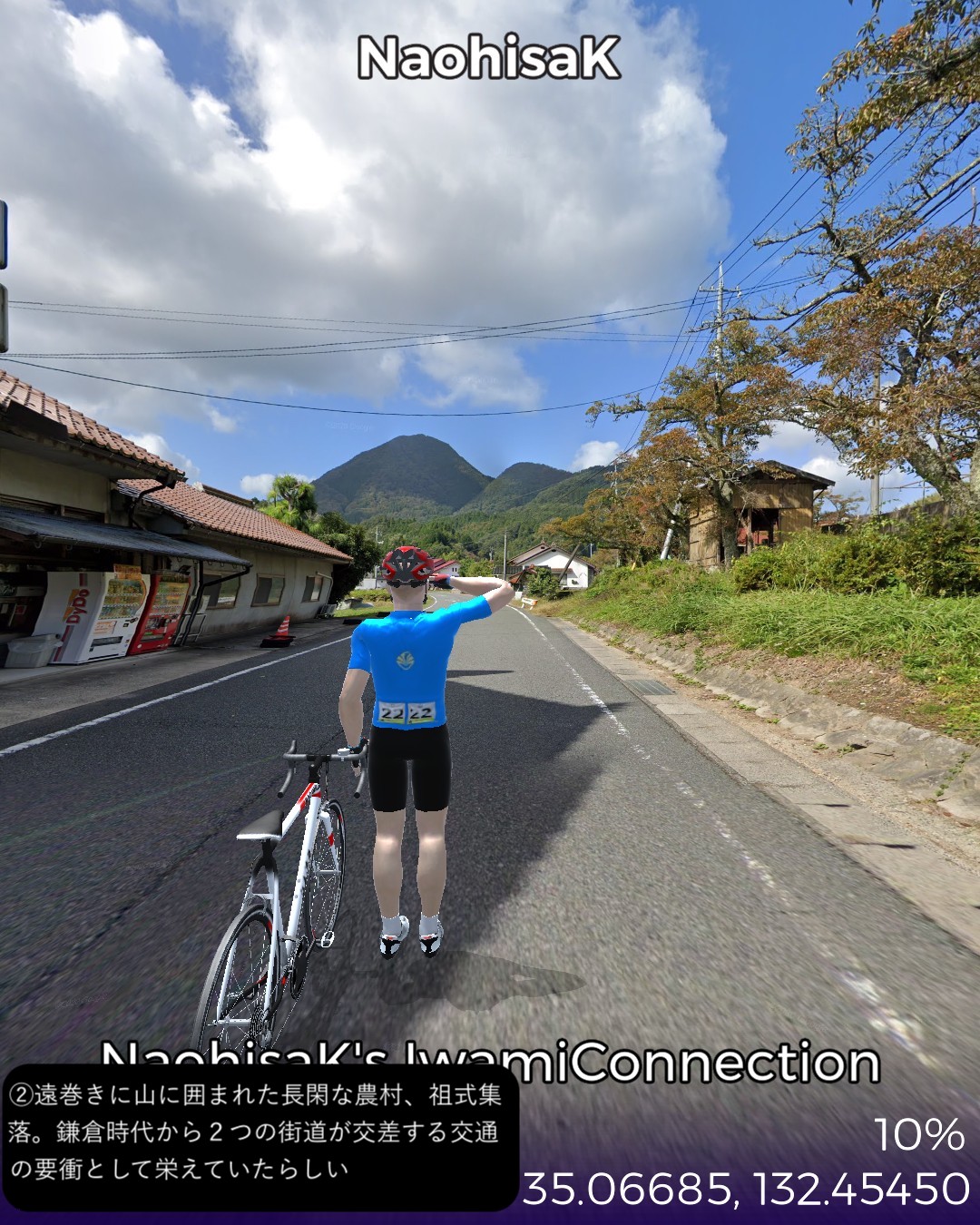 VRサイクリング、石見銀山街道で石見銀山まで到達した後は広島方面へ向かうこととし、山陰の浜田と広島を結ぶ石州街道へ中継する名もなき道を往く。石見銀山から川本町、邑南町を通り石州街道の宿場町市木宿まで49kmの行程。島根県、石見地方の山間部をウロウロするので石見コネクションとルートを命名してみた。ルート全般に緑溢れる丘陵地帯にオレンジ色の石州瓦の屋根の家々が点在する欧州の田舎のような風景が美しい。険しい山道は少なかったが、その中で魚の遡上も阻止するというところから断魚渓という名の渓谷を通った。千畳敷の河原に奇岩の絶壁が続くなかなかの景勝地であった。石見銀山もそうだが、日本でもマイナーでアクセスの悪いワーストに入りそうな島根県の山奥なので観光資源が知られておらず過小評価されているような気がする。