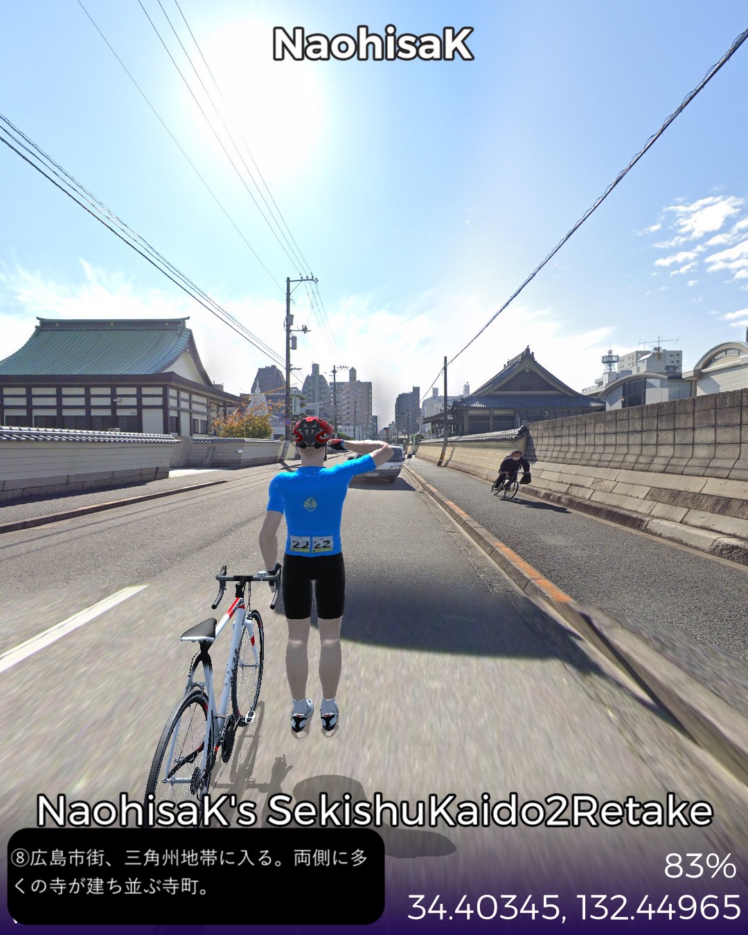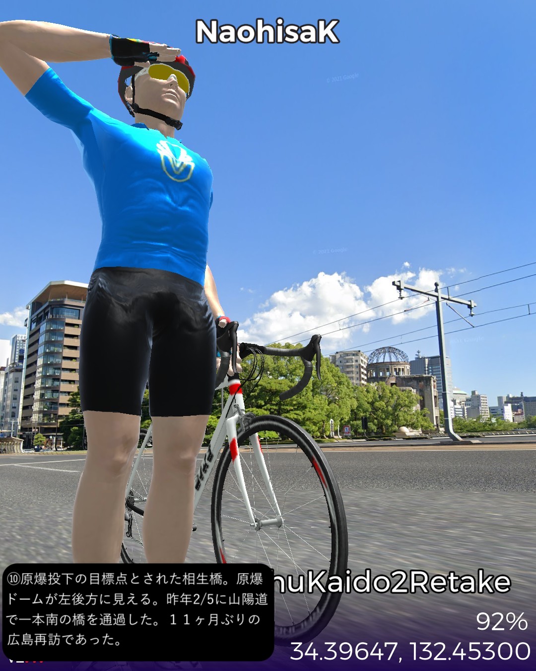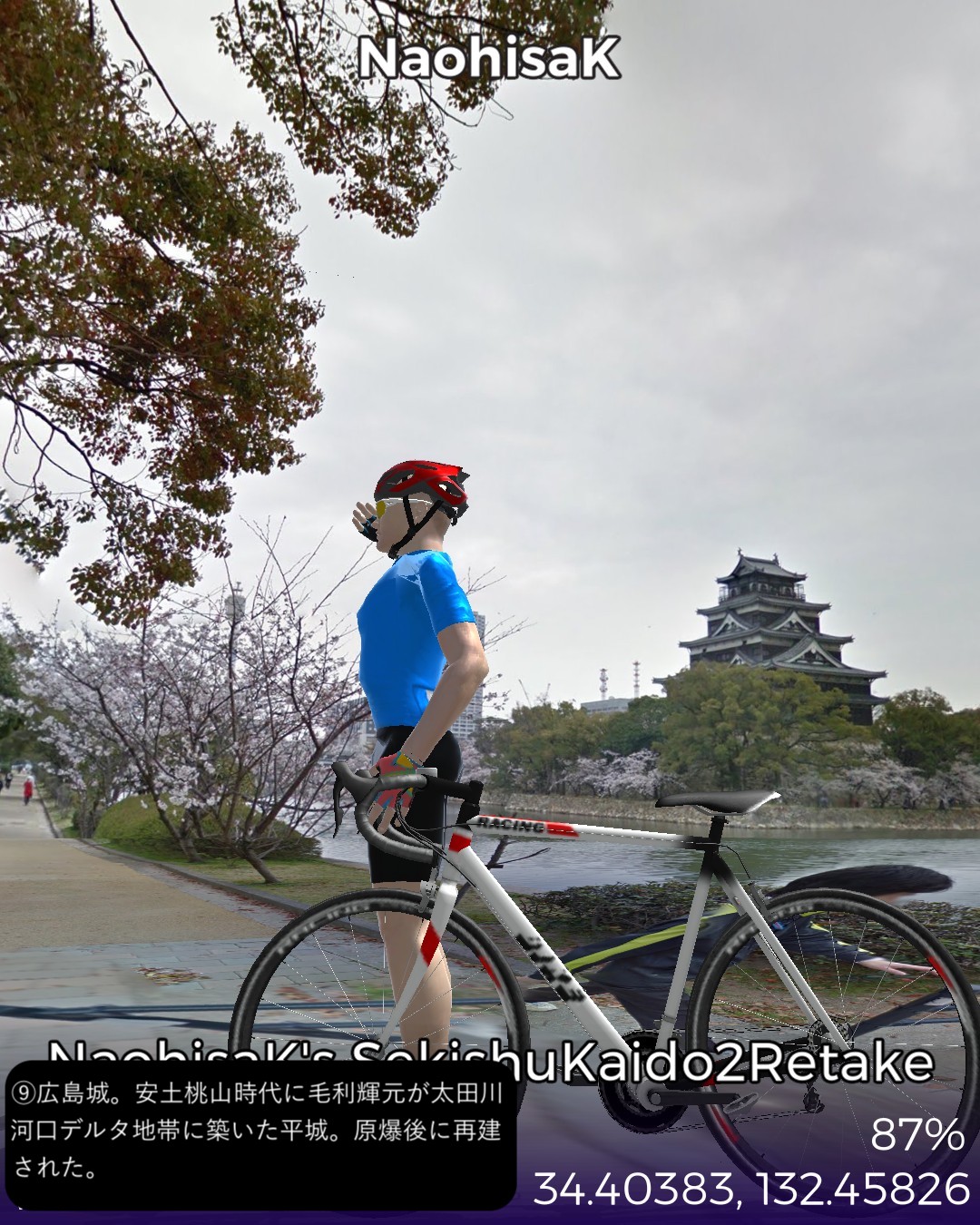 VRサイクリング、今年の走り初めは石州街道2日目。北広島町に位置する本地宿をスタートして中国山地の南端を越えて広島平野に下り広島のベッドタウン可部宿を過ぎて広島市街を延々と走り、街道の終点、山陽道堺町の追分を越えて太田川河口デルタ地帯の先端に近い舟入南までの51kmの行程。旧道は本地宿から可部宿へは名水の産地、可部峠を越えるが例によってストリートビューが無いのでぐるっと迂回路を通って可部宿へ至る。可部宿もいい感じの古い家並が見られる街道筋らしい宿場町であったが、一方でJR可部線が通り広島のベッドタウンとしても機能しているようだ。可部宿からは太田川沿いに広域に渡る広島市街を南下していく。広島市街中心部でちょっと街道から外れて広島城に寄り道。気がつくと城があるところは必ず城を見に行っているな。ついでに原爆ドームの見える爆心地も通る。昨年2月5日に山陽道で原爆ドームの南側を通ったが今回は北側。11ヶ月ぶりの広島再訪となった。前回は広島市街を東から西へ抜けたが今回は北から南に抜けた。次回は進路を西に転じるが当然前回の山陽道を通るつもりはない。
