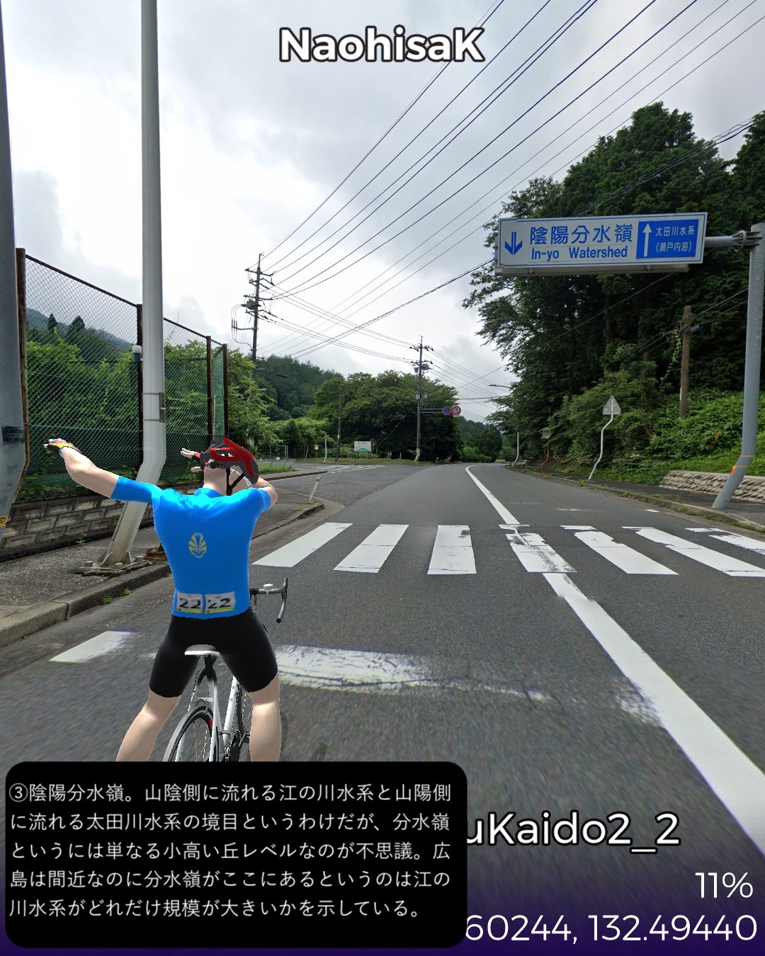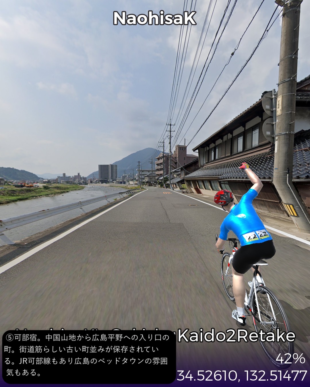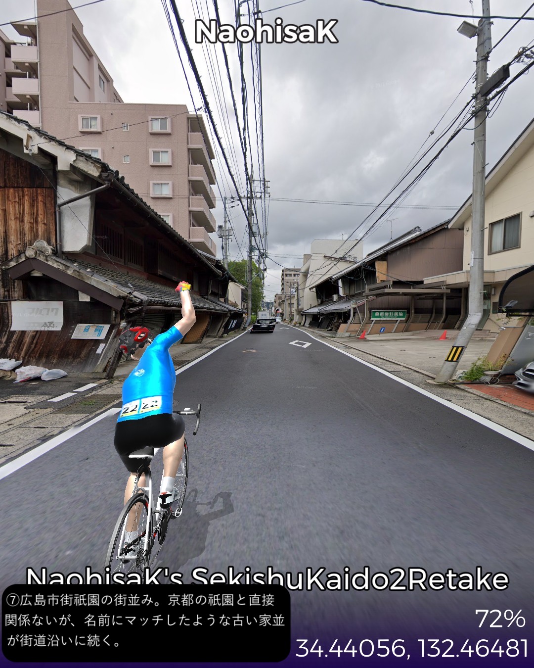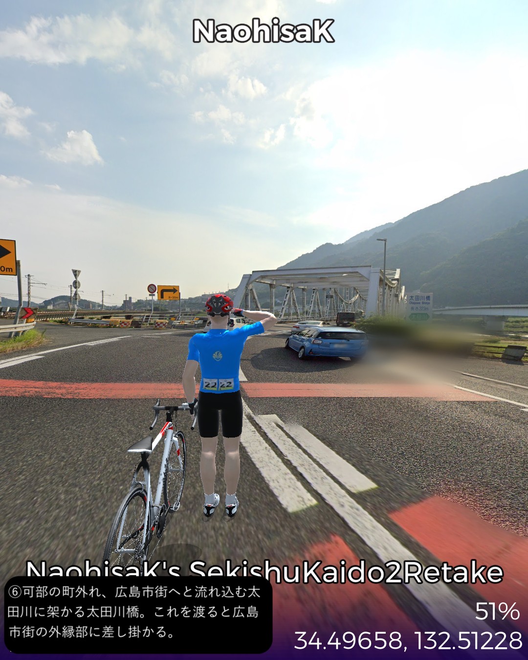 VRサイクリング、今年の走り初めは石州街道2日目。北広島町に位置する本地宿をスタートして中国山地の南端を越えて広島平野に下り広島のベッドタウン可部宿を過ぎて広島市街を延々と走り、街道の終点、山陽道堺町の追分を越えて太田川河口デルタ地帯の先端に近い舟入南までの51kmの行程。旧道は本地宿から可部宿へは名水の産地、可部峠を越えるが例によってストリートビューが無いのでぐるっと迂回路を通って可部宿へ至る。可部宿もいい感じの古い家並が見られる街道筋らしい宿場町であったが、一方でJR可部線が通り広島のベッドタウンとしても機能しているようだ。可部宿からは太田川沿いに広域に渡る広島市街を南下していく。広島市街中心部でちょっと街道から外れて広島城に寄り道。気がつくと城があるところは必ず城を見に行っているな。ついでに原爆ドームの見える爆心地も通る。昨年2月5日に山陽道で原爆ドームの南側を通ったが今回は北側。11ヶ月ぶりの広島再訪となった。前回は広島市街を東から西へ抜けたが今回は北から南に抜けた。次回は進路を西に転じるが当然前回の山陽道を通るつもりはない。