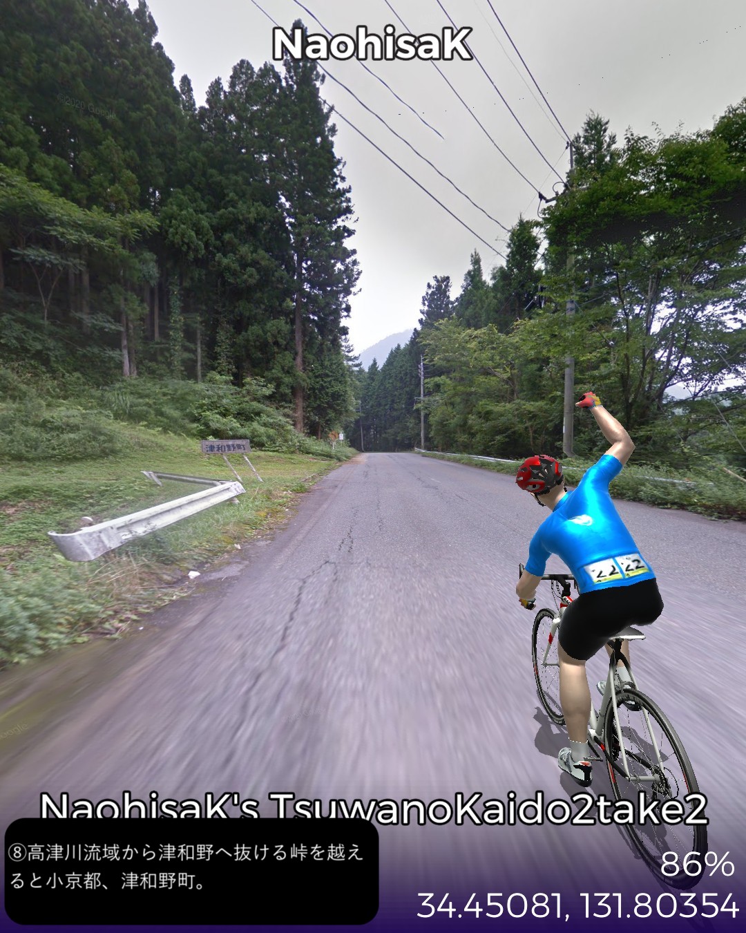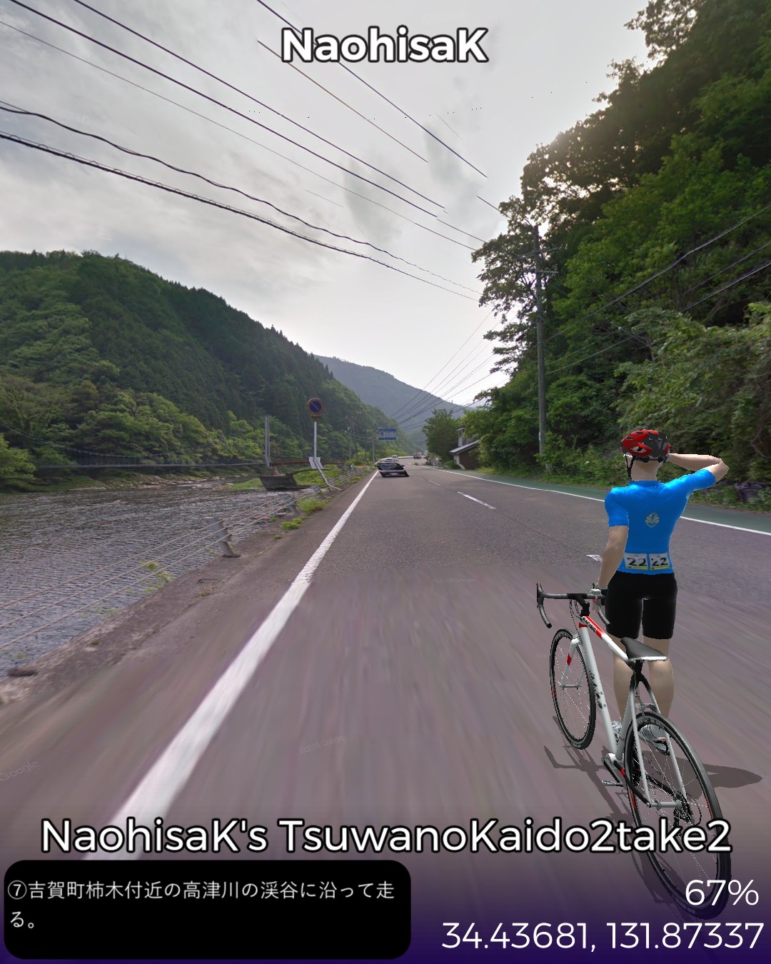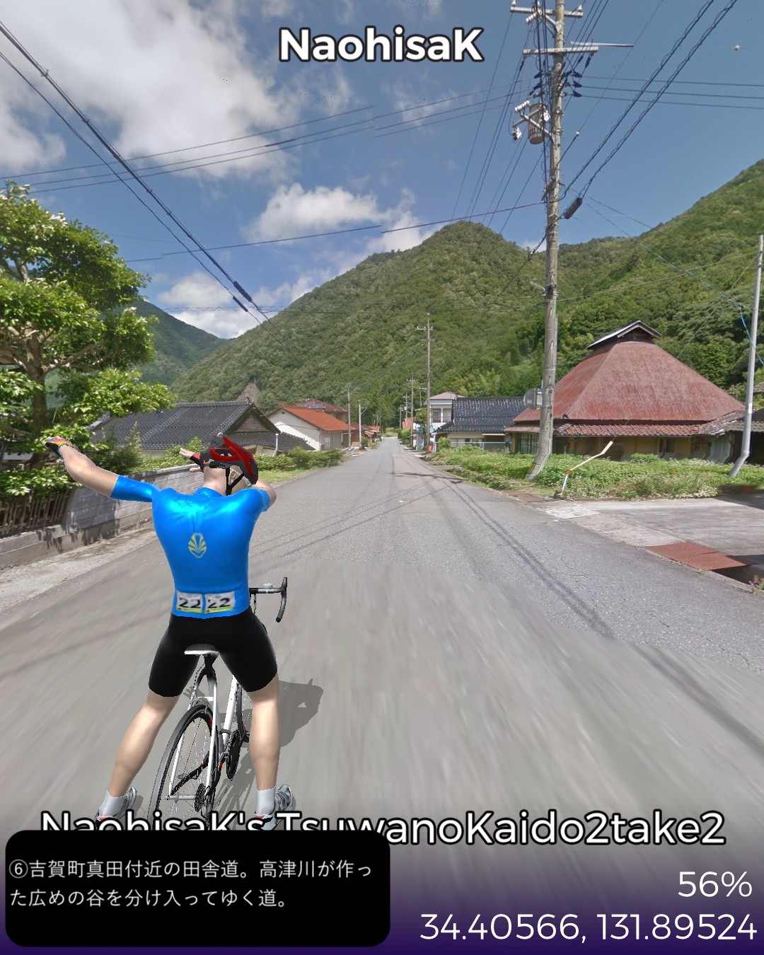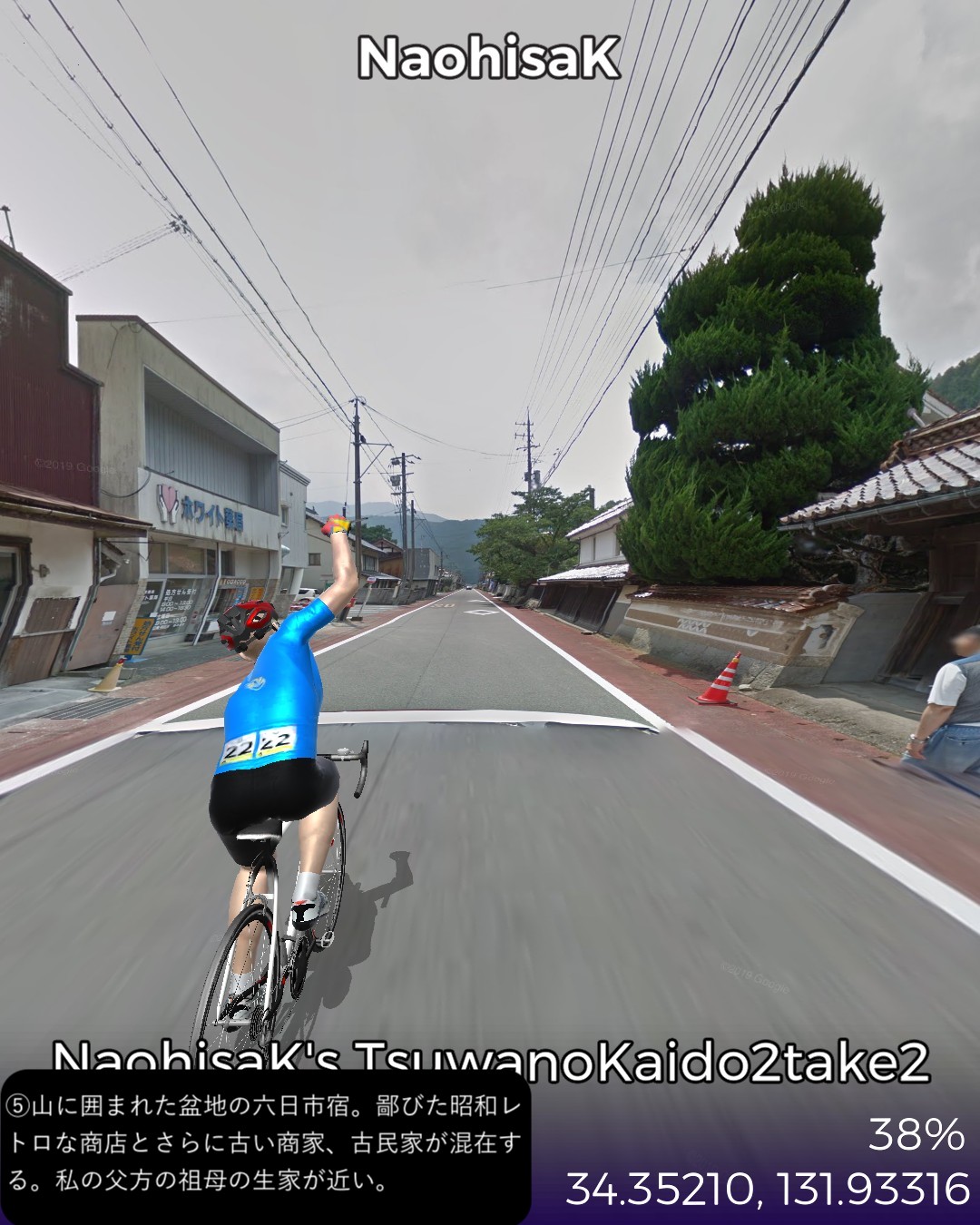 VRサイクリング、津和野街道2日目。山間の小さな集落と化したかつての大原宿をスタートし分水嶺を超えて島根県に入り六日市宿を経て、日本一の清流に選ばれた一級河川、高津川渓谷に沿って山間に分け入り峠を超えて小京都津和野の太鼓稲成神社をゴールとする56kmの行程。途中六日市ではちょっと街道を逸れて町外れの私の父方の祖母の生家まで行ってみた。祖母については島根県の山奥から逃げてきた家出娘で昨年8/7に通過した北里村から家出してきた祖父と大阪で出会って父が生まれるという凄い一族の成り立ちの話は聞いていたが島根のどこか聞かされていなかった。それが一昨年父が亡くなった折に戦前の戸籍謄本まで調べると祖母の出生地が記されていて、現在の地名と照し合わせて六日市村の外れであることが判明したのだ。ストリートビューでその番地の映像を見てみると点在する集落の中の一軒家があった。ひょっとしたら祖母の家系の末裔がそこにまだ住んでいるかもしれない。祖父の出生地も山に囲まれた集落であったが、祖母の生家も同様に山に囲まれた土地であった。感慨を胸に旅を続ける。津和野は若い頃に訪れたがどこを回ったか覚えがない。ただこんな感じだったという漠といた記憶は蘇ってきた。さて津和野街道の終点津和野に到達した後は特に街道はないが萩へ向かってみようと思う。