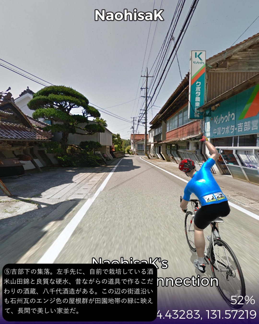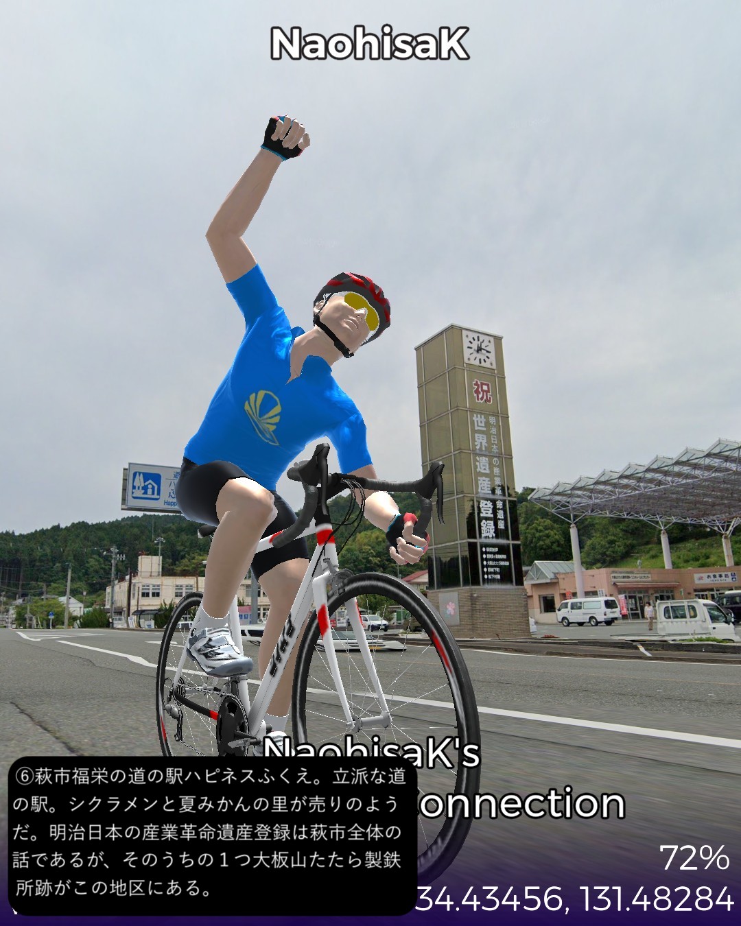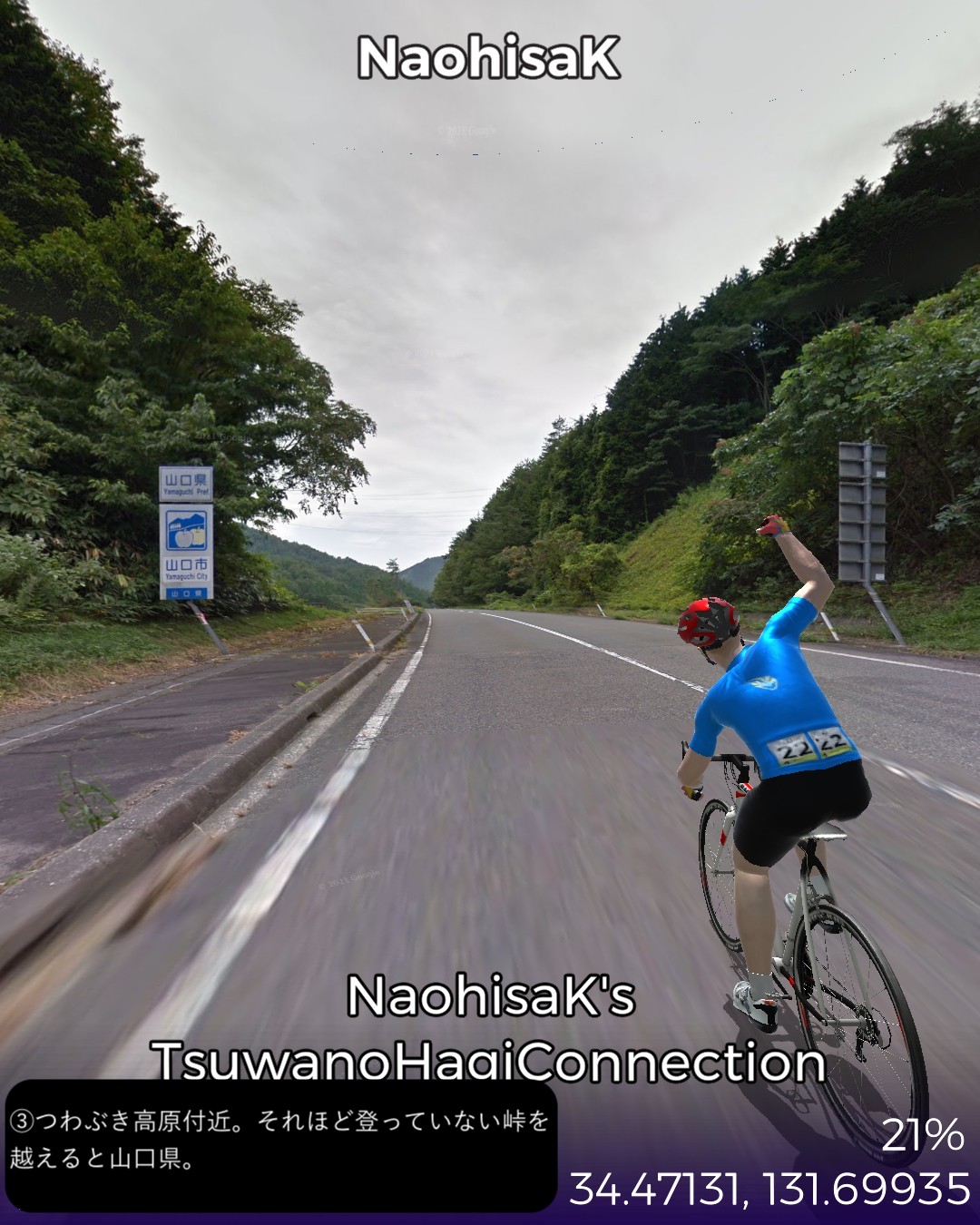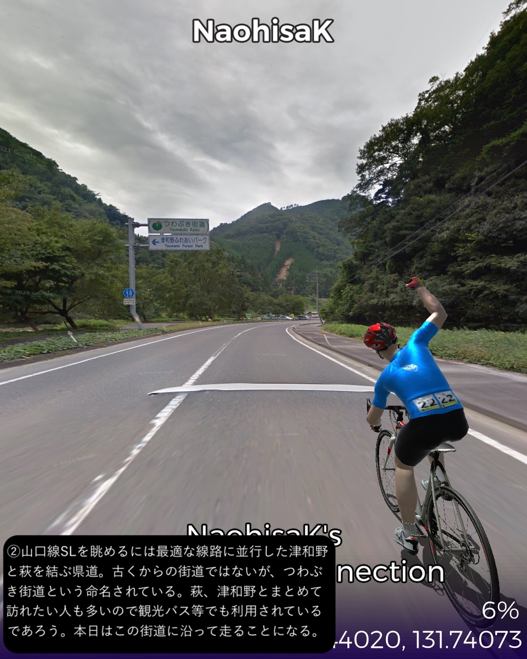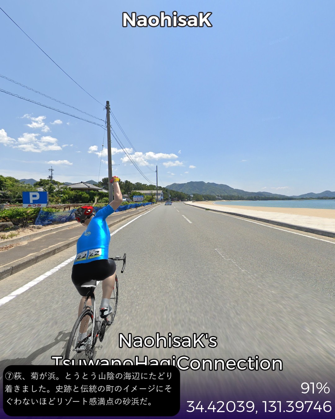 VRサイクリング、小京都界の大関、津和野から横綱、萩へ抜ける通称つわぶき街道を走る。多分昔からの街道ではない県道であるが、この2つの町をまとめて訪れるツアーでは必ず通るであろう道と思われる。津和野から山里を抜けて最後に萩市街をざっと一巡りする53kmの行程。メジャーな2つの観光地を結ぶルートとしては地味ではあるが、途中、なだらかな山地にたたずむ山里がなかなか味わい深い。石見地方で多く見かけた石州瓦のエンジ色の家並が、日本の典型的な箱庭的風土の中ちょっと南欧風のエッセンスが感じられて見飽きない。萩はリアルには訪れたことのない長年の憧れの町だったが、独特の風格のある歴史的街並みや一方でリゾート地のような美しい海岸に魅了される。ここはやはり日本でも行きたい町ベスト3にはランキングされる魅力的な町だ。次はここを起点、終点として長州の行ってみたい場所をぐるっと一巡りする旅に出る。