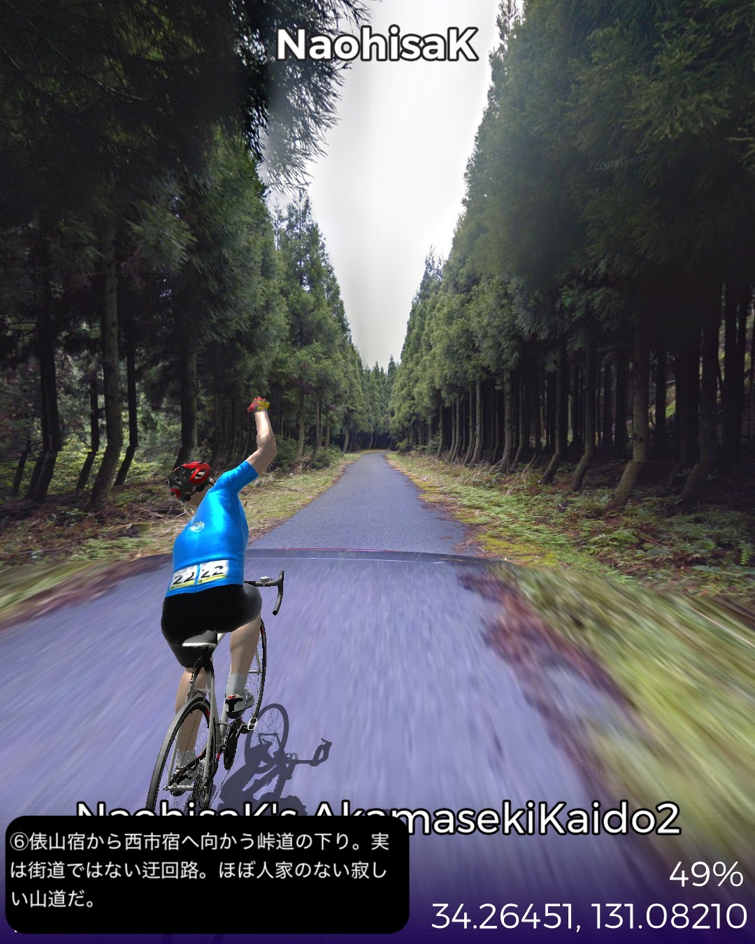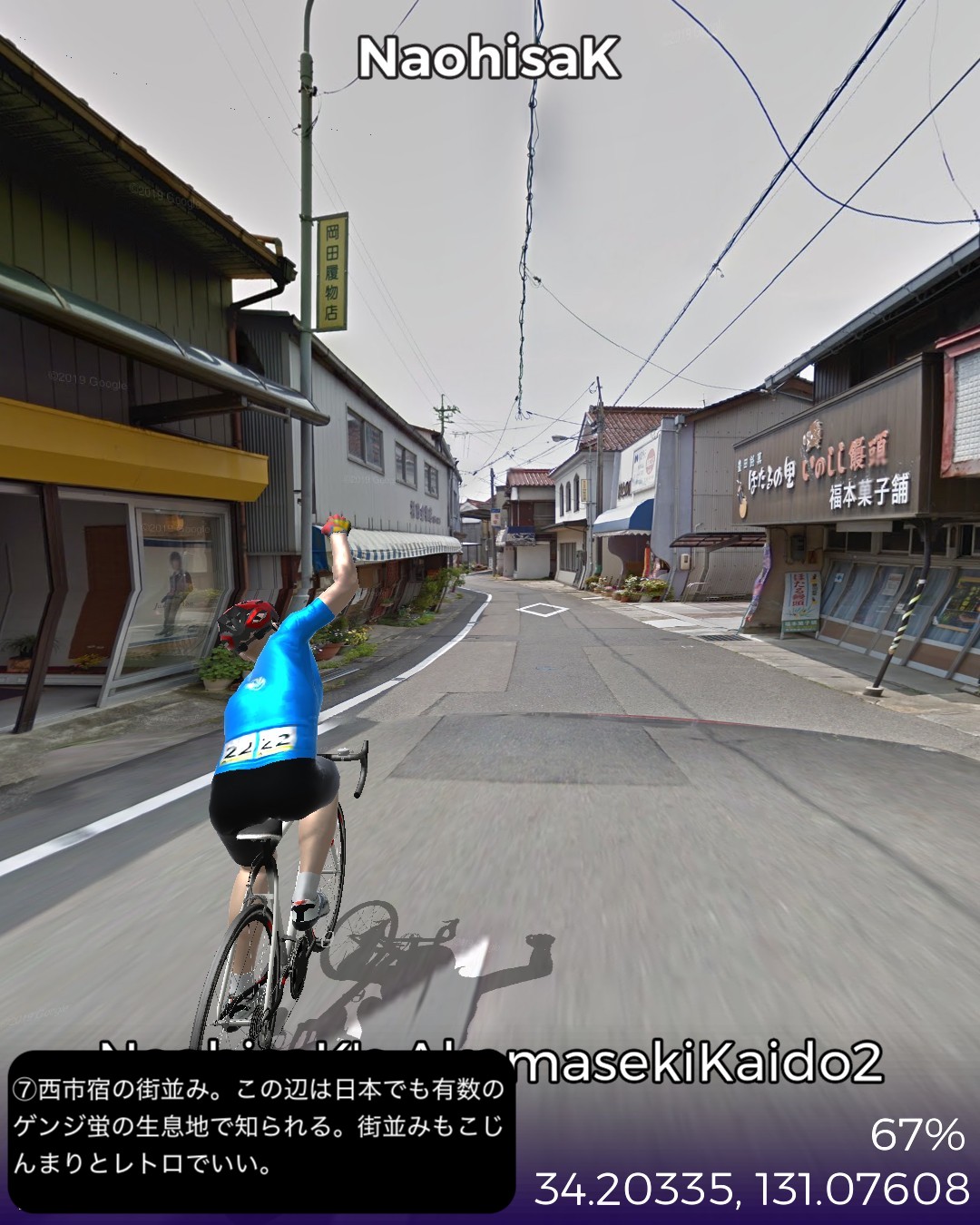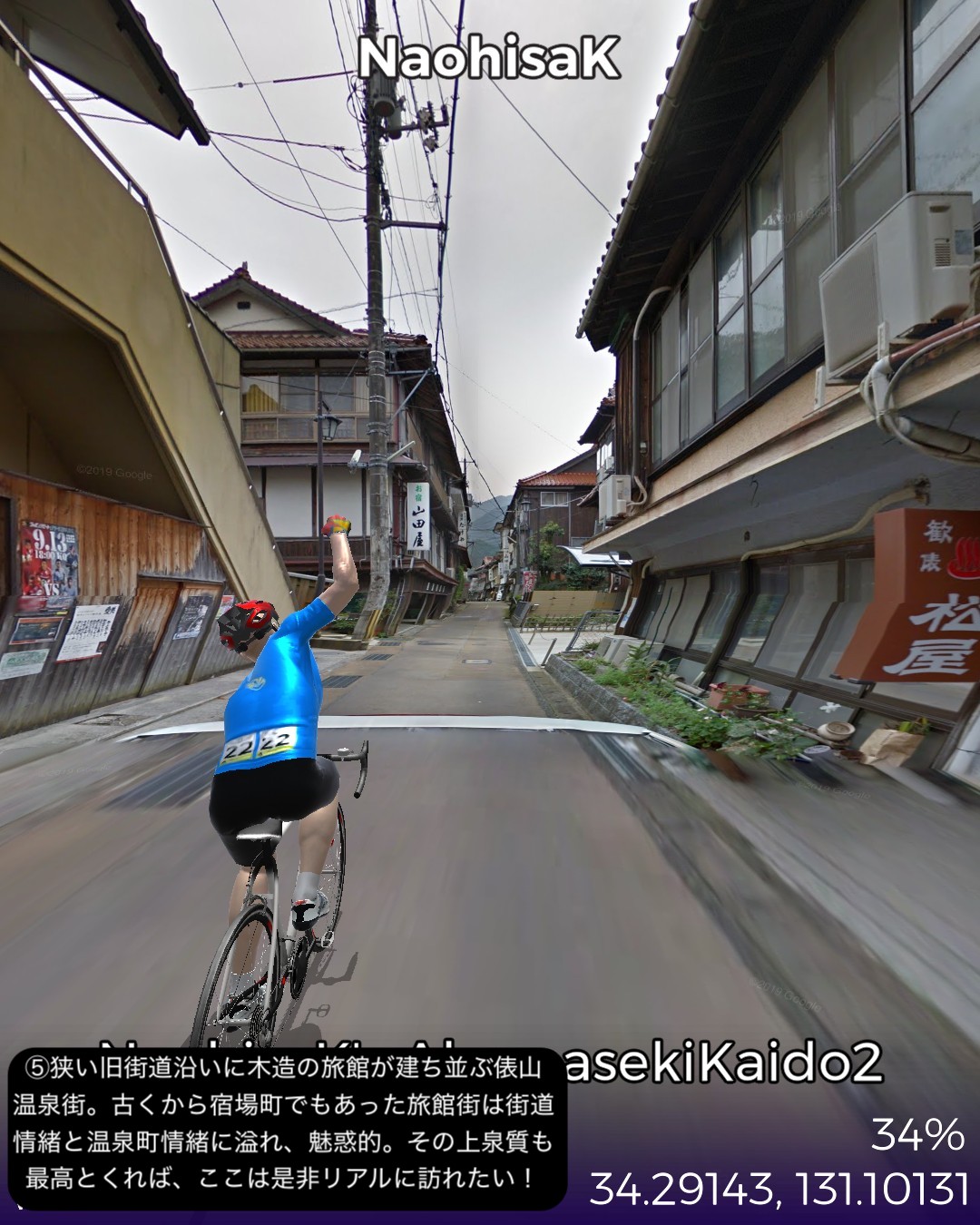 VRサイクリング、赤間関街道2日目。前回は北浦道筋を走ったが今回は北道筋を往く。前回のルートの途中、長門市街の深川を起点に南方の山の中へ進む。北道筋を俵山宿、西市宿まで進み、そこから街道を外れて方角東に転じて国道をひた走り美祢までの46kmの行程。今回のテーマは何といっても山の中のいで湯。北道筋沿いに2つの素晴らしい温泉地があった。長門市街にほど近い場所には大きな温泉地、長門湯本温泉。渓流沿いに比較的大型の旅館が建ち並び、The温泉という情緒を醸している。一時期寂れかけたが、イベントを充実させ設備もリニューアルして復興してきたらしい。ロシアのプーチン大統領が宿泊したり、星野リゾートが進出したりの話題もある。そこから一山超えた谷間に俵山温泉がある。ここは全く知らなかったが、さらに素晴らしい温泉地であった。山間の小さな町。狭い旧街道の両側に古い木造の小さな旅館が建ち並び、タイムスリップしたかのようなレトロで素朴な温泉街の雰囲気が漂っている。北道筋の宿場町としての雰囲気も感じられる。調べると小さい温泉地ながら1100年の歴史を誇り古くから毛利家御用達。泉質が強めのアルカリ性で水素に富み効能は西日本の横綱級というから驚く。近くに鉄道も高速道路もなく交通不便な場所だがその秘境っぽさもいい。思いがけず素晴らしい場所を発見した。ここは是非リアルにも訪れたいものだ。さて次回は美祢から秋吉台を通って萩へ戻る。