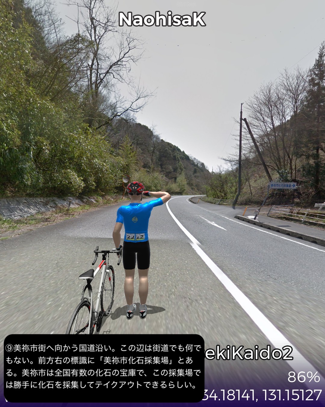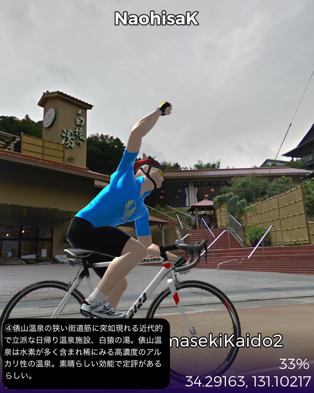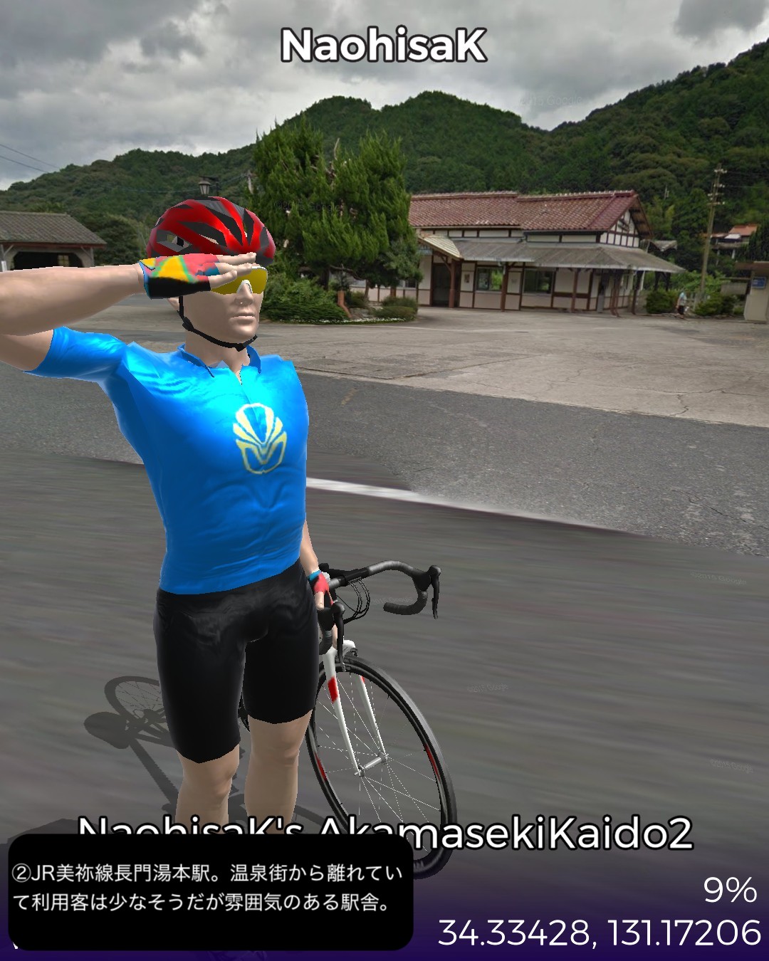 VRサイクリング、赤間関街道2日目。前回は北浦道筋を走ったが今回は北道筋を往く。前回のルートの途中、長門市街の深川を起点に南方の山の中へ進む。北道筋を俵山宿、西市宿まで進み、そこから街道を外れて方角東に転じて国道をひた走り美祢までの46kmの行程。今回のテーマは何といっても山の中のいで湯。北道筋沿いに2つの素晴らしい温泉地があった。長門市街にほど近い場所には大きな温泉地、長門湯本温泉。渓流沿いに比較的大型の旅館が建ち並び、The温泉という情緒を醸している。一時期寂れかけたが、イベントを充実させ設備もリニューアルして復興してきたらしい。ロシアのプーチン大統領が宿泊したり、星野リゾートが進出したりの話題もある。そこから一山超えた谷間に俵山温泉がある。ここは全く知らなかったが、さらに素晴らしい温泉地であった。山間の小さな町。狭い旧街道の両側に古い木造の小さな旅館が建ち並び、タイムスリップしたかのようなレトロで素朴な温泉街の雰囲気が漂っている。北道筋の宿場町としての雰囲気も感じられる。調べると小さい温泉地ながら1100年の歴史を誇り古くから毛利家御用達。泉質が強めのアルカリ性で水素に富み効能は西日本の横綱級というから驚く。近くに鉄道も高速道路もなく交通不便な場所だがその秘境っぽさもいい。思いがけず素晴らしい場所を発見した。ここは是非リアルにも訪れたいものだ。さて次回は美祢から秋吉台を通って萩へ戻る。