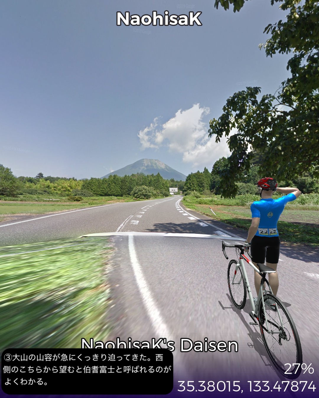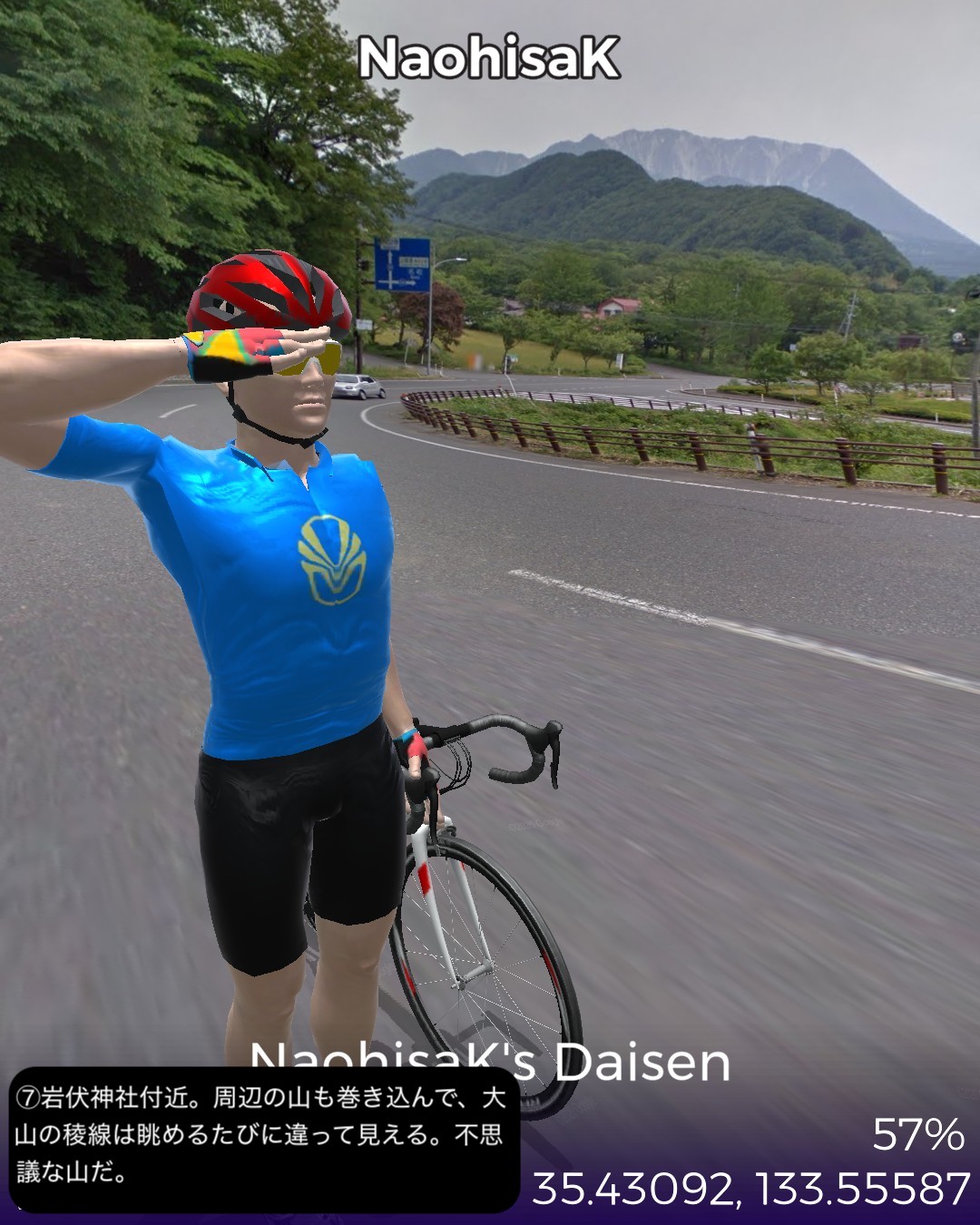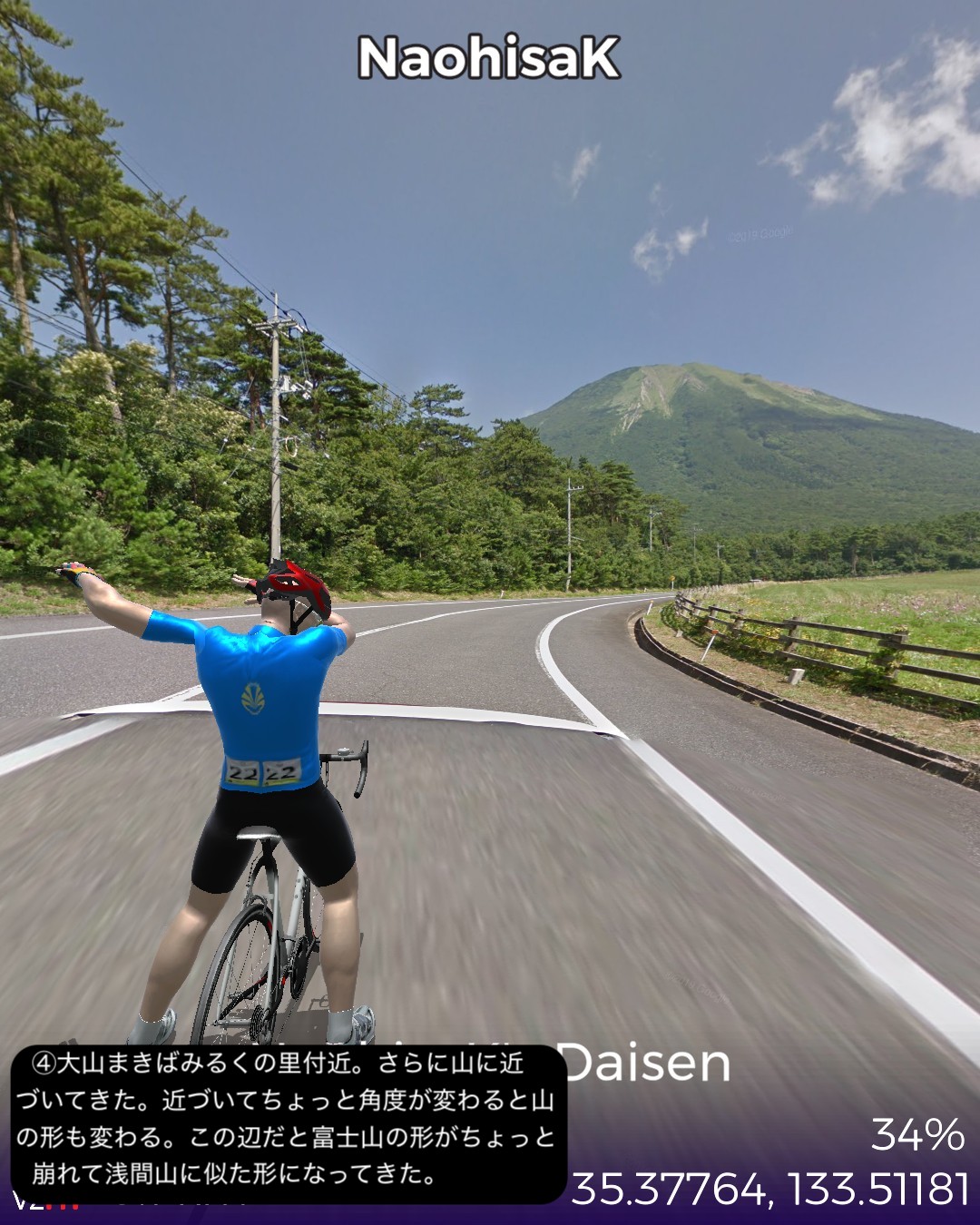VRサイクリング、今回は山陰道を進むのを中断して、大山(だいせん)へちょっと遠足と洒落こんでみた。山陰道が通る日本海沿岸から15kmほど南になだらかな斜面から立ち上がった山塊、標高1729m中国地方の最高峰。日本名峰ランキングベスト3に入る山だが、今までリアルに訪れたことも遠くから眺めたこともなく訪れてみたい場所の一つだった。今回のルートは西側から北側にかけてぐるっと山腹を一巡りする50kmの行程。行ってみて最も印象的であったのは、西側から眺めると伯耆富士と呼ばれる富士山型の秀麗な独立峰に見えるのが、北側に回ると上高地あたりから眺める穂高連峰のような山が連なった稜線となる。さらに眺める微妙な方向の違いで浅間山のように見えたり、山容が七変化する不思議な山なのだ。またどの見え方でも美しい山だ。名峰ベスト3に入るのも納得できる。西日本最大規模のスキー場もあり、名峰を背に眼下に遠く日本海を眺め渡せるゲレンデを滑降するのはさぞかし爽快であろう。さて次回からはまた山陰道を鳥取方面へ向けて進む。