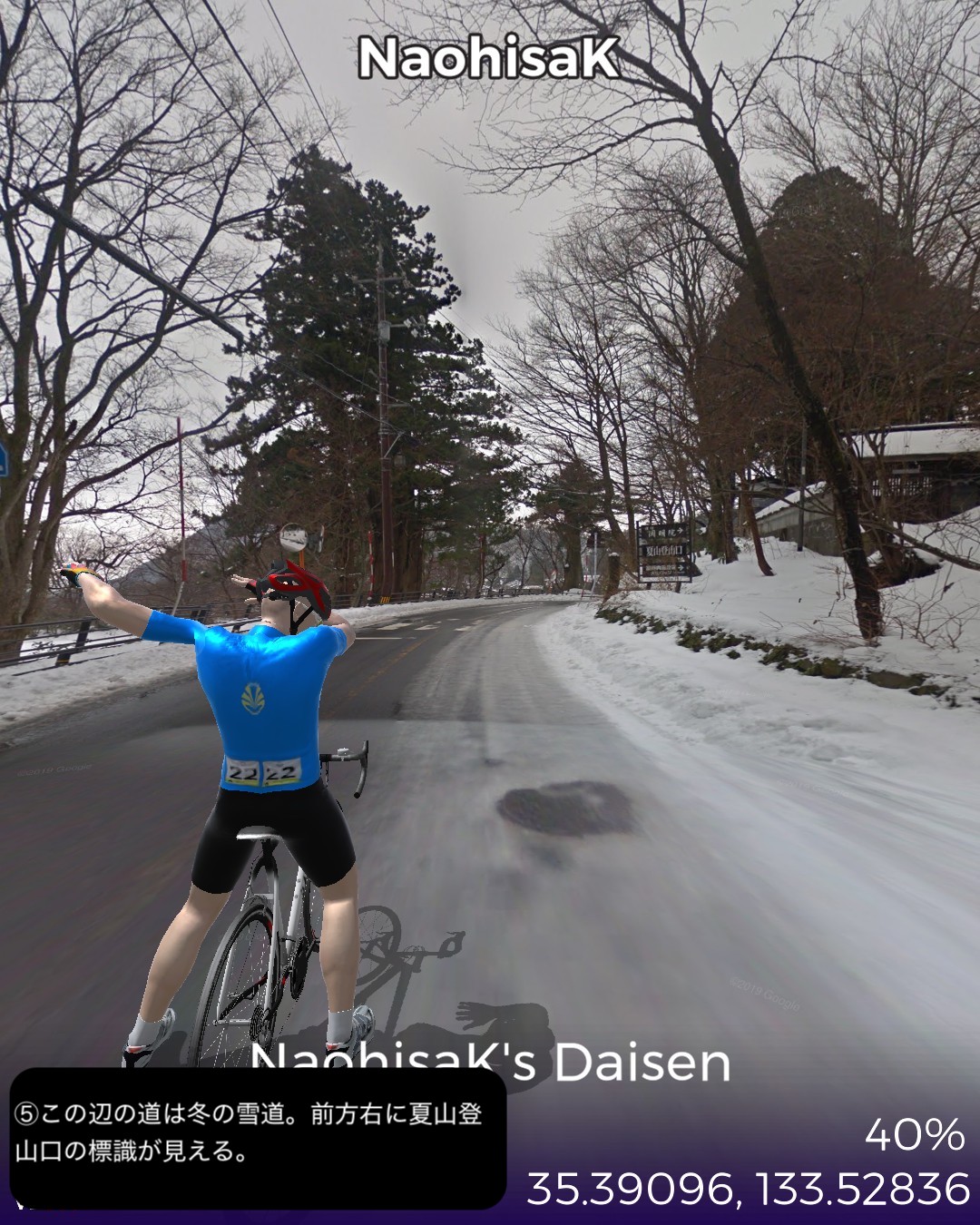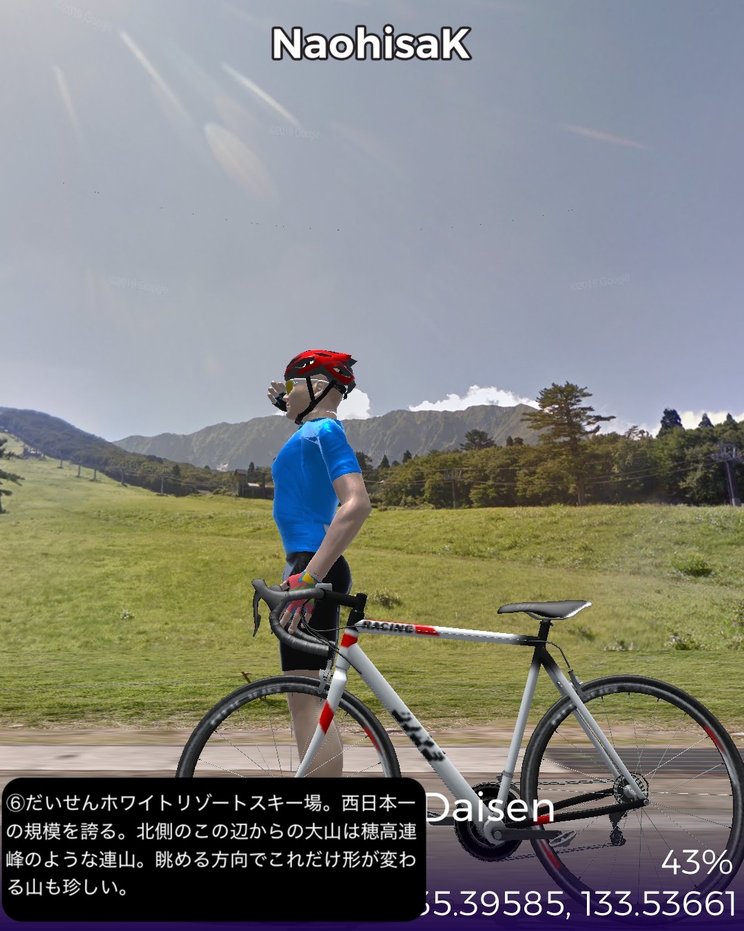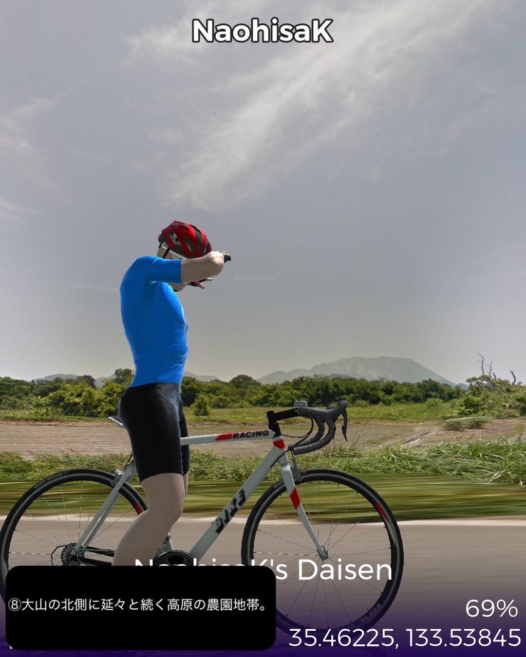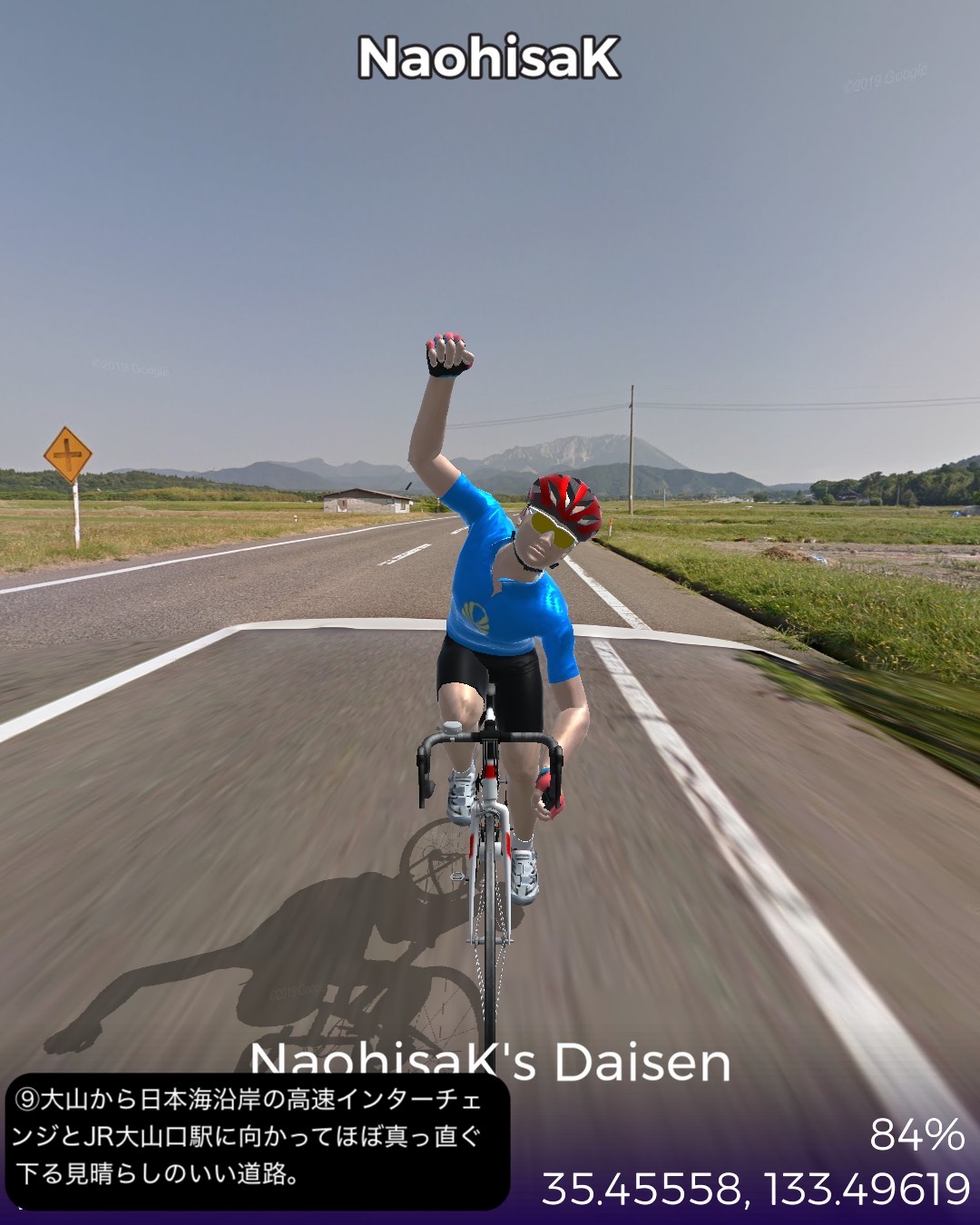 VRサイクリング、今回は山陰道を進むのを中断して、大山(だいせん)へちょっと遠足と洒落こんでみた。山陰道が通る日本海沿岸から15kmほど南になだらかな斜面から立ち上がった山塊、標高1729m中国地方の最高峰。日本名峰ランキングベスト3に入る山だが、今までリアルに訪れたことも遠くから眺めたこともなく訪れてみたい場所の一つだった。今回のルートは西側から北側にかけてぐるっと山腹を一巡りする50kmの行程。行ってみて最も印象的であったのは、西側から眺めると伯耆富士と呼ばれる富士山型の秀麗な独立峰に見えるのが、北側に回ると上高地あたりから眺める穂高連峰のような山が連なった稜線となる。さらに眺める微妙な方向の違いで浅間山のように見えたり、山容が七変化する不思議な山なのだ。またどの見え方でも美しい山だ。名峰ベスト3に入るのも納得できる。西日本最大規模のスキー場もあり、名峰を背に眼下に遠く日本海を眺め渡せるゲレンデを滑降するのはさぞかし爽快であろう。さて次回からはまた山陰道を鳥取方面へ向けて進む。