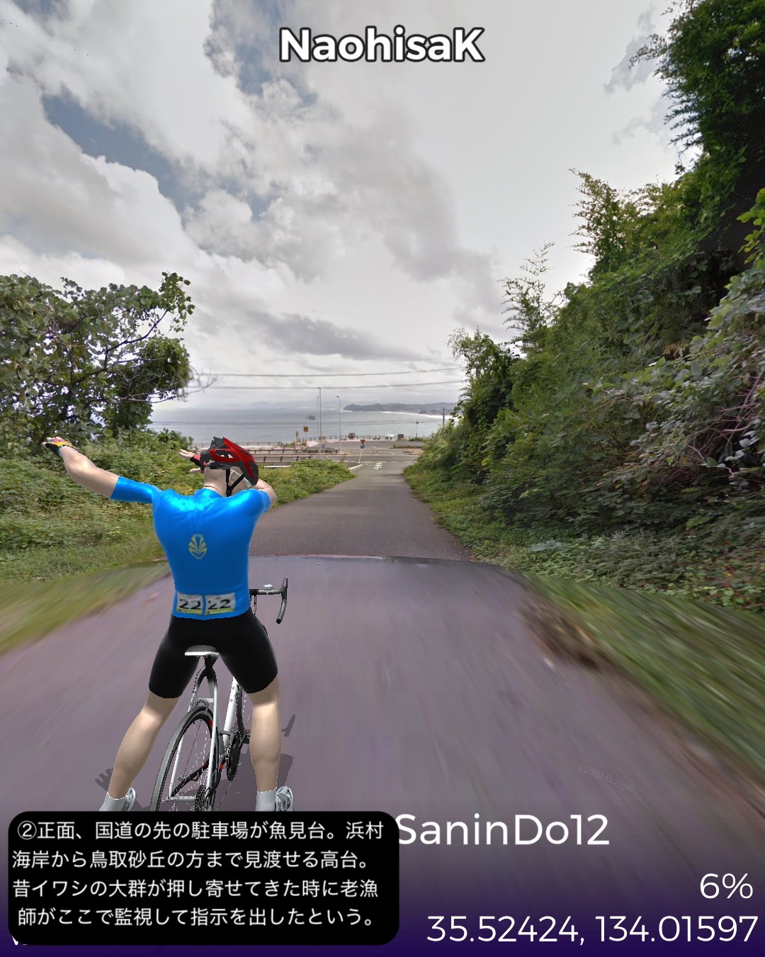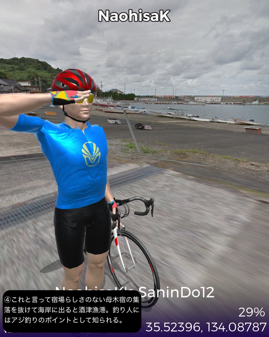 VRサイクリング、山陰道7日目。日本海沿岸の漁村、田儀を出発し、島…
