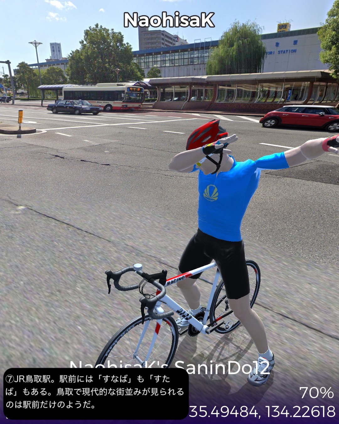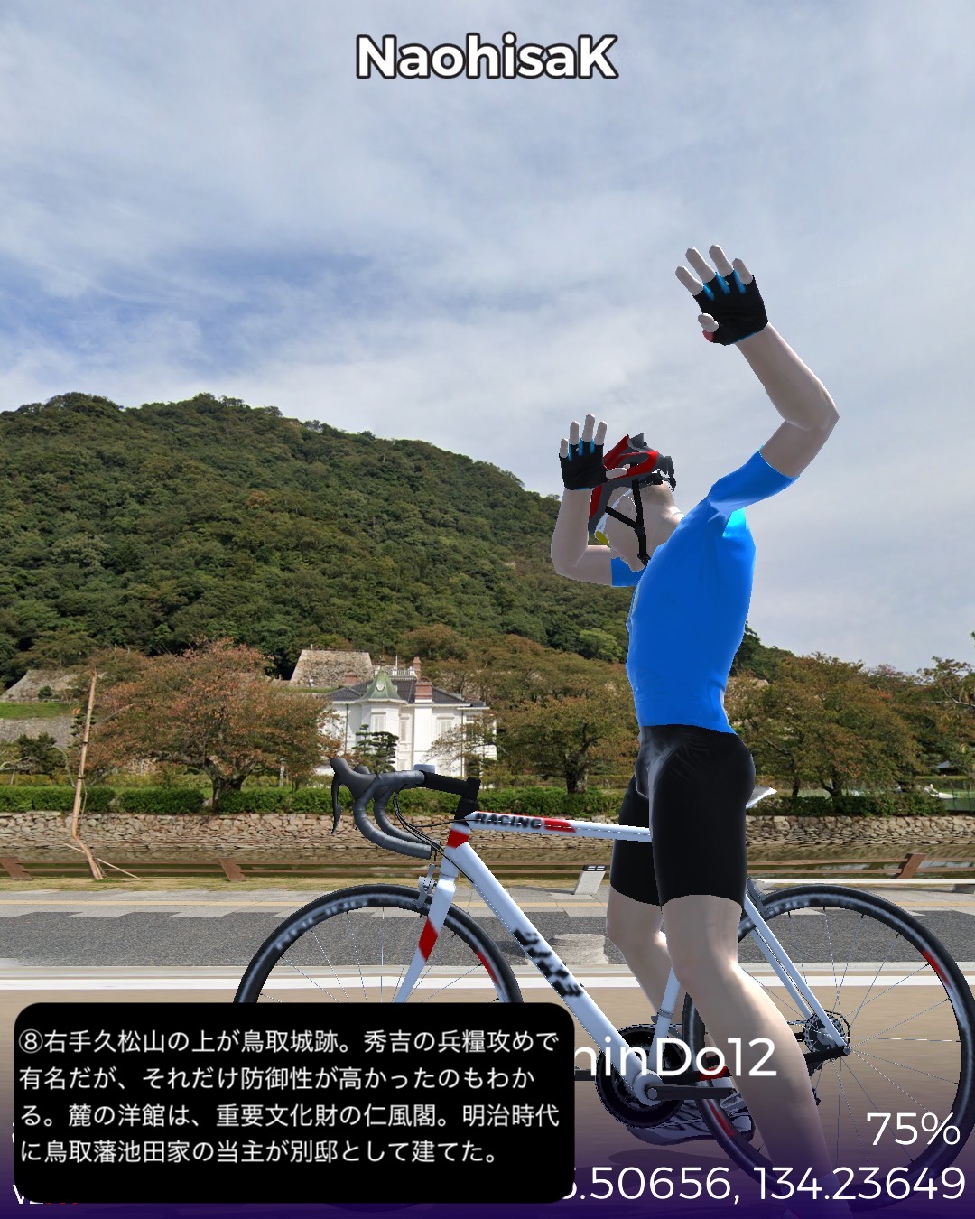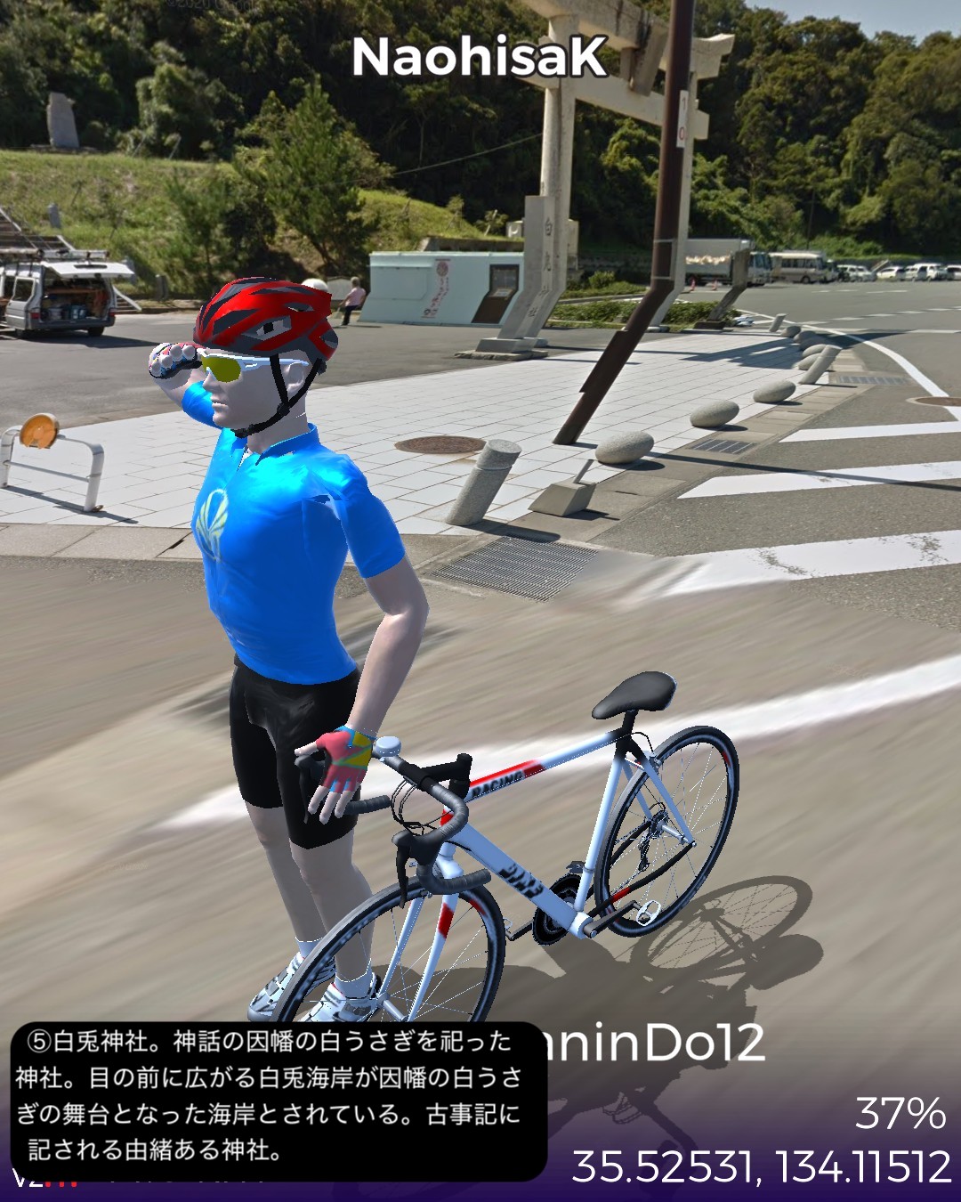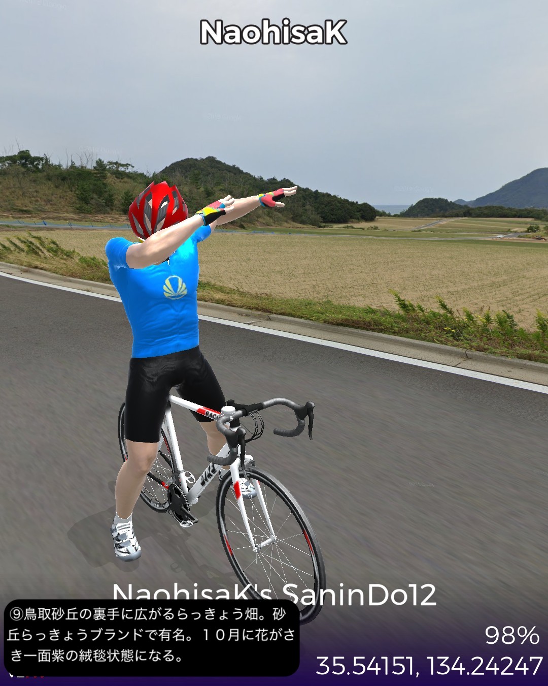 VRサイクリング、山陰道12日目。青谷宿をスタートし、美しい海岸線を愛でつつ、浜村温泉、宿場の名残のない母木宿を通り抜け、因幡の白うさぎの舞台となった白兎海岸と白兎神社を横に見て鳥取市街に入る。鳥取駅、鳥取城をまわりゴールの鳥取砂丘まで進む40kmの行程。鳥取砂丘の茫漠たる景観を一瞥でも致したく砂丘の周辺の道をぐるりと一巡りするルートにしてみたが、砂丘との間の樹木や丘、建物に遮られて存分に広がりのある景色を見出すことはできなかったのは残念。ただ砂丘の南側と東側をぐるっと回ってみたことで砂丘の広さを体感することはできた。今回は鳥取砂丘付近だけでなく前半の青谷海岸から白兎海岸にかけての海岸線も美しく気持ちの良いサイクリングとなった。調べるとこの辺は山陰海岸ジオパークとしてユネスコ登録された世界的な名勝地なのだ。どうやら一番の見所は鳥取砂丘より東側、兵庫県にかけての海岸線となるようだが残念ながら山陰道としては長らく寄り添った山陰海岸と日本海にはおさらばとなる。鳥取砂丘を最後に次回からは山の中へ入ってゆく。