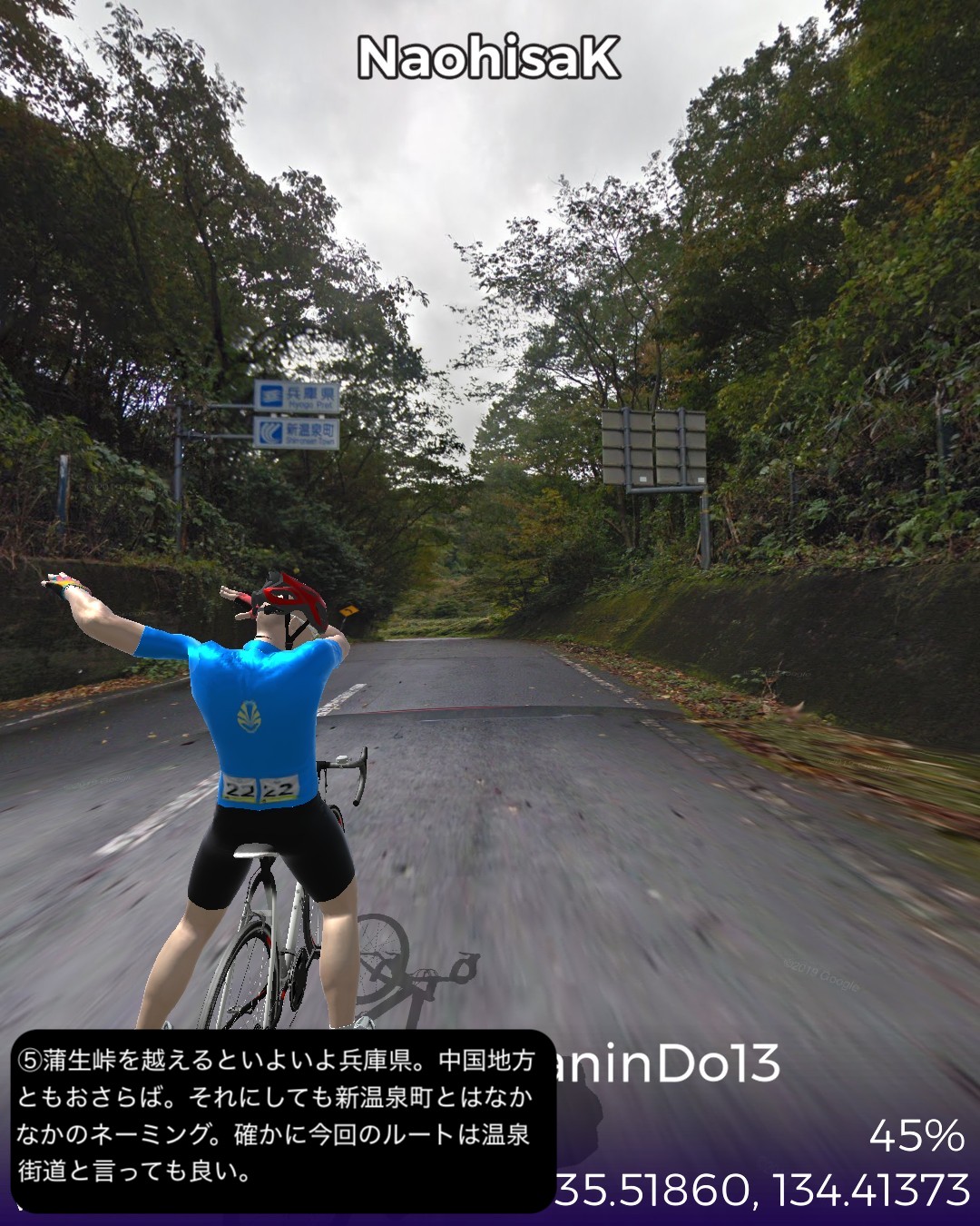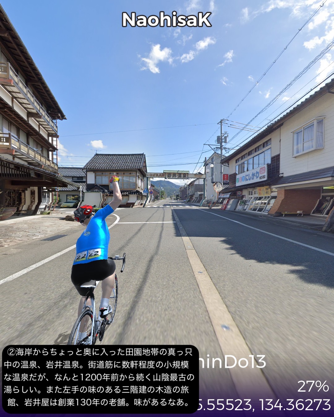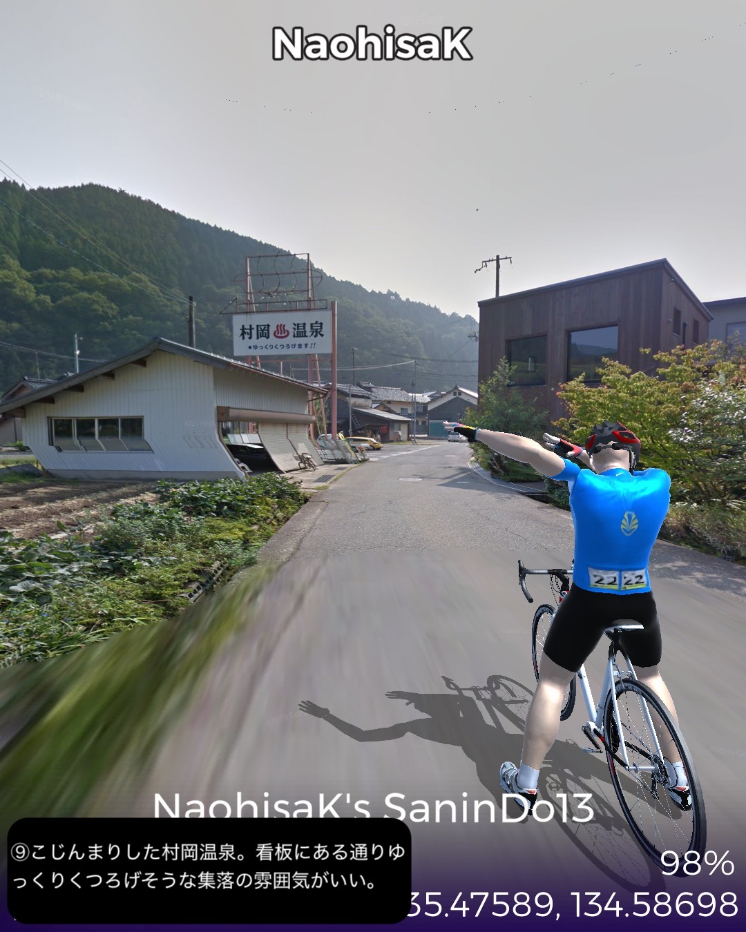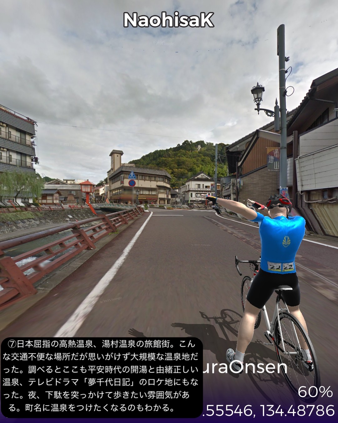 VRサイクリング、山陰道13日目。鳥取砂丘を後に日本海に別れを告げてひたすら山の中へ分け入ってゆく、峠を三つ越えてようやく鳥取宿以来の宿場町、村岡宿へたどり着くまでの54kmの長丁場の行程。前回までの宿場インターバルの短い街道筋が嘘のように宿場がないが、多分その理由は温泉だろう。今回の街道筋に三つも温泉があった。そのうち岩井温泉と湯村温泉は千年以上の歴史を持つ由緒正しい温泉地で、歴史を感じさせる旅館、そぞろ歩きたくなる温泉街がある。公式な宿場町でなくてもこうした温泉で旅人は荷を解いて湯に浸かってプハーと一杯やって旅の疲れを癒したに違いない。今回中国地方から抜けて兵庫県に入った。近畿編の始まりとなる。その最初の町名が新温泉町。そんな名前を付けたところからも、この辺が全国的にも温泉地の宝庫であることが想像される。VRサイクリングでは残念ながらその恩恵を受けられないが温泉地の雰囲気だけでも旅愁が感じられて良い。