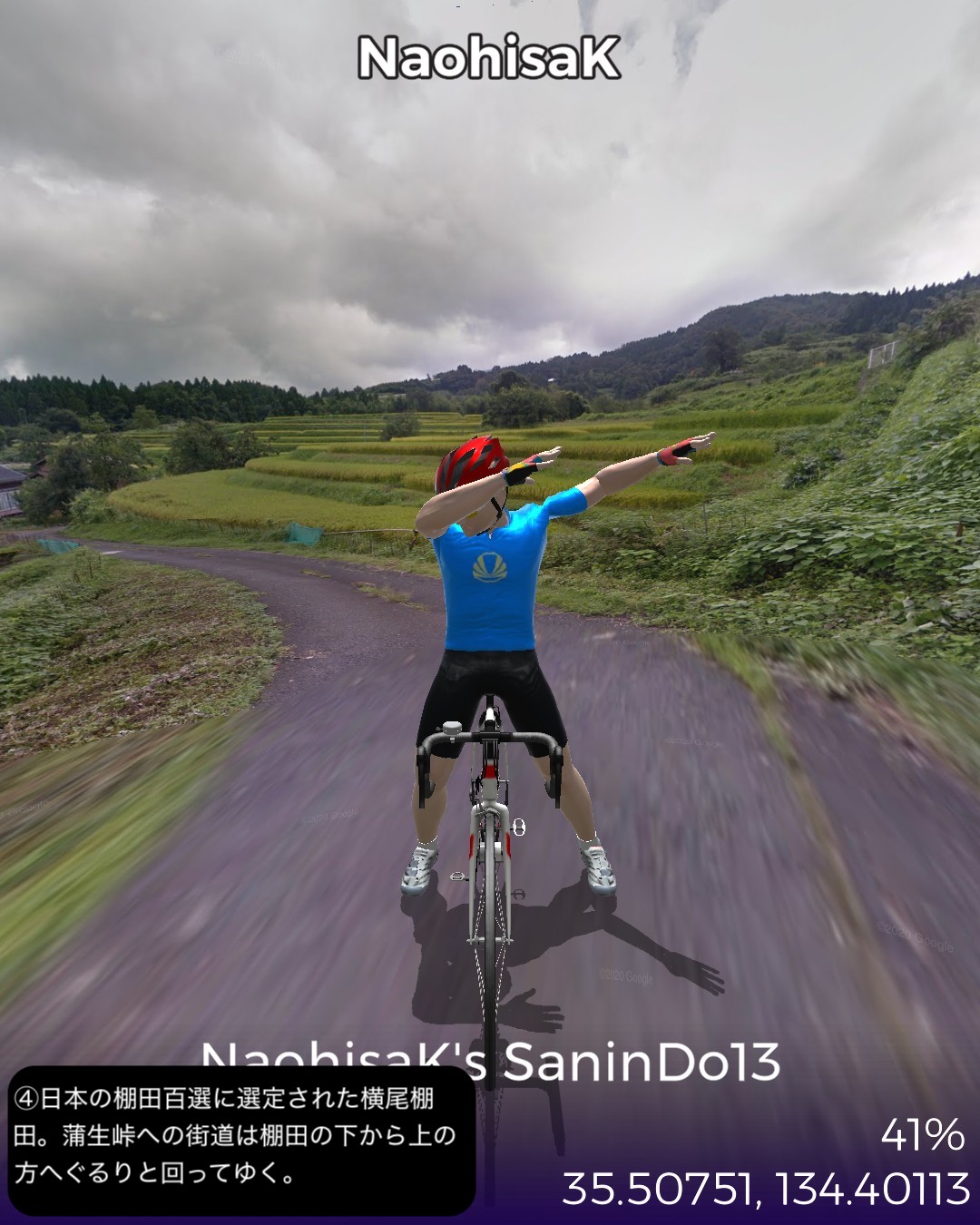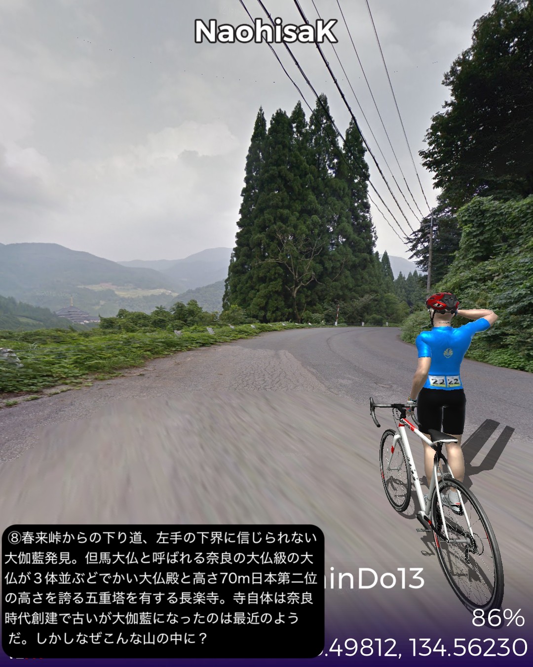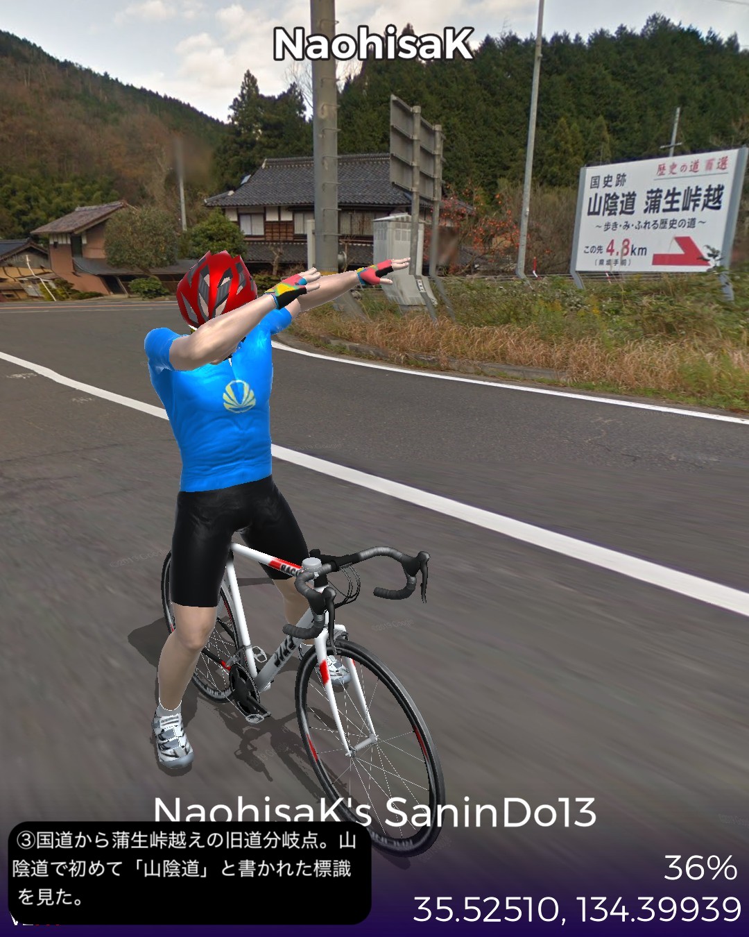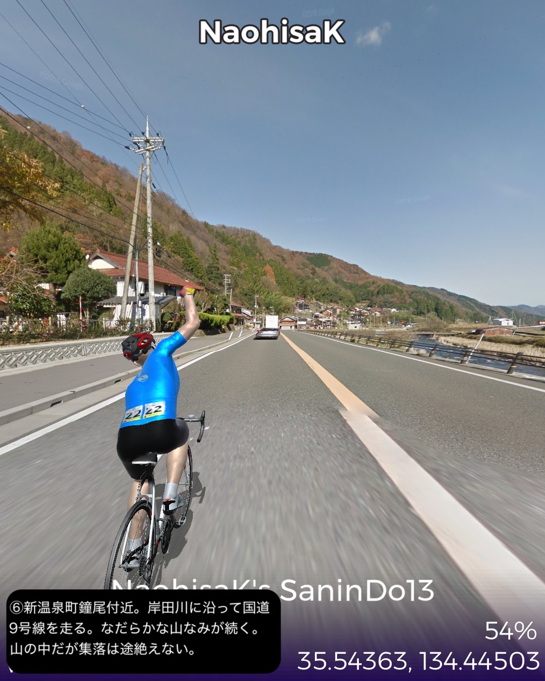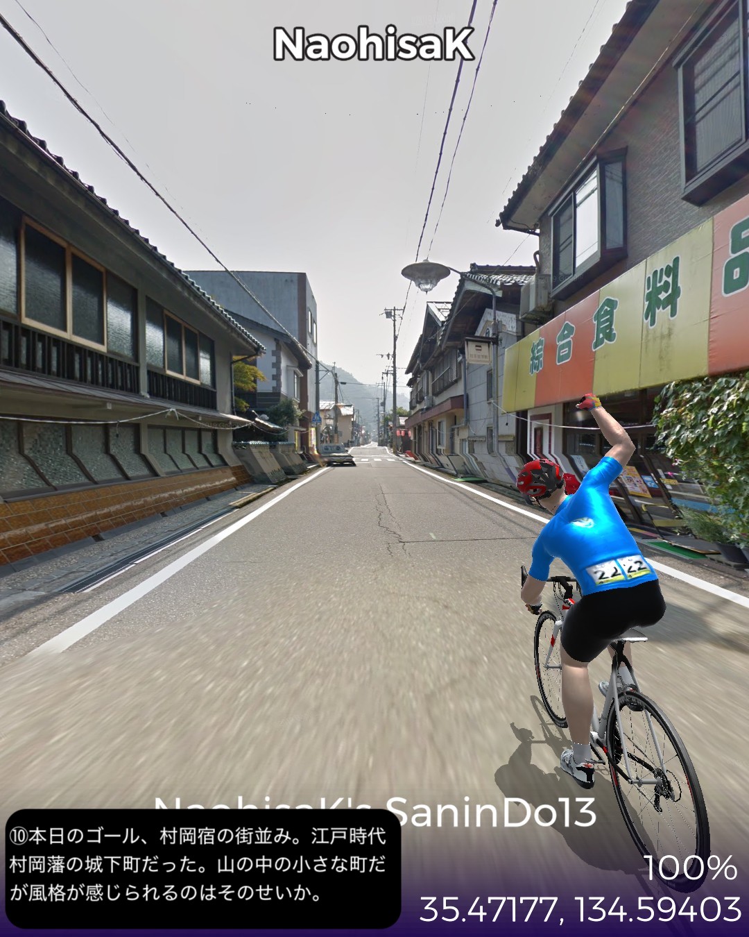 VRサイクリング、山陰道13日目。鳥取砂丘を後に日本海に別れを告げてひたすら山の中へ分け入ってゆく、峠を三つ越えてようやく鳥取宿以来の宿場町、村岡宿へたどり着くまでの54kmの長丁場の行程。前回までの宿場インターバルの短い街道筋が嘘のように宿場がないが、多分その理由は温泉だろう。今回の街道筋に三つも温泉があった。そのうち岩井温泉と湯村温泉は千年以上の歴史を持つ由緒正しい温泉地で、歴史を感じさせる旅館、そぞろ歩きたくなる温泉街がある。公式な宿場町でなくてもこうした温泉で旅人は荷を解いて湯に浸かってプハーと一杯やって旅の疲れを癒したに違いない。今回中国地方から抜けて兵庫県に入った。近畿編の始まりとなる。その最初の町名が新温泉町。そんな名前を付けたところからも、この辺が全国的にも温泉地の宝庫であることが想像される。VRサイクリングでは残念ながらその恩恵を受けられないが温泉地の雰囲気だけでも旅愁が感じられて良い。