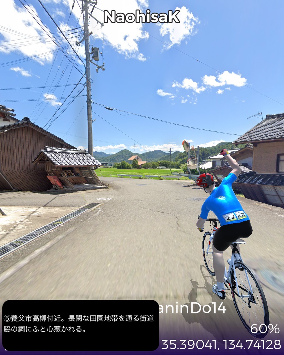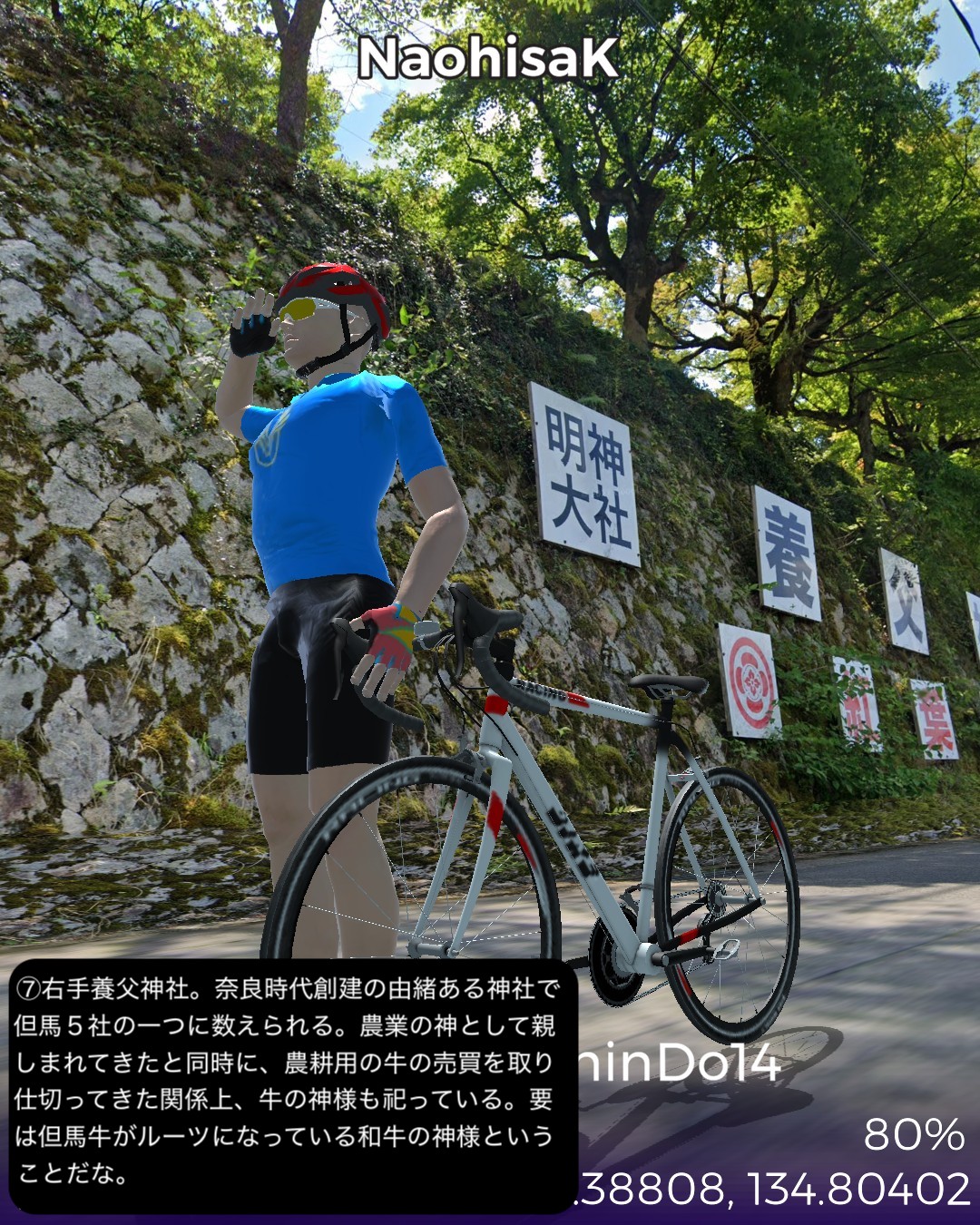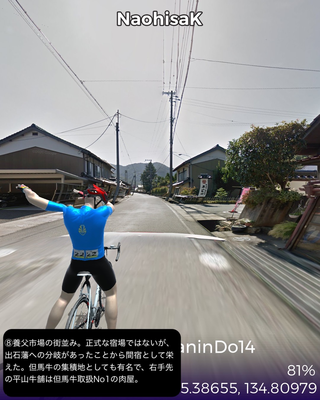 VRサイクリング、山陰道14日目。今回も内陸部のルート。山の中の城下町村岡宿を出て笠波峠、八井谷峠を越え広い谷間を進み八鹿(ようか)宿。ここからまたJR山陰本線に沿ってさらに広い谷間を進み和田山宿まで39kmの行程。今回は目立った名所や景勝地はなかったが、但馬(たじま)地方の穏やかな広い谷間に田園が広がる自然豊かな風土を感じたルートであった。特に養父(やぶ)付近は日本の和牛のベースになった但馬牛の集積地として知られ、街道沿いには但馬牛の取扱いNo.1の肉屋「平山牛舗」が店を構え、牛の神様も祀っている養父神社もある。