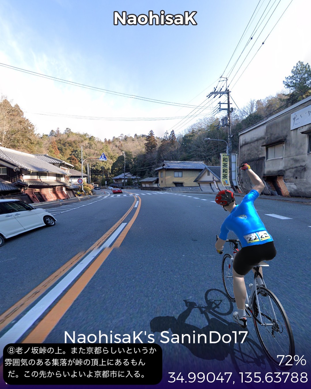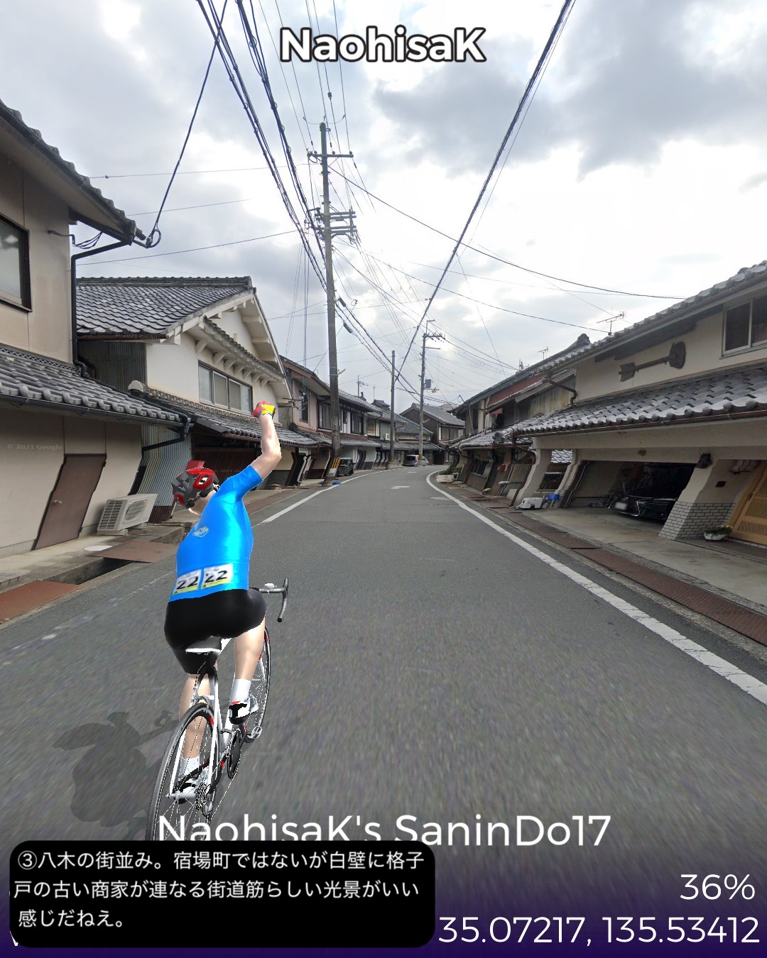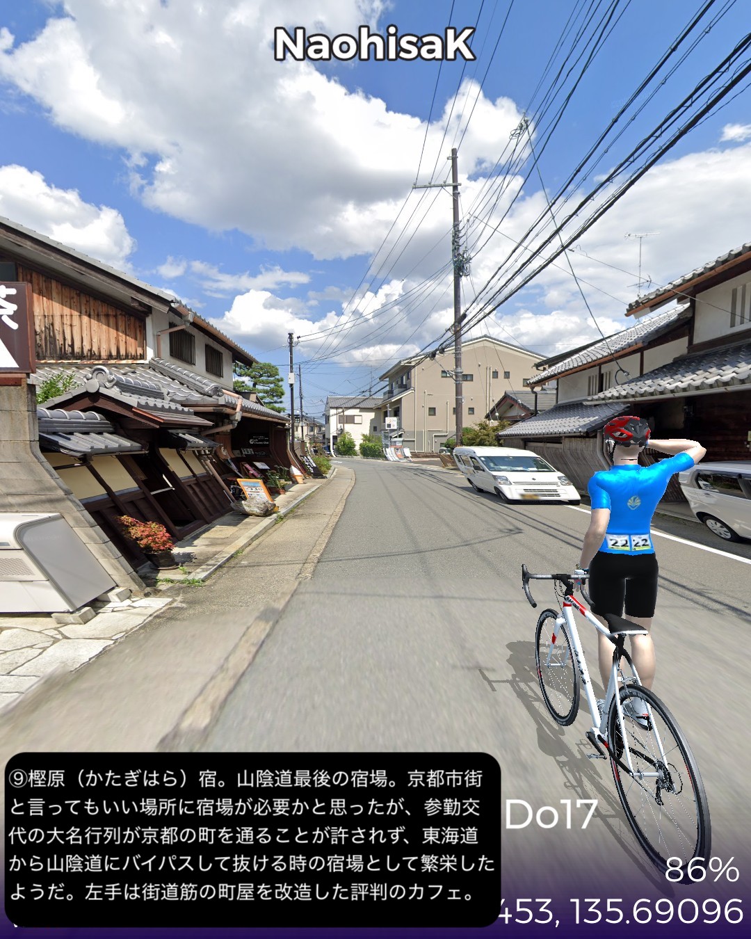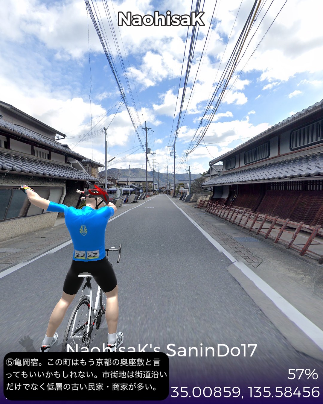 VRサイクリング 山陰道17日目。いよいよ今回が山陰道ファイナル。丹波グルメ食材の中心地に位置する須知宿をスタートし、一つ峠を越えて再度山陰本線沿線の広い盆地に出て園部宿、そして京都の奥座敷とも言える町、亀岡宿へと進む。そしてさらに老ノ坂峠を越えて京都市内に入り、樫原宿を経て京都駅に近い丹波口の山陰道の終点まで46kmの行程。園部宿から亀岡宿にかけての山陰本線沿いは、メガシティ京都の郊外地域として近くにつれ家並が途切れなくなり賑やかさが増してくるが、一方で京都の奥座敷でもあり、街道筋の街並みにはどこか洗練された伝統美も感じられる。亀岡から京都へアプローチする老ノ坂峠は、鳥取からここまで中国山地を横断してきた中のどの峠より深く険しい峠だ。明治時代によりスムーズな京都へのアプローチが熱望されたせいかその頃の最先端の土木技術で早々に整備されたトンネル老ノ坂隧道とアーチ型の王子橋(通称めがね橋)が現存しておりそのレトロな峠の雰囲気が良かった。京都市街は比較的地味で京都らしさが感じられない現代的な街並みのルートのまま山陰道の終点に到達した。次回は久々に京都市内を回ってみようと思う。