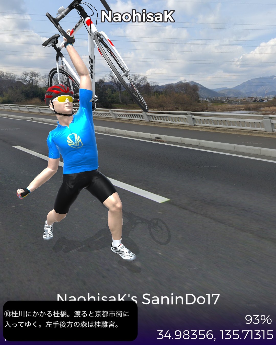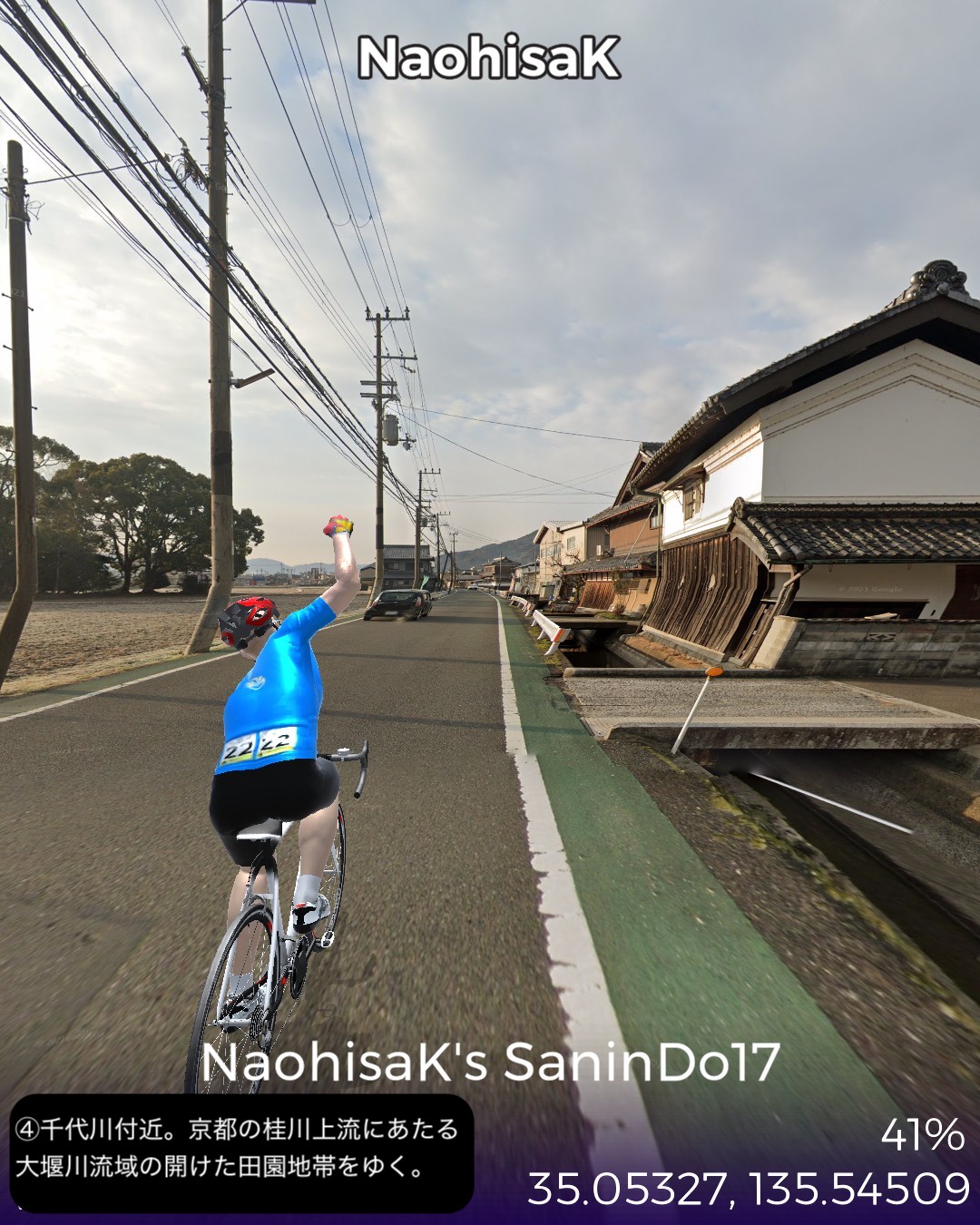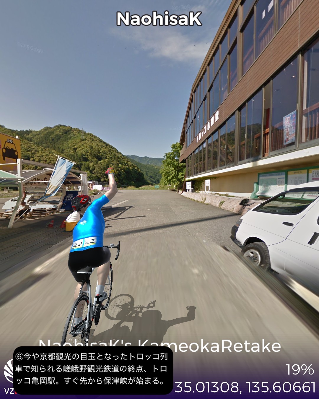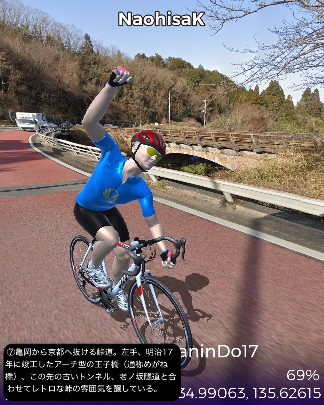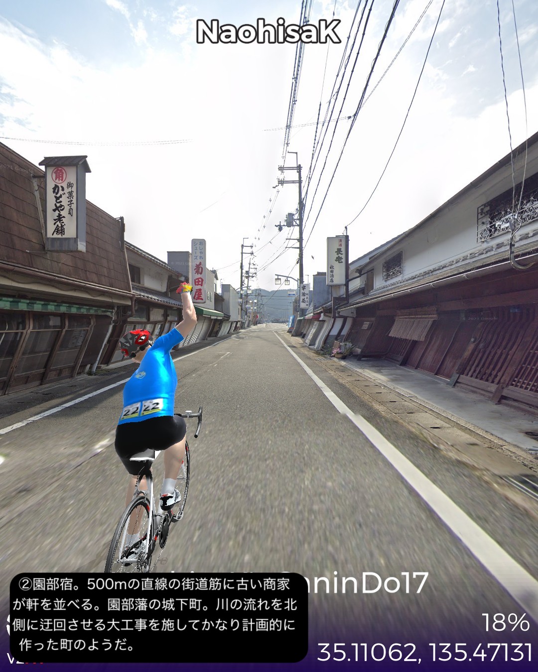 VRサイクリング 山陰道17日目。いよいよ今回が山陰道ファイナル。丹波グルメ食材の中心地に位置する須知宿をスタートし、一つ峠を越えて再度山陰本線沿線の広い盆地に出て園部宿、そして京都の奥座敷とも言える町、亀岡宿へと進む。そしてさらに老ノ坂峠を越えて京都市内に入り、樫原宿を経て京都駅に近い丹波口の山陰道の終点まで46kmの行程。園部宿から亀岡宿にかけての山陰本線沿いは、メガシティ京都の郊外地域として近くにつれ家並が途切れなくなり賑やかさが増してくるが、一方で京都の奥座敷でもあり、街道筋の街並みにはどこか洗練された伝統美も感じられる。亀岡から京都へアプローチする老ノ坂峠は、鳥取からここまで中国山地を横断してきた中のどの峠より深く険しい峠だ。明治時代によりスムーズな京都へのアプローチが熱望されたせいかその頃の最先端の土木技術で早々に整備されたトンネル老ノ坂隧道とアーチ型の王子橋(通称めがね橋)が現存しておりそのレトロな峠の雰囲気が良かった。京都市街は比較的地味で京都らしさが感じられない現代的な街並みのルートのまま山陰道の終点に到達した。次回は久々に京都市内を回ってみようと思う。