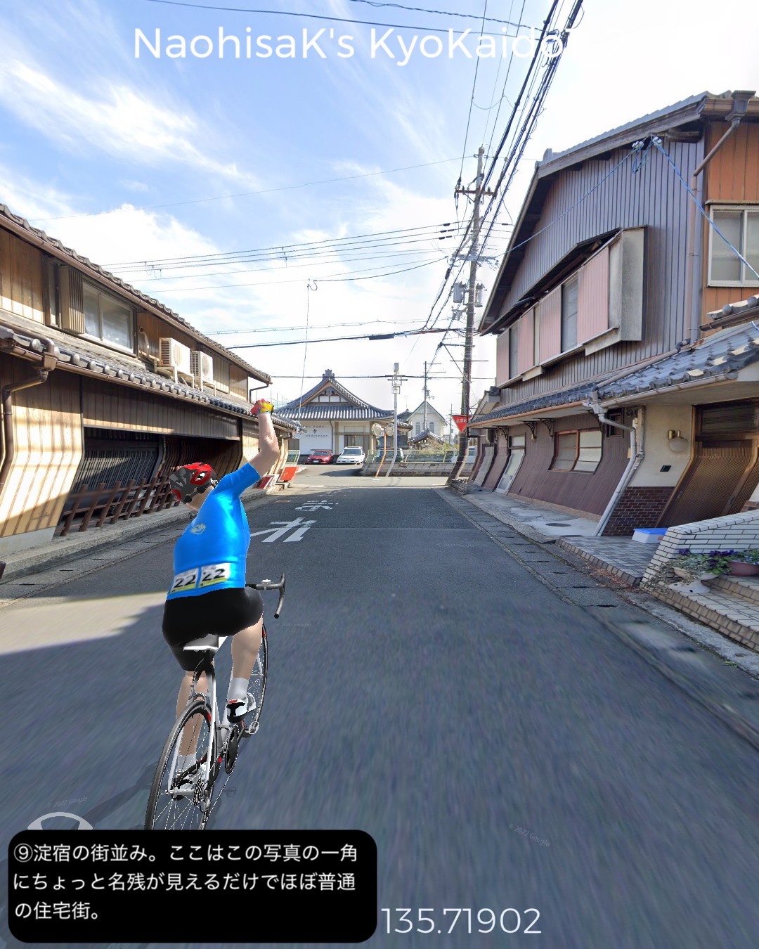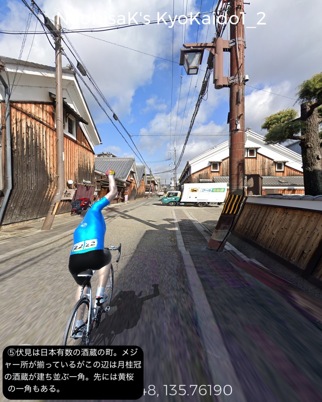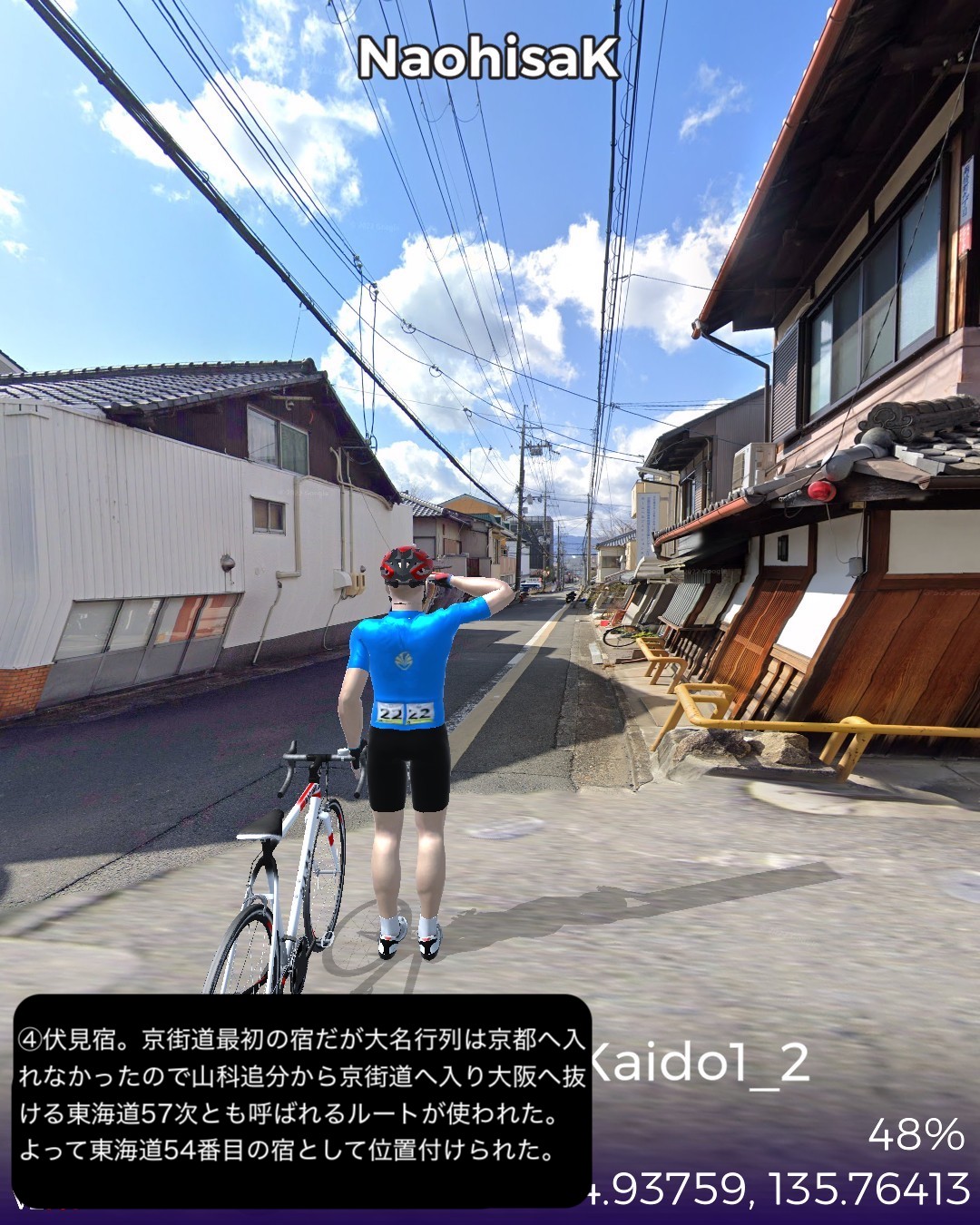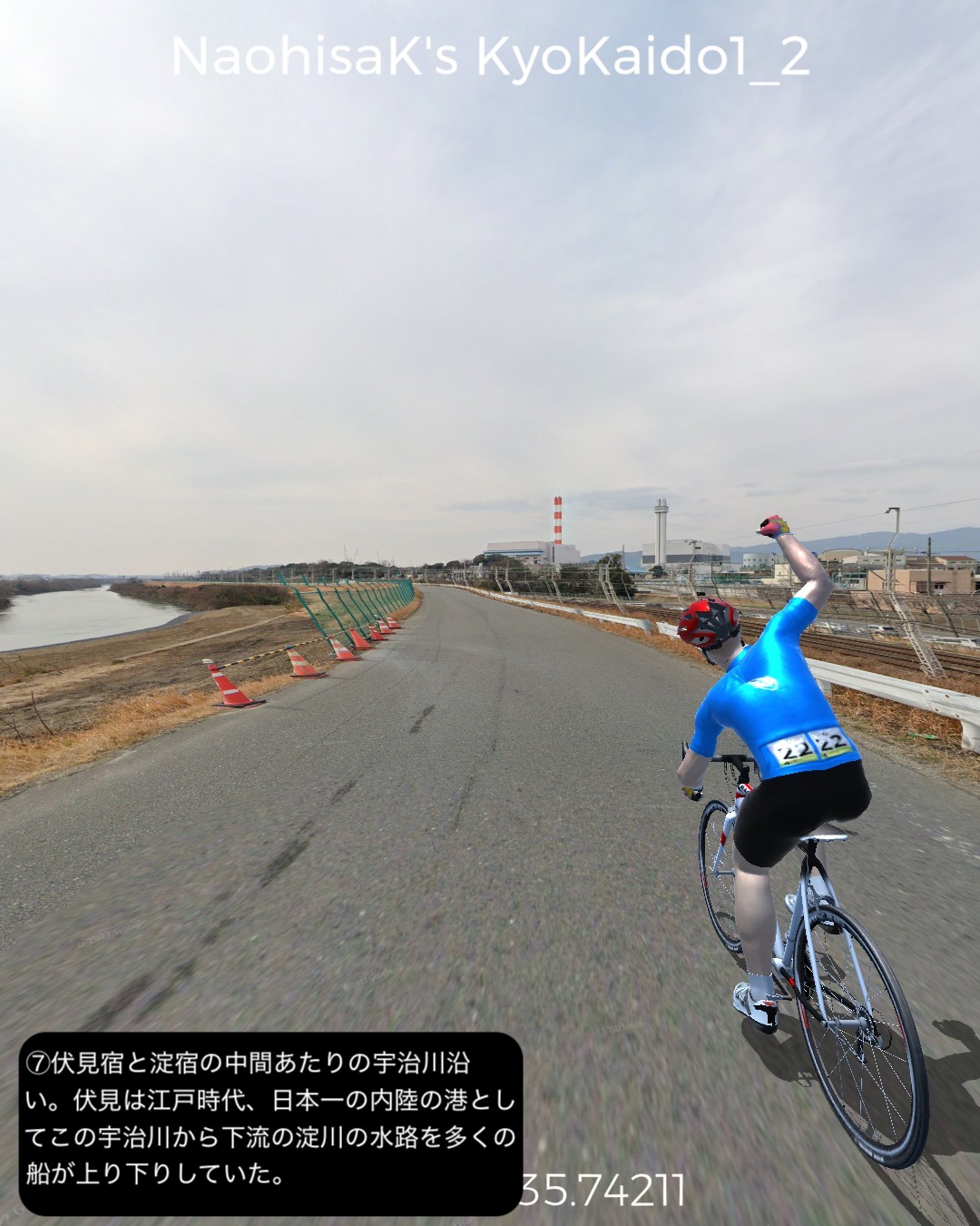 VRCサイクリング 京街道1日目。京都の西端に位置する山科追分から大阪へむけて京街道を往く。洛南の名所伏見宿、淀城の城下町淀宿を経て日本三大八幡宮の一つ石清水八幡宮まで23kmの行程。京街道は、江戸時代、西日本の大名行列が京都を通るのを禁じられていたため、東海道は京都手前の山科追分から京街道を通って大阪へ抜け、そこから海路を往くルートが利用されていた。これを東海道五十七次と呼び京街道はいわば東海道の延長とみなされていたわけだ。伏見は時代と共に変化してきた町。平安時代は貴族の別荘地、豊臣秀吉が伏見城を築城した後の桃山時代には日本の中心となる城下町、江戸時代には淀川水運の起点として日本最大の内陸港を有する一大商業として栄えた。歴史の舞台となってきたことから名所旧跡には事欠かない町だ。坂本龍馬襲撃が起きた寺田屋も残されている。また日本有数の酒蔵の町として月桂冠、黄桜など超メジャーどころが揃って酒蔵を展開している。リアルには訪れたことがなかったがなかなか奥が深そうな雰囲気のある町である。伏見からは淀川水系と京阪電鉄に沿って大阪方面に進むことになる。知らなかったが、本日ゴールとした石清水八幡宮のあたりで、丹波地方から京都市街を通ってきた桂川と、琵琶湖から宇治、伏見経由で流れてきた宇治川、紀伊半島の奥鈴鹿山脈から延々流れてきた木津川の三つの大河が一気に合流して淀川になるのだ。よって石清水八幡宮のあたりの河原の広がりはとてつもなくて驚く。次回は初めて大阪市街へ乗り込む予定。