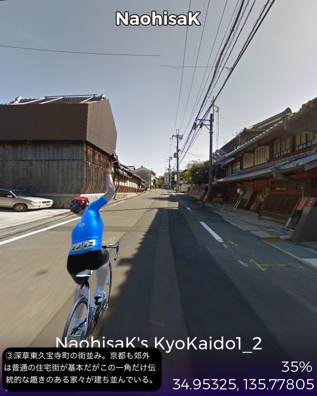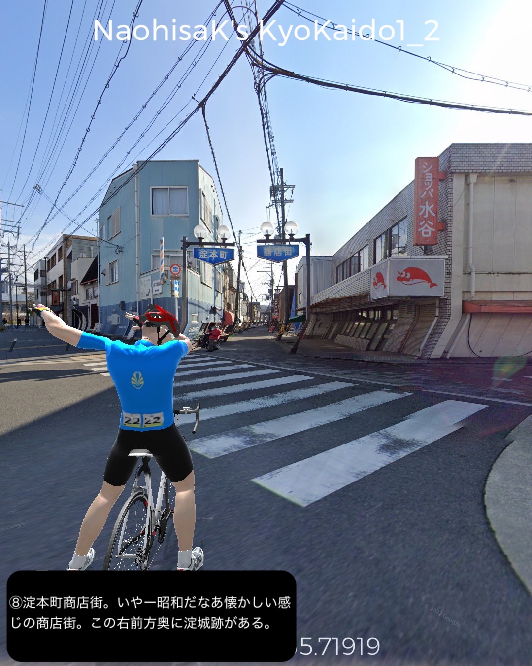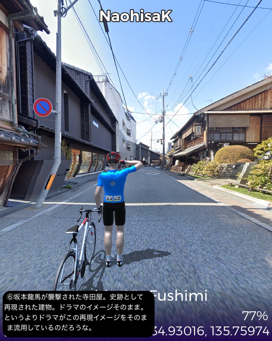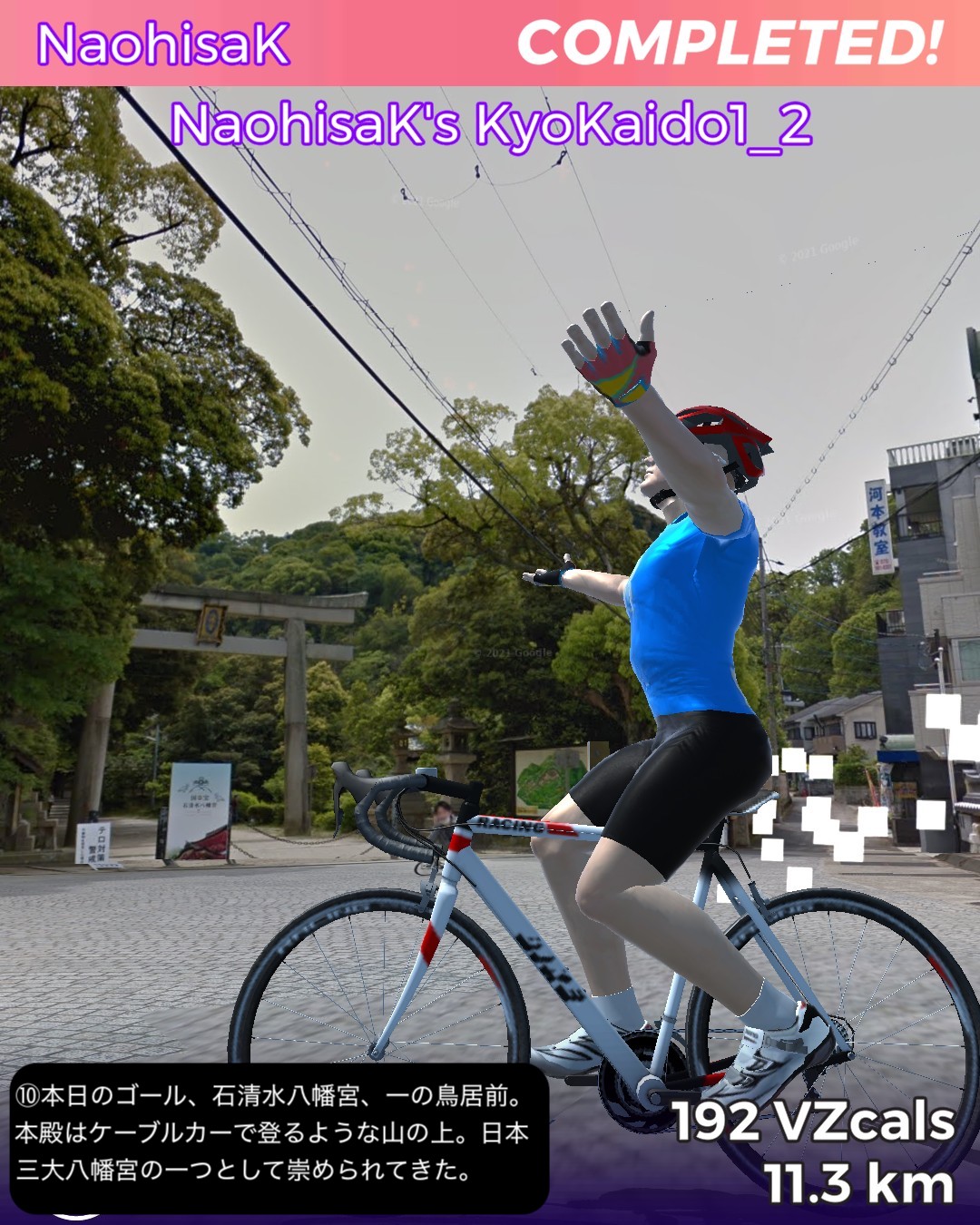 VRCサイクリング 京街道1日目。京都の西端に位置する山科追分から大阪へむけて京街道を往く。洛南の名所伏見宿、淀城の城下町淀宿を経て日本三大八幡宮の一つ石清水八幡宮まで23kmの行程。京街道は、江戸時代、西日本の大名行列が京都を通るのを禁じられていたため、東海道は京都手前の山科追分から京街道を通って大阪へ抜け、そこから海路を往くルートが利用されていた。これを東海道五十七次と呼び京街道はいわば東海道の延長とみなされていたわけだ。伏見は時代と共に変化してきた町。平安時代は貴族の別荘地、豊臣秀吉が伏見城を築城した後の桃山時代には日本の中心となる城下町、江戸時代には淀川水運の起点として日本最大の内陸港を有する一大商業として栄えた。歴史の舞台となってきたことから名所旧跡には事欠かない町だ。坂本龍馬襲撃が起きた寺田屋も残されている。また日本有数の酒蔵の町として月桂冠、黄桜など超メジャーどころが揃って酒蔵を展開している。リアルには訪れたことがなかったがなかなか奥が深そうな雰囲気のある町である。伏見からは淀川水系と京阪電鉄に沿って大阪方面に進むことになる。知らなかったが、本日ゴールとした石清水八幡宮のあたりで、丹波地方から京都市街を通ってきた桂川と、琵琶湖から宇治、伏見経由で流れてきた宇治川、紀伊半島の奥鈴鹿山脈から延々流れてきた木津川の三つの大河が一気に合流して淀川になるのだ。よって石清水八幡宮のあたりの河原の広がりはとてつもなくて驚く。次回は初めて大阪市街へ乗り込む予定。