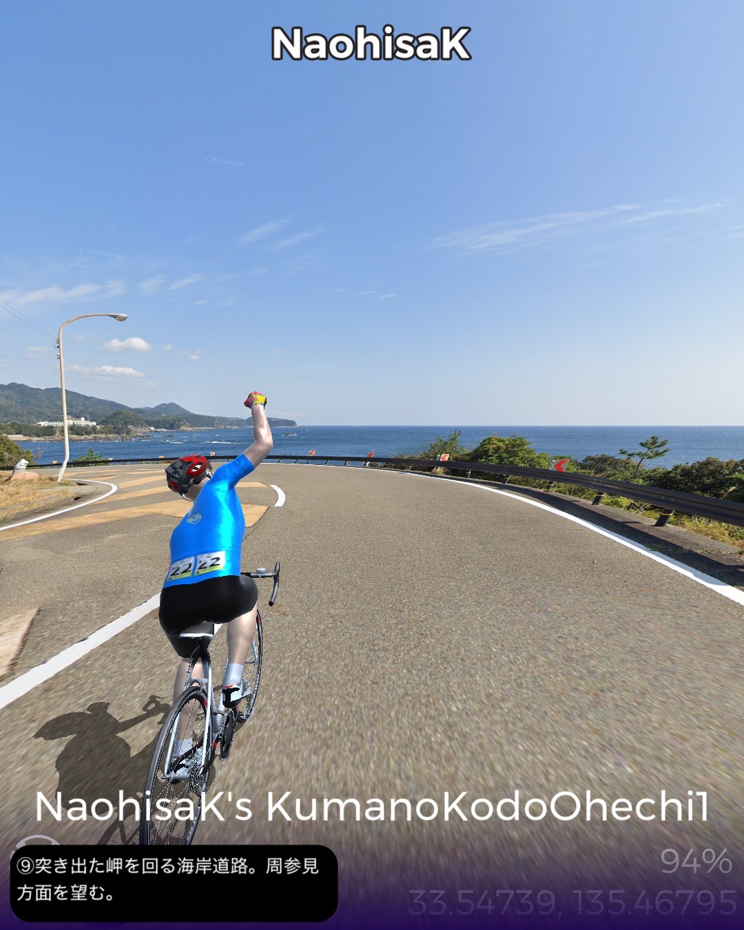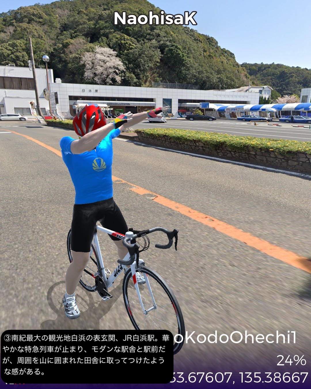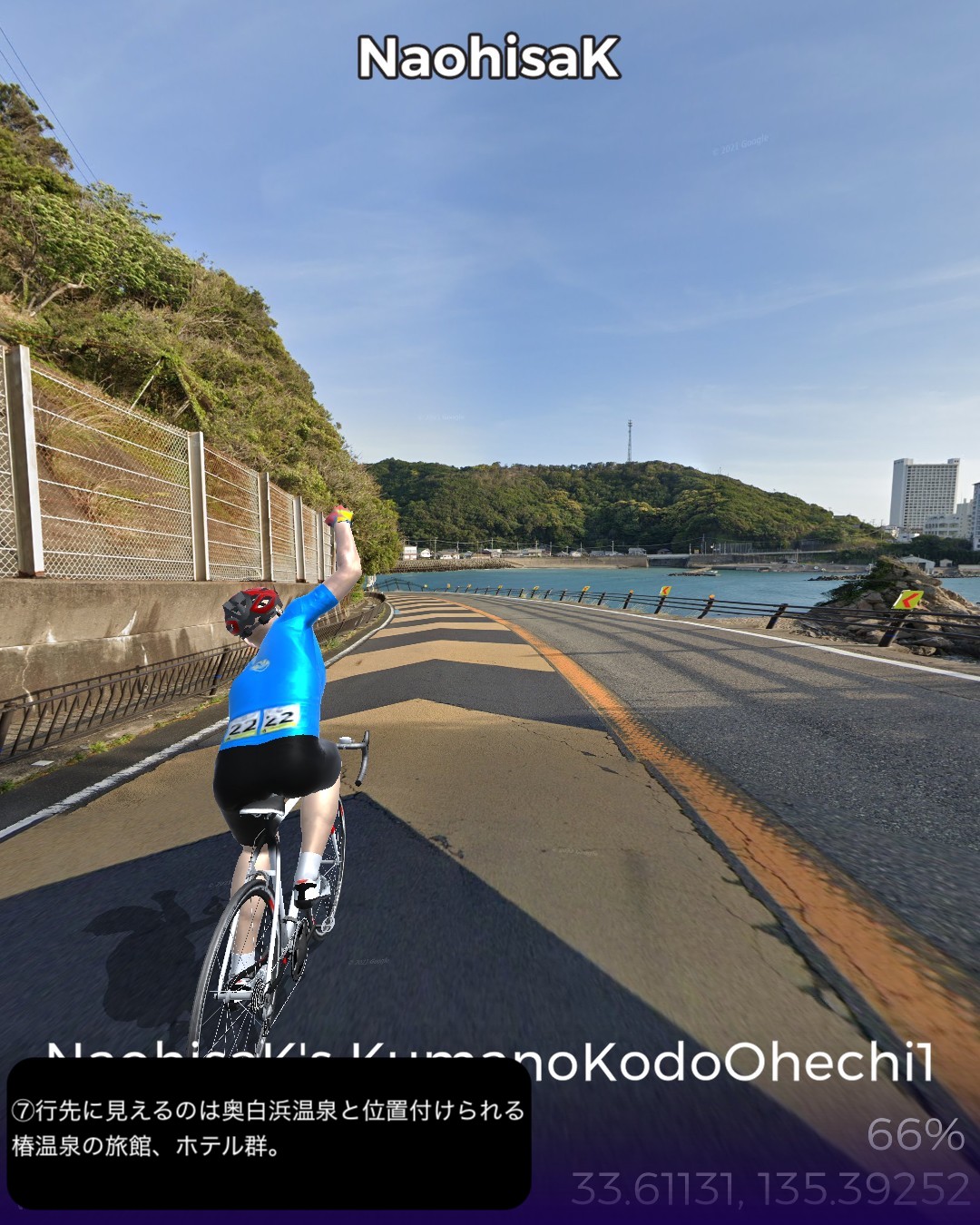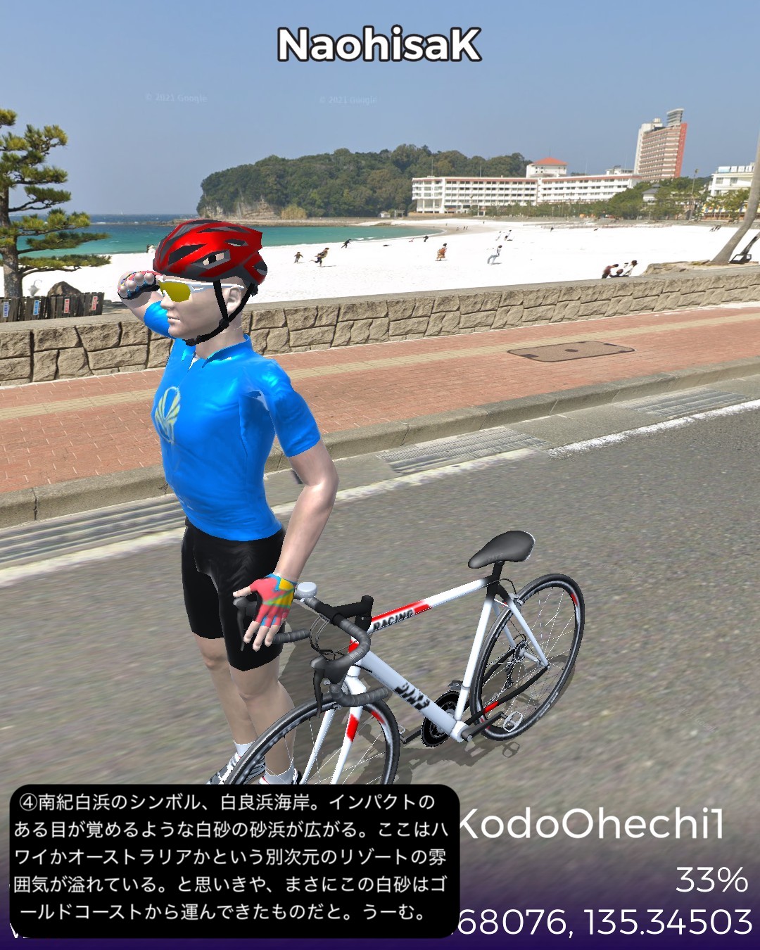 VRサイクリング 本日から熊野古道 大辺路(おおへち)に取り掛かる。田辺市街、道分け石をスタートし、白浜温泉へ大きく寄り道した後海岸沿いに周参見(すさみ)まで進む57kmの長丁場。紀伊半島南端まではもう一息。大辺路を往くと宣言したものの今回は始点と終点こそ大辺路上にあるものの、前半の白浜温泉へのルートは完全に寄り道で大辺路から外れており、その後も今回通った海岸沿いの国道はほとんど古道から外れていて古道を忠実に入った割合は1-2割程度と思われる。多分昔は海岸沿いのルートは地形が厳しく山の中のルートとなったようだが、現在ではストリートビュー付きの道路として扱えない正に古道として残った部分がほとんどである。 白浜温泉は古代からの保養地だったようだが、そうした歴史的な雰囲気は全く感じられずハワイかオーストラリアかという感じの洗練されたリゾートとしての指向性が強まっている。目が覚めるような真っ白な砂浜は実に印象的だが実はゴールドコーストの砂を撒いているらしい。それを認識するとこの一帯はディズニーリゾートのような全て人が設計したテーマパークのような気がしてくる。パンダが7頭もいるアドベンチャーワールドも、山の中を切り開いて至近に整備した白浜空港も、全て本来の素朴な自然を単なるバックグラウンドにして、人が集まってくる壮大な仕掛けが出来上がっている特異な地域であった。世界遺産となった熊野三社や古道などの伝統美と自然美に対して対極にあり、同じ地域にありながらかなり違和感のある組み合わせのような気はする。旅行者としては体験のバリエーションが広がって面白いと思うかもしれないが。さて結局今回も前回に引き続き海岸道路をひたすら進んできたが、この流れはまだまだ続く。