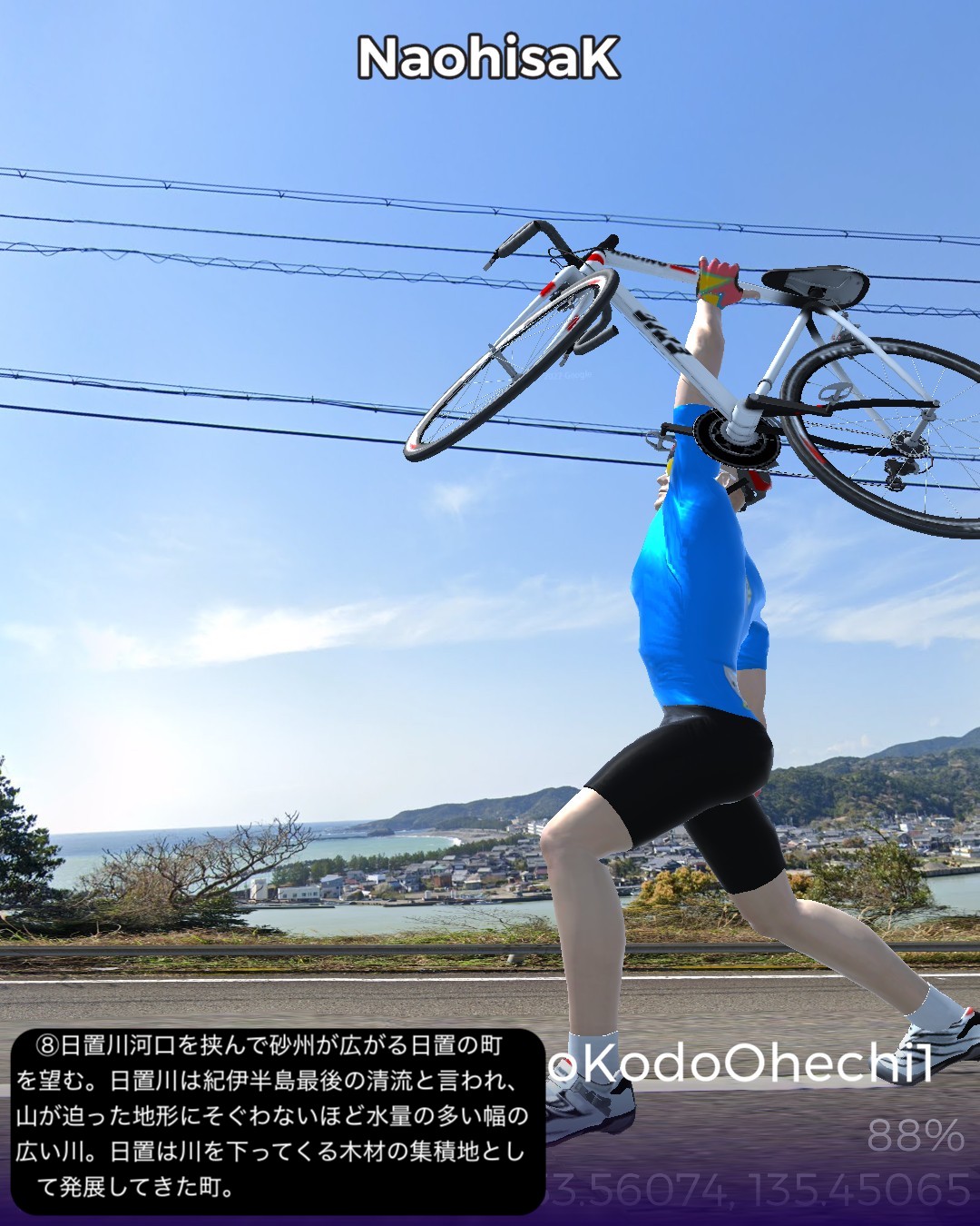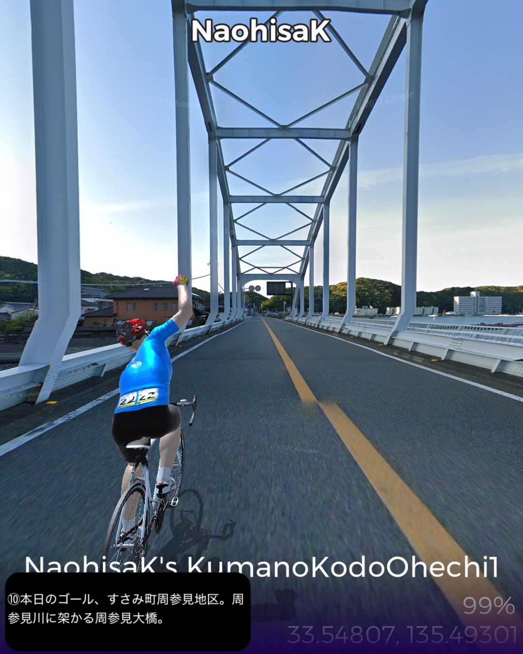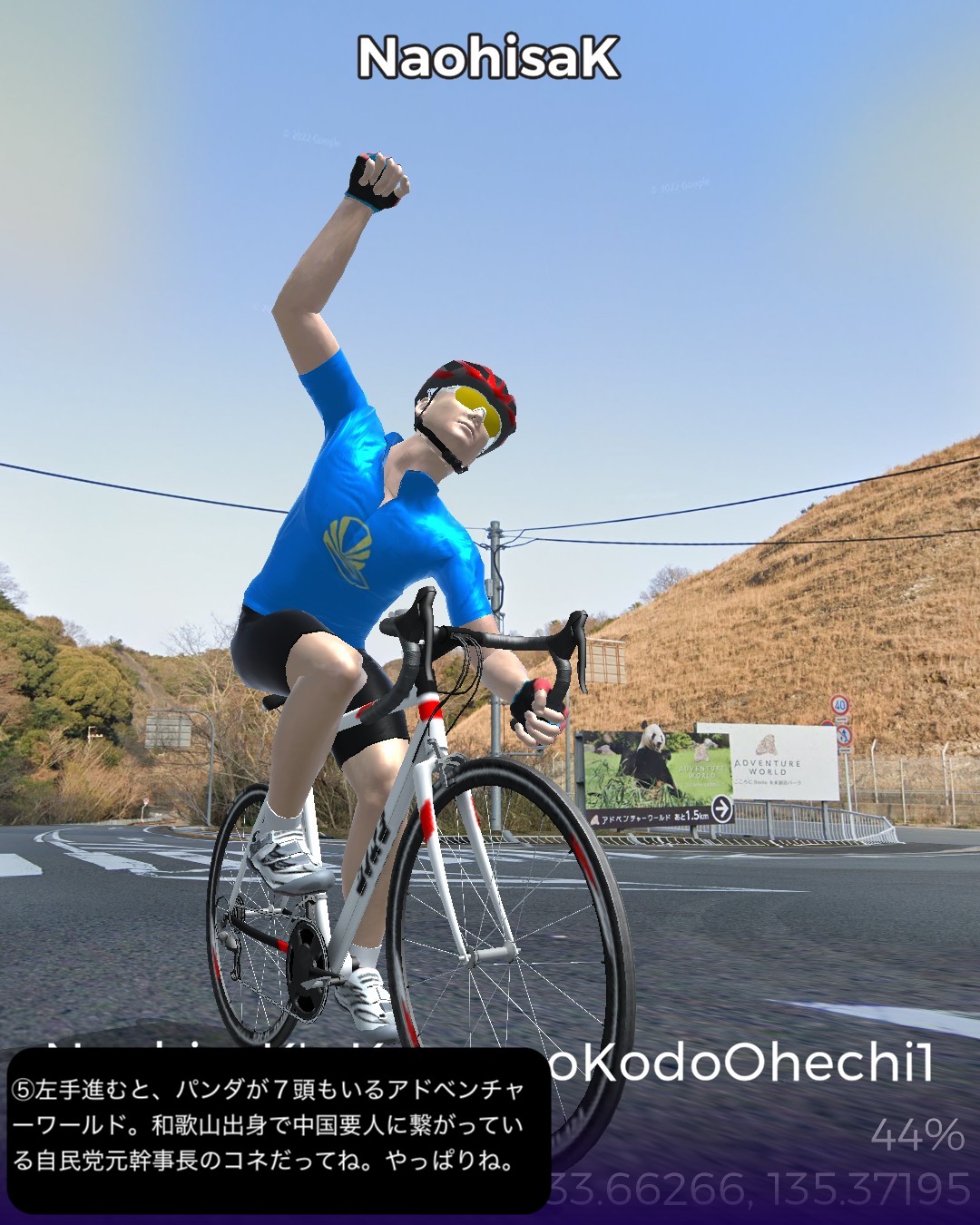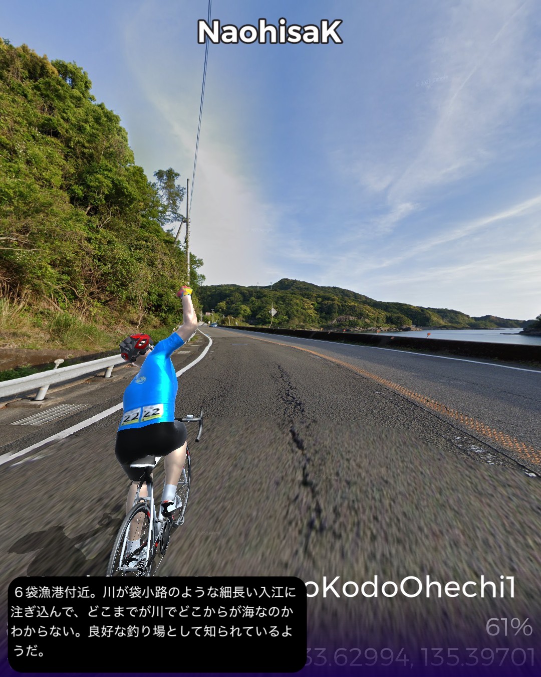 VRサイクリング 本日から熊野古道 大辺路(おおへち)に取り掛かる。田辺市街、道分け石をスタートし、白浜温泉へ大きく寄り道した後海岸沿いに周参見(すさみ)まで進む57kmの長丁場。紀伊半島南端まではもう一息。大辺路を往くと宣言したものの今回は始点と終点こそ大辺路上にあるものの、前半の白浜温泉へのルートは完全に寄り道で大辺路から外れており、その後も今回通った海岸沿いの国道はほとんど古道から外れていて古道を忠実に入った割合は1-2割程度と思われる。多分昔は海岸沿いのルートは地形が厳しく山の中のルートとなったようだが、現在ではストリートビュー付きの道路として扱えない正に古道として残った部分がほとんどである。 白浜温泉は古代からの保養地だったようだが、そうした歴史的な雰囲気は全く感じられずハワイかオーストラリアかという感じの洗練されたリゾートとしての指向性が強まっている。目が覚めるような真っ白な砂浜は実に印象的だが実はゴールドコーストの砂を撒いているらしい。それを認識するとこの一帯はディズニーリゾートのような全て人が設計したテーマパークのような気がしてくる。パンダが7頭もいるアドベンチャーワールドも、山の中を切り開いて至近に整備した白浜空港も、全て本来の素朴な自然を単なるバックグラウンドにして、人が集まってくる壮大な仕掛けが出来上がっている特異な地域であった。世界遺産となった熊野三社や古道などの伝統美と自然美に対して対極にあり、同じ地域にありながらかなり違和感のある組み合わせのような気はする。旅行者としては体験のバリエーションが広がって面白いと思うかもしれないが。さて結局今回も前回に引き続き海岸道路をひたすら進んできたが、この流れはまだまだ続く。