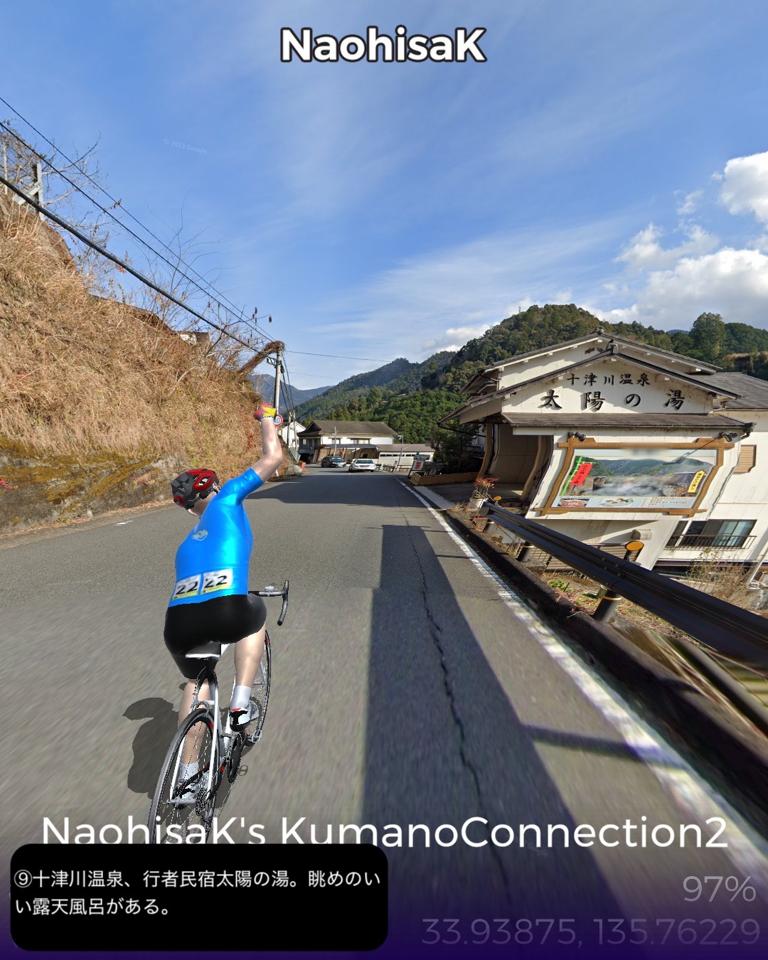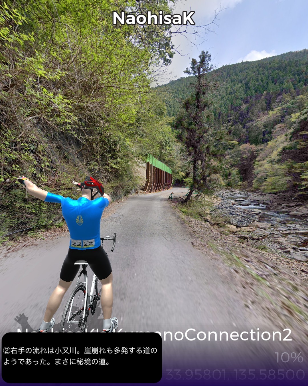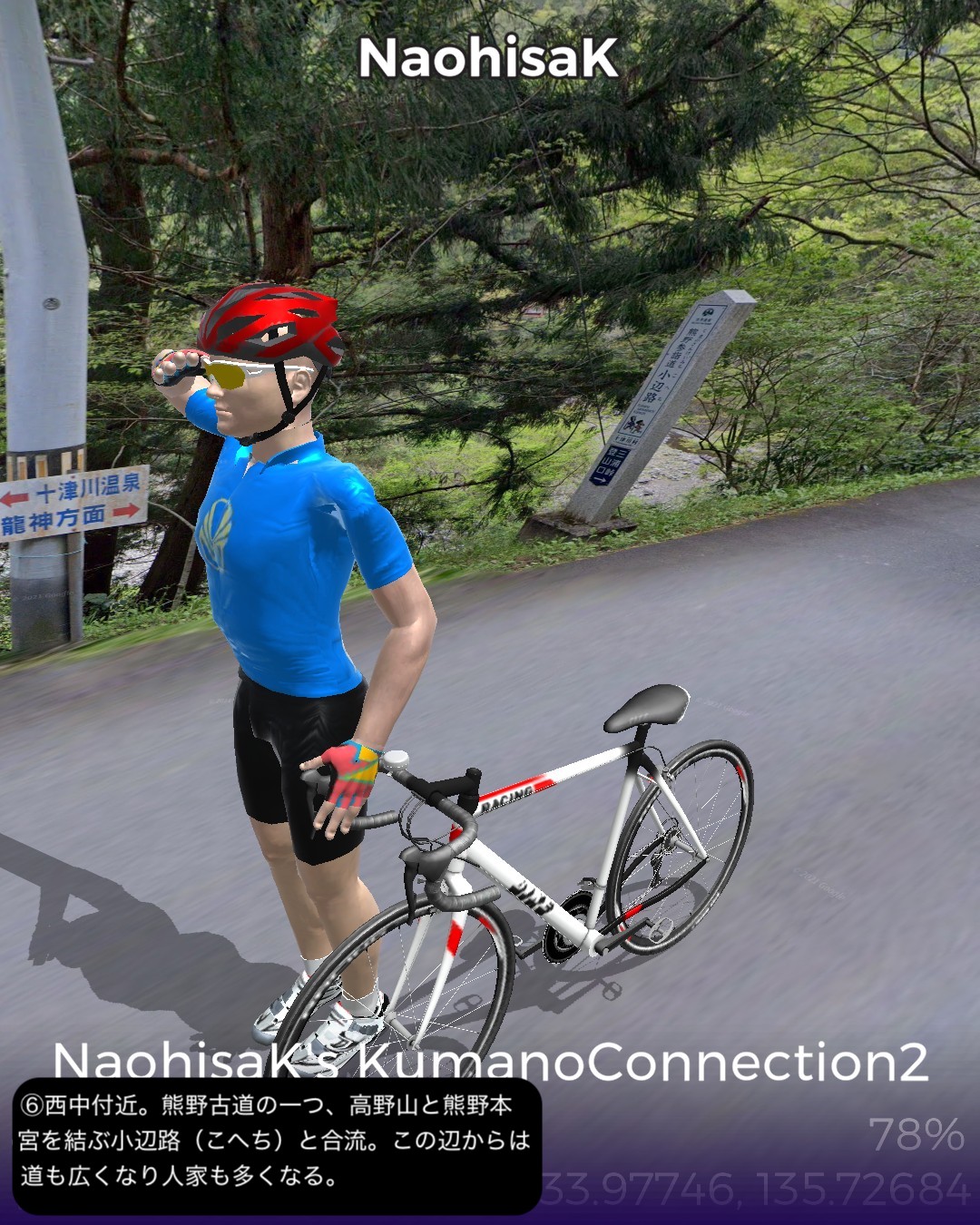VRサイクリング 熊野コネクション2日目。リアルライフで長期旅行へ出かけていたためVRライフではしばらく龍神温泉で療養しておりました。秘境の湯龍神温泉から秘境の湯十津川温泉まで秘境の山道をまっしぐらの46kmの行程。国道425号線、日本三大酷道の一つと呼ばれているらしい。出発早々「転落死亡事故多発」の看板があり、その先は車ですれ違うのが難しそうな九十九折の山道が延々と続く。至るところにガードレールなしの崖露出があり、リアルに車で走っていて対向車とヘタなところで遭遇するとやばいことになる。VRサイクリングなので鼻歌まじりで進めるが想像するとコワい。道路環境の改善を訴えたポスターを数カ所で見かけた。そういうわけで今回のルートは集落もまばらのひたすら山道でめぼしい名所は特になかったが、最後の方の数キロメートルは熊野古道の一つ、高野山と熊野本宮を結ぶ小辺路(こへち)と合流して進む。ゴールの十津川温泉は土地としては秘境と言って良いロケーションだが意外に中規模の温泉旅館街があって賑わっている雰囲気。美肌の湯として知られる泉質で、全国に先駆けて源泉掛け流しを始めた湯量を誇る優れた温泉で、秘境という温泉場のプレミアムな価値がウケているってことかな。