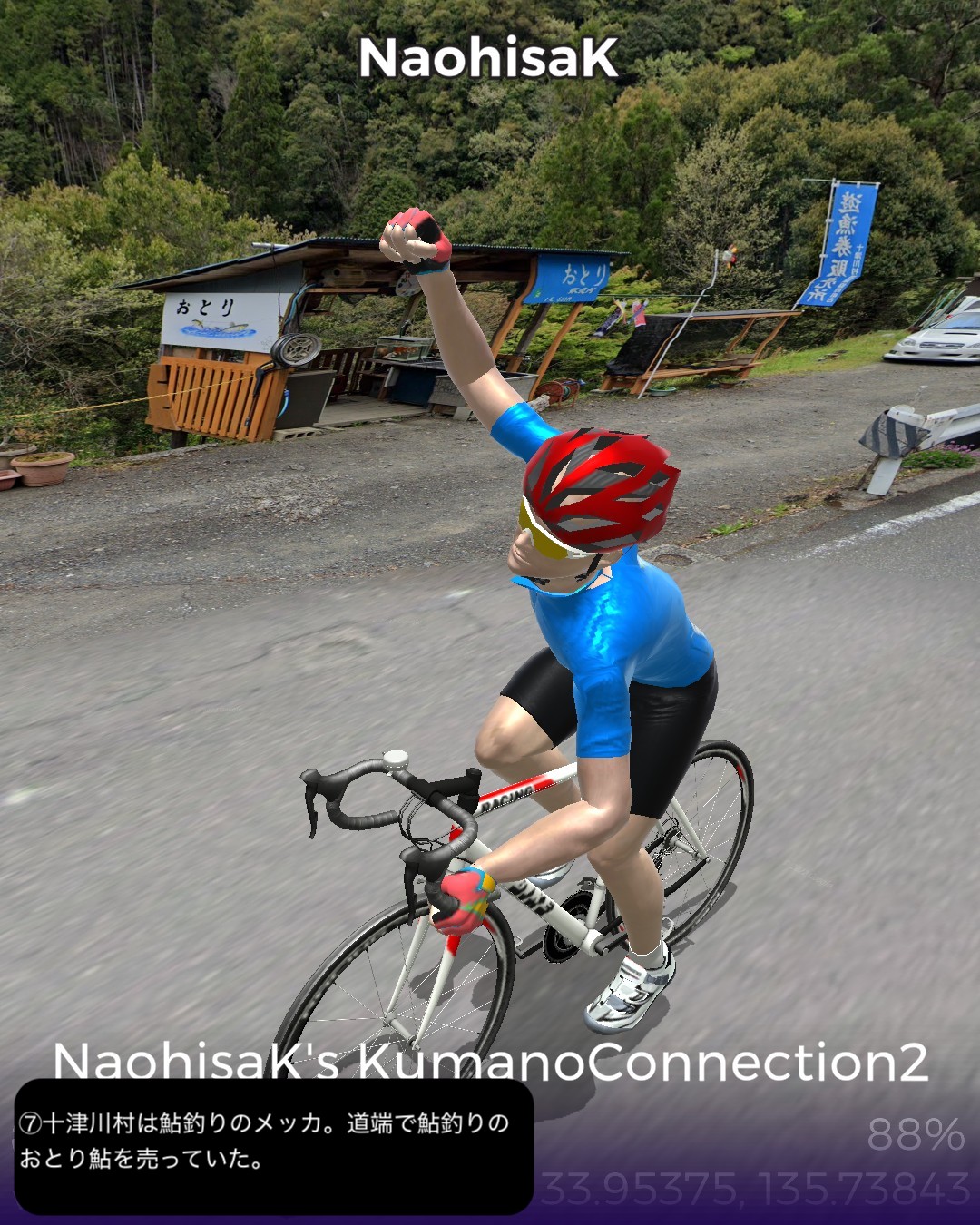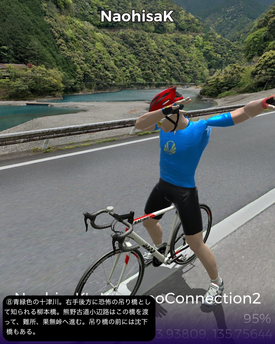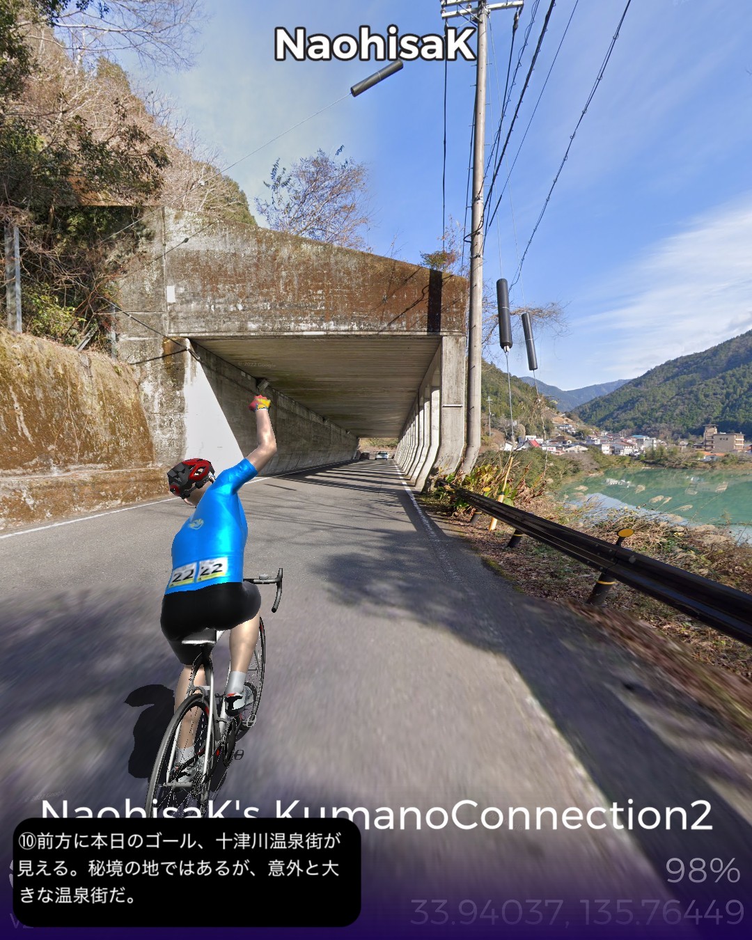 VRサイクリング 熊野コネクション2日目。リアルライフで長期旅行へ出かけていたためVRライフではしばらく龍神温泉で療養しておりました。秘境の湯龍神温泉から秘境の湯十津川温泉まで秘境の山道をまっしぐらの46kmの行程。国道425号線、日本三大酷道の一つと呼ばれているらしい。出発早々「転落死亡事故多発」の看板があり、その先は車ですれ違うのが難しそうな九十九折の山道が延々と続く。至るところにガードレールなしの崖露出があり、リアルに車で走っていて対向車とヘタなところで遭遇するとやばいことになる。VRサイクリングなので鼻歌まじりで進めるが想像するとコワい。道路環境の改善を訴えたポスターを数カ所で見かけた。そういうわけで今回のルートは集落もまばらのひたすら山道でめぼしい名所は特になかったが、最後の方の数キロメートルは熊野古道の一つ、高野山と熊野本宮を結ぶ小辺路(こへち)と合流して進む。ゴールの十津川温泉は土地としては秘境と言って良いロケーションだが意外に中規模の温泉旅館街があって賑わっている雰囲気。美肌の湯として知られる泉質で、全国に先駆けて源泉掛け流しを始めた湯量を誇る優れた温泉で、秘境という温泉場のプレミアムな価値がウケているってことかな。