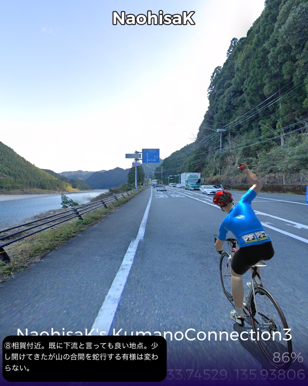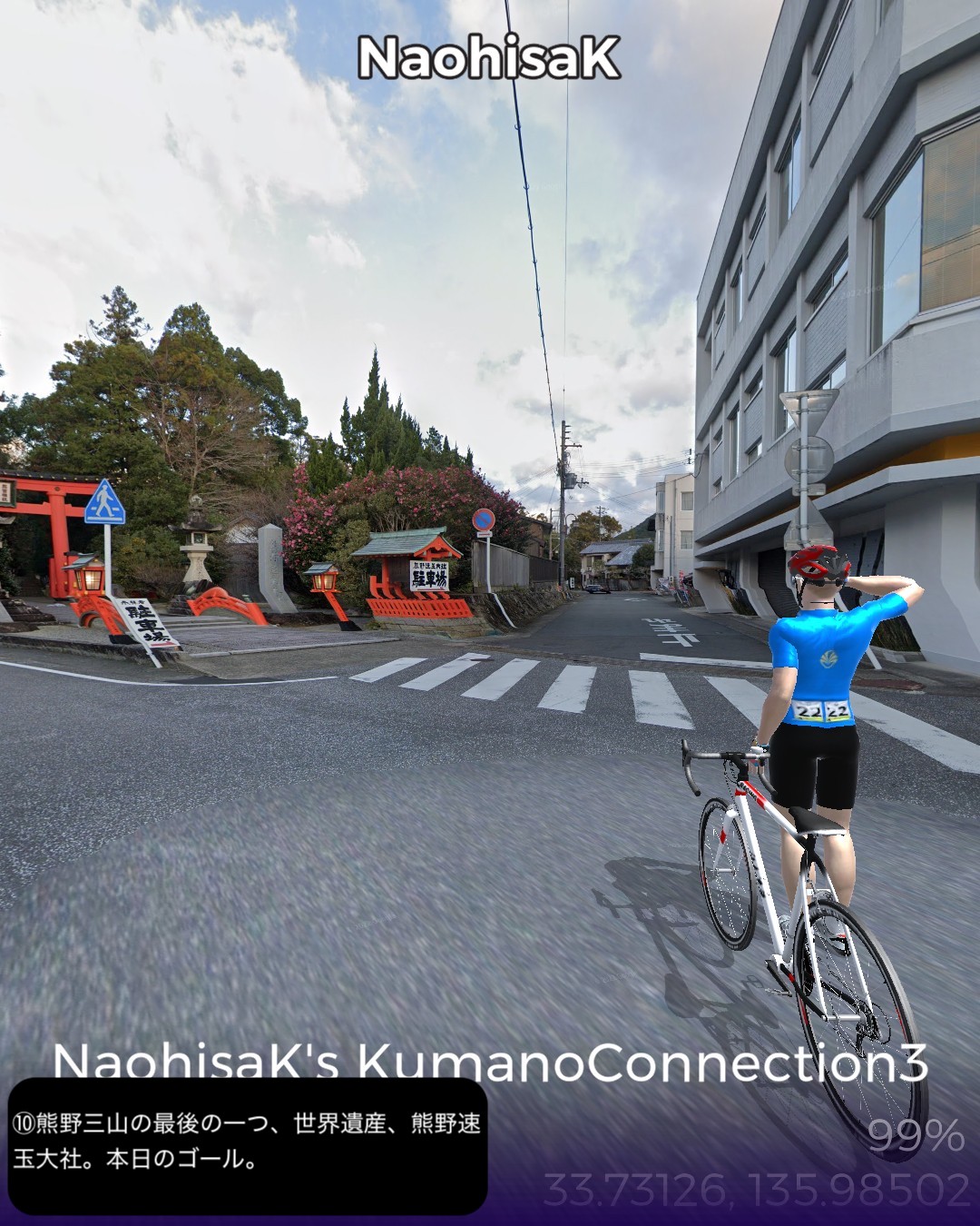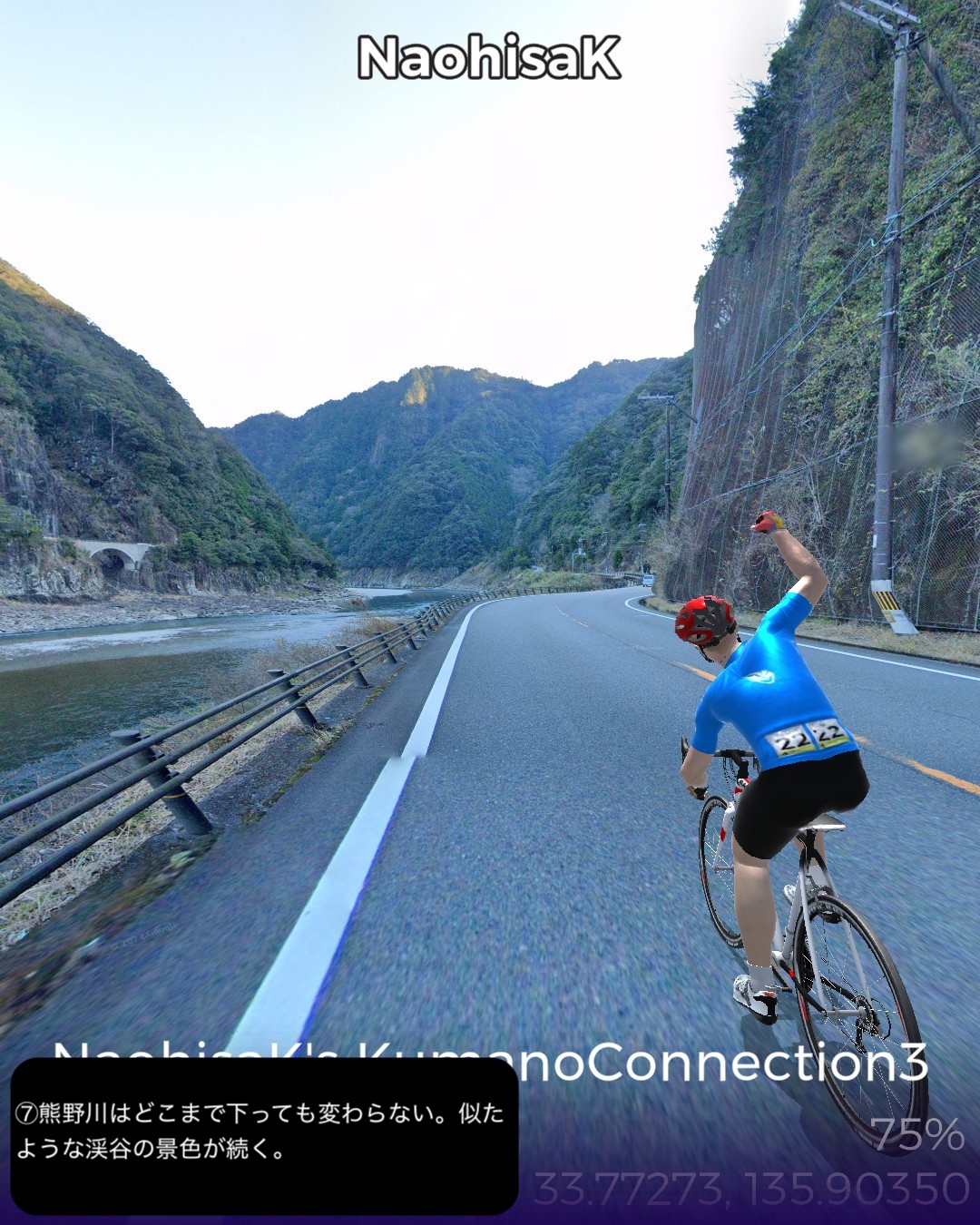 VRサイクリング 熊野コネクション3日目 山奥の秘境、十津川温泉から熊野川沿いを一気に駆け下り紀伊半島東側海岸の町、新宮に至る52kmの行程。十津川温泉を流れていた(流れはほとんどなかったが)十津川は下って、奈良県から和歌山県に入ると熊野川と名前を変える。今回は、ちょうど1ヶ月前に通った熊野本宮周辺をルートのダブり回避のため山の中へ迂回した以外はこの熊野川を横に眺めつつひたすら国道を進むルート。それにしてもこの熊野川、上流から河口の新宮市街の手前まで一貫して両側に山が迫る谷をゆったりと蛇行しながらも流れがほとんど見られない静かなる川という基本形態が変化しないのだ。国道を走っていることも相まって景色は変化に乏しくルートとしては面白みに欠けた。途中瀞峡へのジェット船乗り場を通り過ぎたが、瀞峡は熊野川支流の北山川にあって道路が整備されていない地域なので残念ながら今回は立ち寄るのを諦めた。そちらは奇岩が展開する渓谷美と不思議に流れのない静謐な川面が織りなす霊妙な景観の中を、昔から運航しているジェット船で駆け巡るという素晴らしい観光資源となっていて、子供の頃その観光パンフレットを見て行きたい場所として心に刻んだ覚えがある。ゴールは新宮市街にある、世界遺産、熊野三山で最後に訪れることになった熊野速玉大社。三山の中では地味な構えと門前に見えたが、交通の便は最も良い立地なので巡礼者は多いのであろう。次回からはまた紀伊半島の東海岸沿いに街道の旅を続ける。