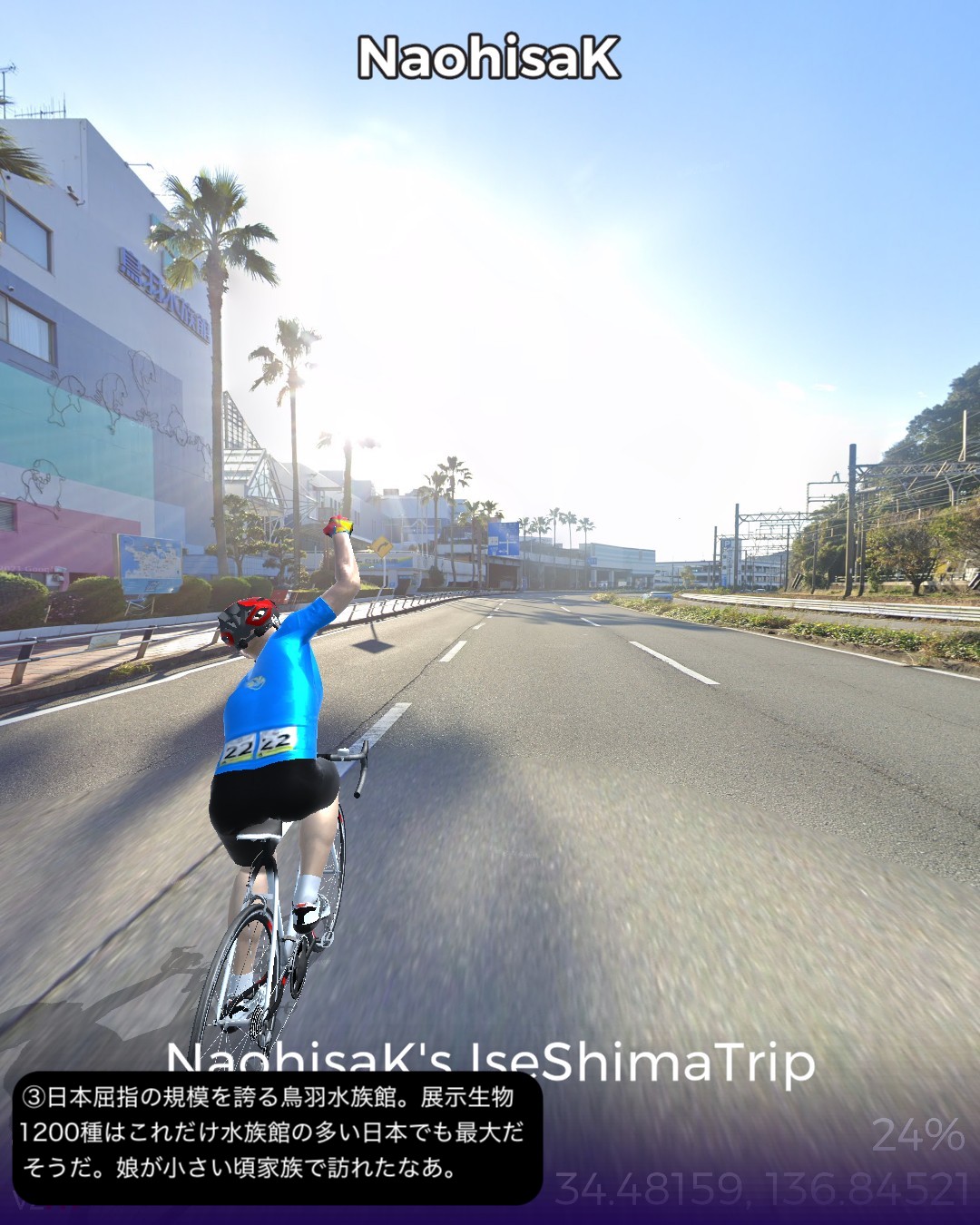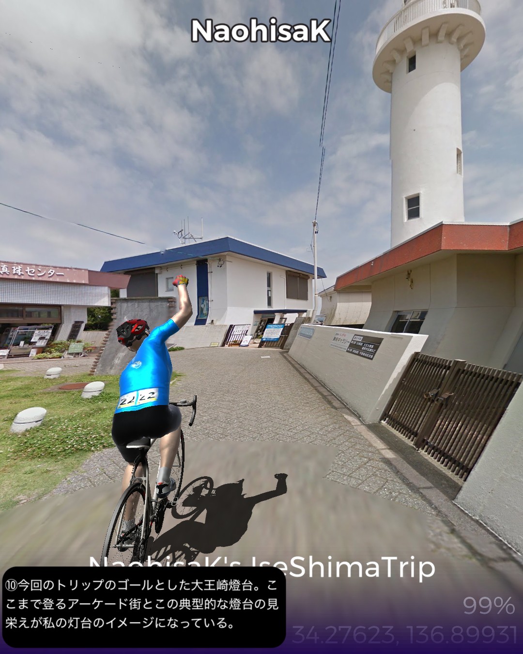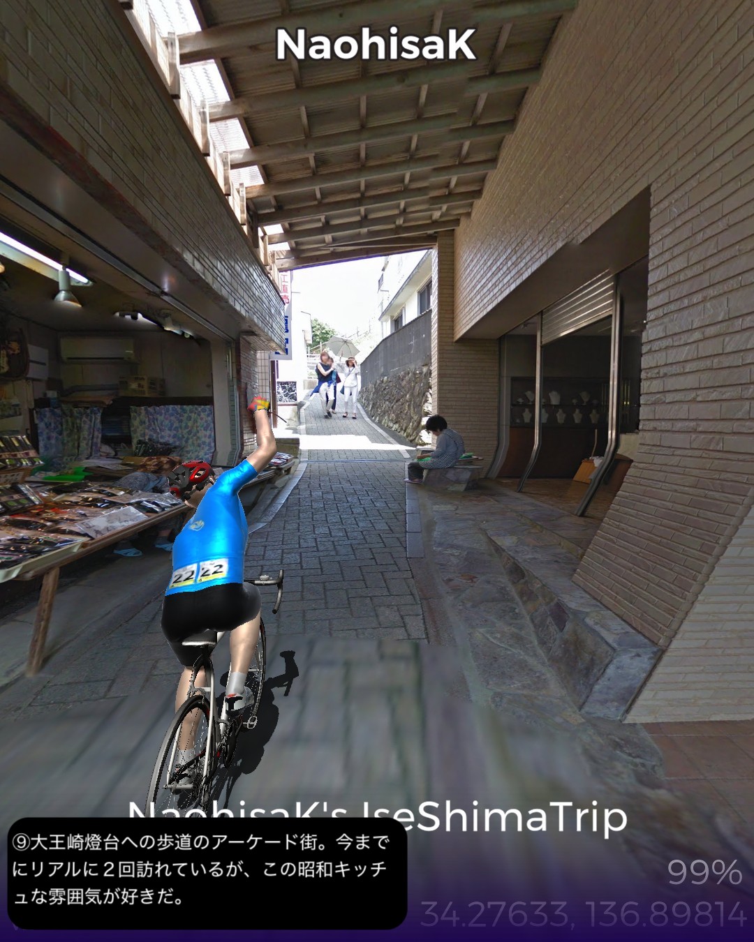 VRサイクリング番外編、伊勢志摩 1day Tripとして伊勢神宮内宮前おかげ横丁の途中を起点に鳥羽、そこから海岸沿いのパールロードを進んでスペイン村を横目に大王崎灯台まで57kmと意外と遠かった行程。鳥羽からスペイン村あたりまでのパールロードはアップダウンが激しいが、入り組んだ海岸線の眺めもよく楽しい道程だ。20年ほど前に伊勢神宮と共に鳥羽水族館やスペイン村、そしてゴールの大王崎を訪れたのを懐かしく思い出した。どこもその頃とほぼ変わっていないが、牡蠣小屋が沿道に建ち並ぶようになったのは近年ブームになって以来じゃないかな。牡蠣好きの私としてはこの辺の牡蠣小屋で煙に巻かれながらもバーベキュースタイルで牡蠣をたらふく食べてみたい。大王崎は今までに2回も訪れているが、灯台へ続く歩道がアーケード街になっていて、土産物屋や食堂、干物屋が所狭しとひしめいている雰囲気が昭和な感じで素敵だ。さて今回はあくまで番外編ということで、次回は前回ゴールとした伊勢神宮内宮をスタート地点として伊勢街道へ進む予定。