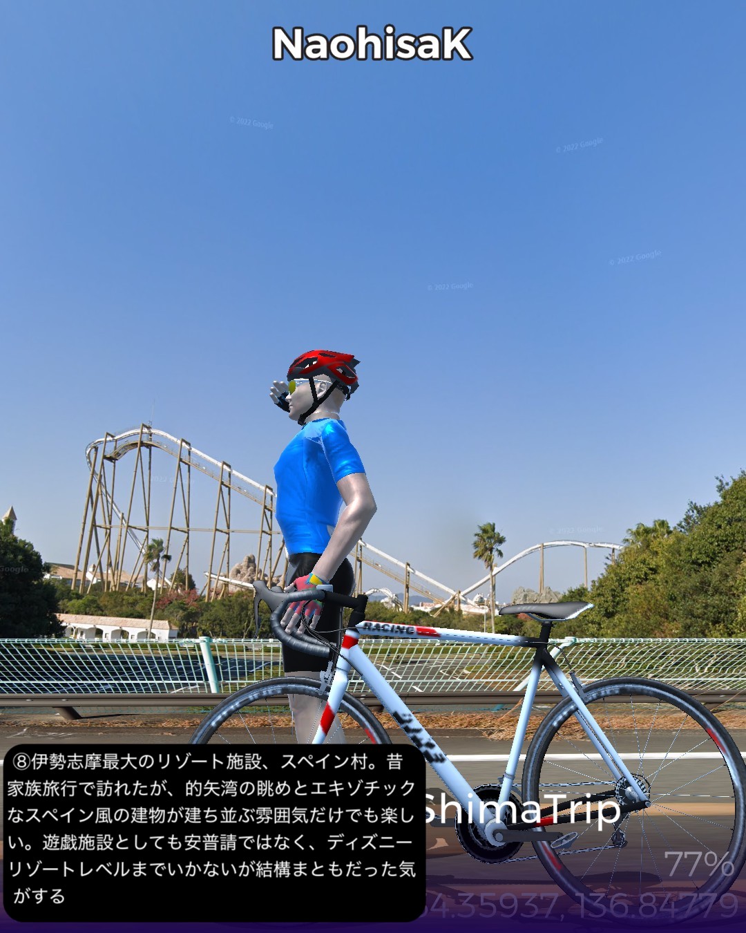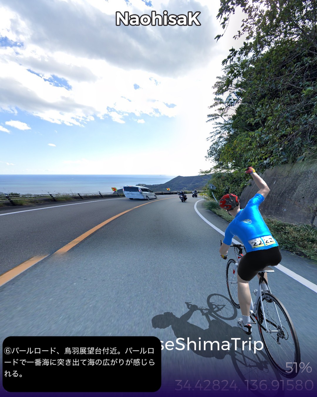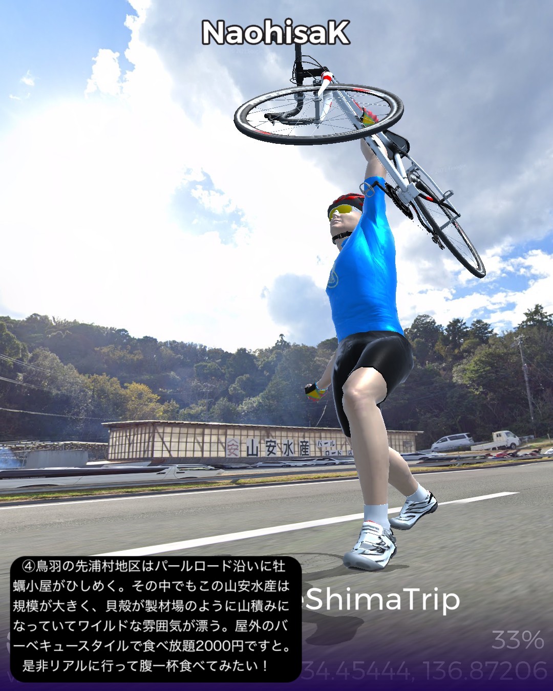 VRサイクリング番外編、伊勢志摩 1day Tripとして伊勢神宮内宮前おかげ横丁の途中を起点に鳥羽、そこから海岸沿いのパールロードを進んでスペイン村を横目に大王崎灯台まで57kmと意外と遠かった行程。鳥羽からスペイン村あたりまでのパールロードはアップダウンが激しいが、入り組んだ海岸線の眺めもよく楽しい道程だ。20年ほど前に伊勢神宮と共に鳥羽水族館やスペイン村、そしてゴールの大王崎を訪れたのを懐かしく思い出した。どこもその頃とほぼ変わっていないが、牡蠣小屋が沿道に建ち並ぶようになったのは近年ブームになって以来じゃないかな。牡蠣好きの私としてはこの辺の牡蠣小屋で煙に巻かれながらもバーベキュースタイルで牡蠣をたらふく食べてみたい。大王崎は今までに2回も訪れているが、灯台へ続く歩道がアーケード街になっていて、土産物屋や食堂、干物屋が所狭しとひしめいている雰囲気が昭和な感じで素敵だ。さて今回はあくまで番外編ということで、次回は前回ゴールとした伊勢神宮内宮をスタート地点として伊勢街道へ進む予定。