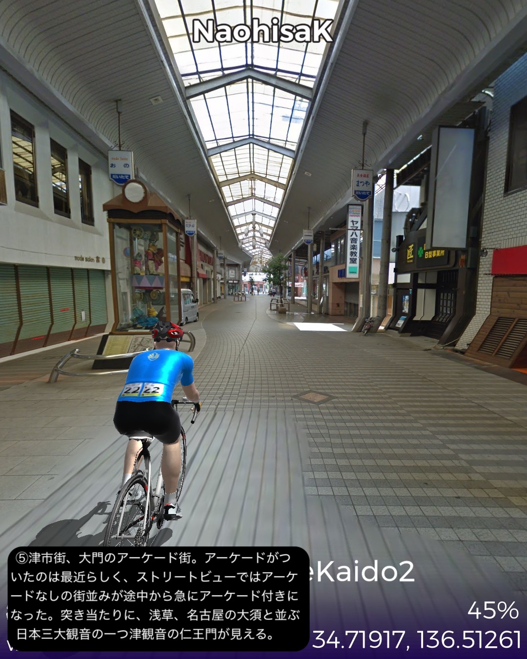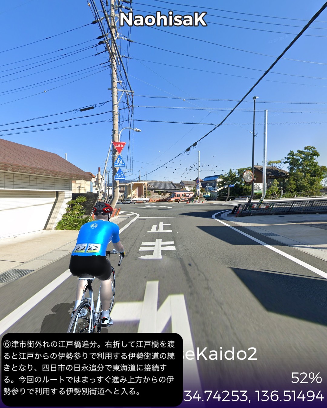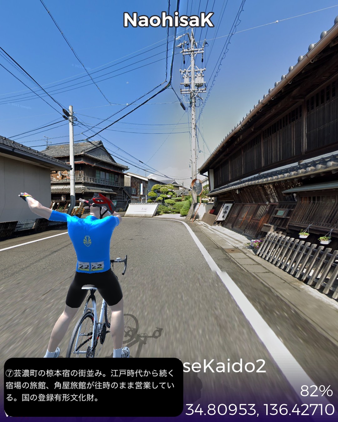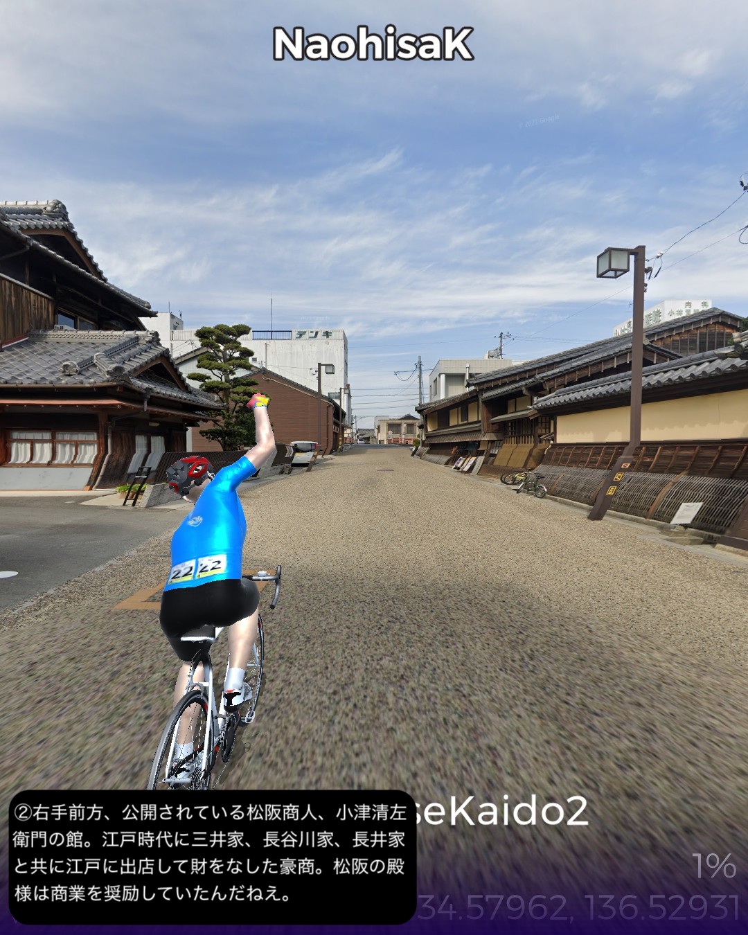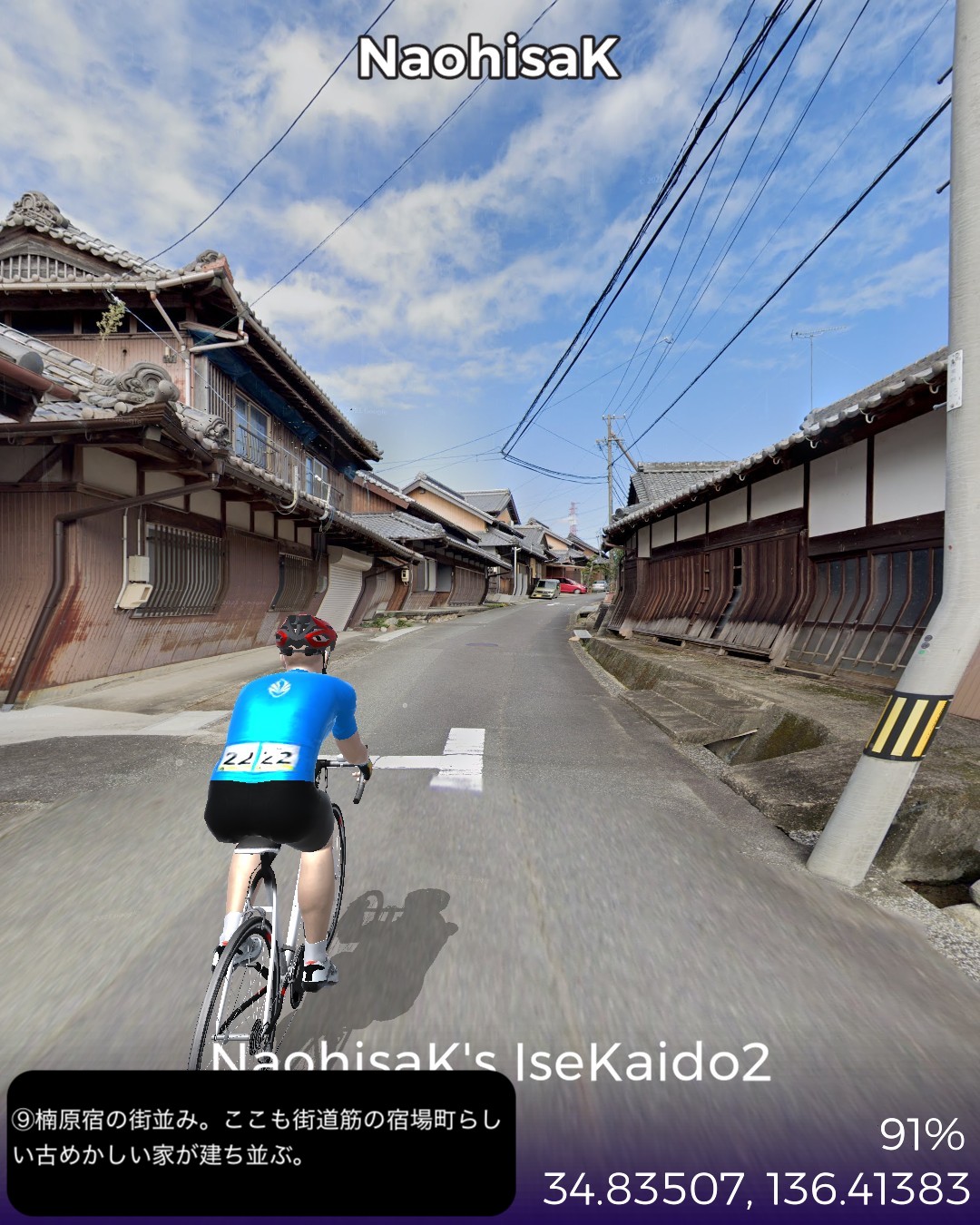 VRサイクリング 伊勢街道2日目。武士と商人の町松阪宿を出発し、三重県の県庁所在地津宿を経て、その先の江戸橋追分から内陸へ向かう伊勢別街道へ入り東海道の関宿まで41kmの行程。全国から伊勢参りをするのにこの街道に集まってくる関係上、色々な街道の接続点、追分が途中にいくつもある。初瀬街道、奈良街道と松阪宿と津宿の間で接続する。そして伊勢街道自体も津宿の先で二つに別れて江戸方面へ向かう伊勢街道と、京都方面へ向かう伊勢別街道となって両方共三重県内で東海道と接続する。昔の街道網というのは今の道路網、鉄道網と同じように整備されていたんだと今更ながらに気付かせられる。津は今まで訪れたことがなく県庁所在地としては地味なイメージだったので、役所はあっても結構小さい町じゃないかと勝手に想像していたがなかなか近代的でそこそこ大きな都市であった。内陸へ向かう伊勢別街道は長閑な田園地帯を進んでゆくが、途中の椋本や楠原など街道筋の宿場らしい情緒を残した集落があって地味に良い味を醸している。ゴールの関宿はVRサイクリングでも一昨年10月に東海道ですでに通過したが、6年ほど前にリアルに訪れて宿泊もしたので懐かしい。相変わらずの素晴らしい宿場町の景観が嬉しい。次回は関宿から始まる別の街道、大和街道で奈良方面へ向かう。