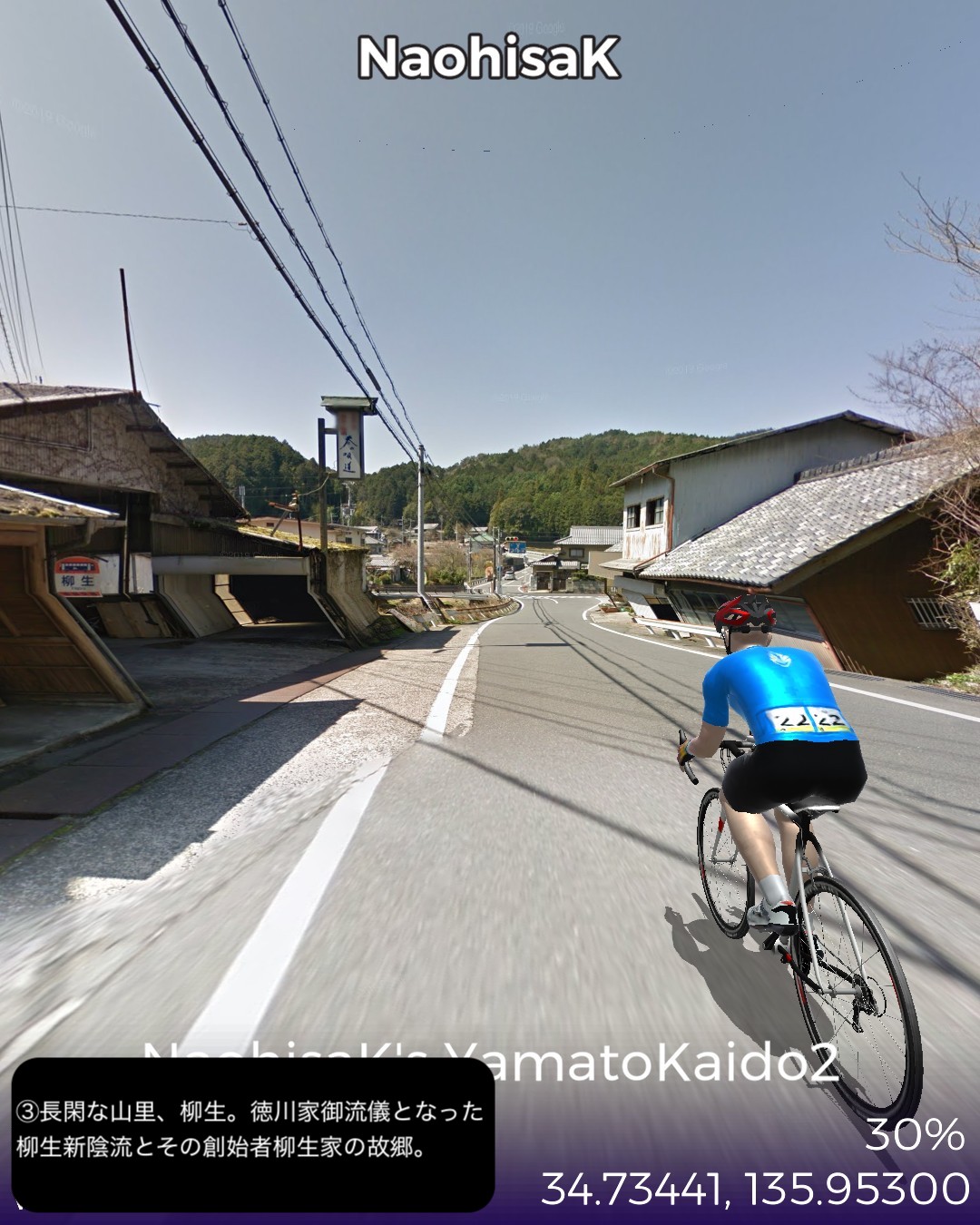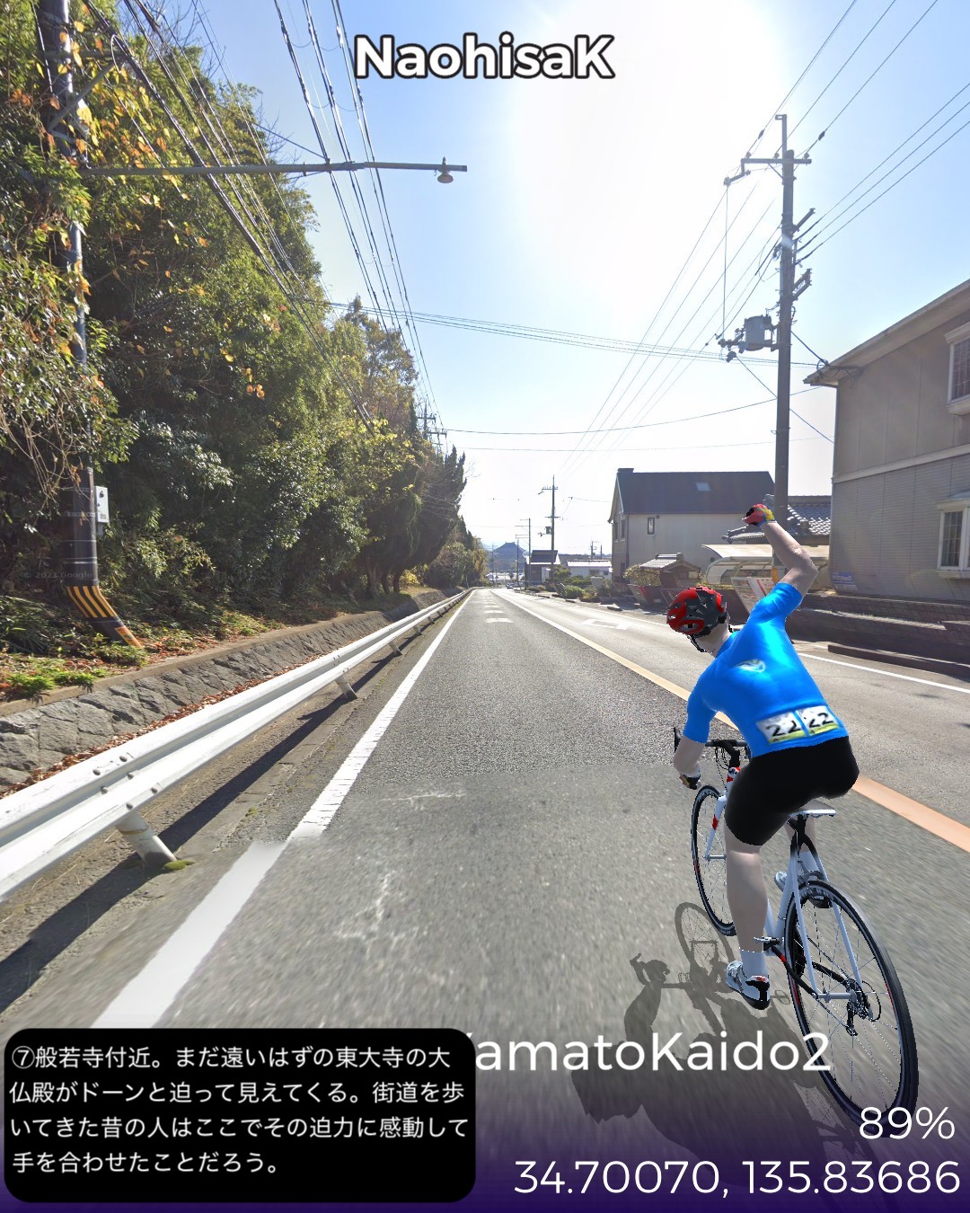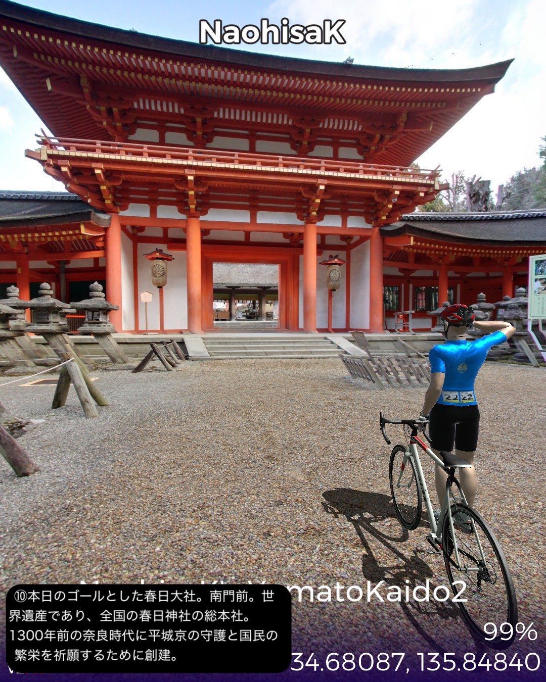 VRサイクリング、大和街道2日目。JR関西本線の月ヶ瀬口付近より奈良を目指すが、実はほとんど大和街道を逸脱して、柳生の里と当尾の岩船寺、浄瑠璃寺を経由するルートで奈良の東大寺の周囲を回り奈良公園を突っ切って春日大社に至る40kmの行程。この間、大和街道としては若干ルートの面白味に欠けるので、リアルに訪れたことのない柳生の里と当尾に寄り道してみた。これらの名所周辺でフォトジェニックな風景を期待していたのだが、今回はかなり肩透かしだったかな。良さげな場所から若干外れた場所を通っちゃってるのだよね。東大寺もぐるっと周囲を回ったが大仏殿を近くで見れる場所がなかった。唯一春日大社だけは中の中まで入ることができた。それでも途中通過してきた山里の風景には心和んだ。まあとにかく奈良まで来ました。次回からは暗越(くらがりごえ)奈良街道で再度大阪を目指すが、またまた懲りもせずその1日目は脱線寄り道名所巡り大会を予定。