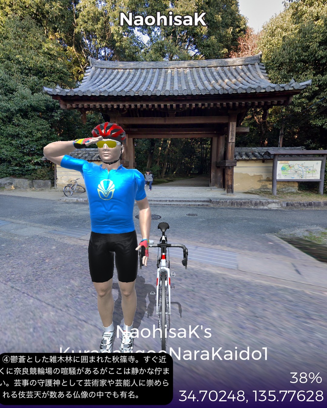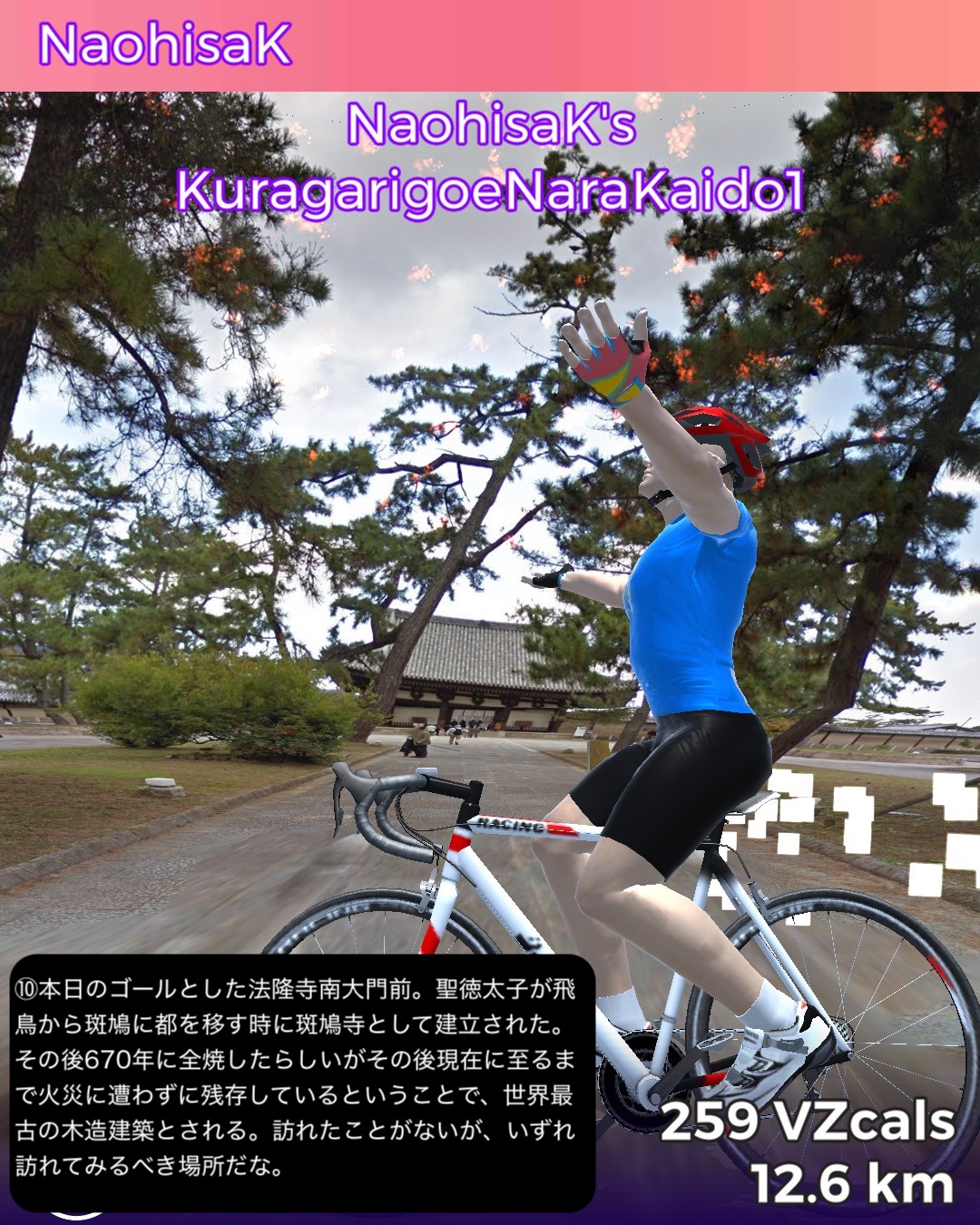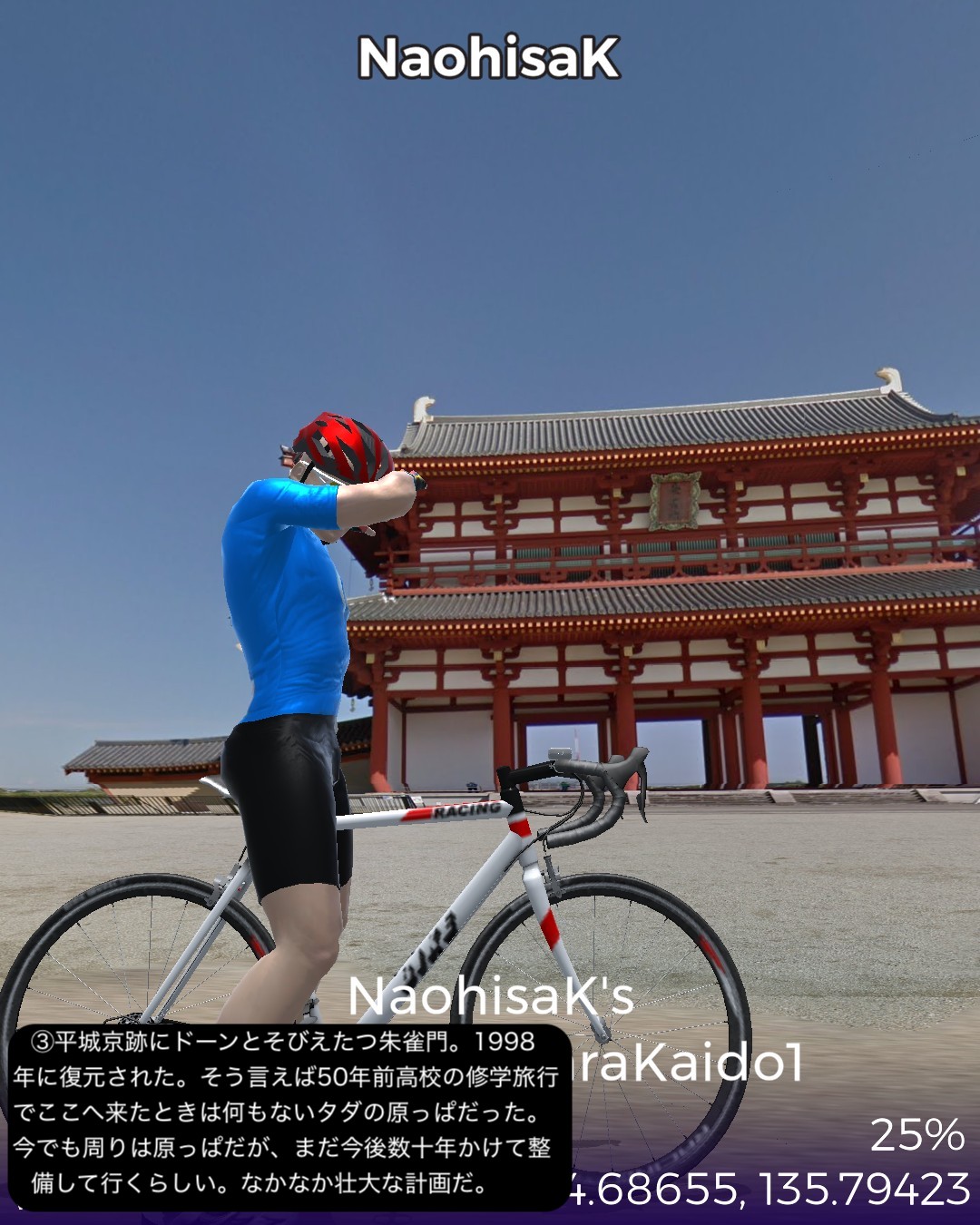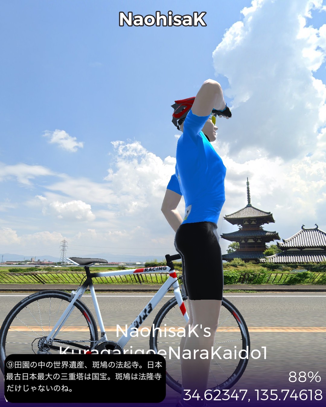 VRサイクリング 暗越(くらがりごえ)奈良街道1日目。古都奈良から再度大阪を目指すが、1日目の今回は、起点の奈良公園から平城京付近までは東へ街道を進むが、その後は奈良大和路トリップとして大和路を北から南へ縦断して名所旧跡を巡る脱線旅とあいなった。この間平城京跡、秋篠寺、西大寺、唐招提寺、薬師寺から郡山城のある大和郡山を抜けて斑鳩、法起寺、法輪寺、そしてゴールとした法隆寺まで27kmの行程。正に奈良大和路観光バスツアーのように詰め込んでみた。平城京跡は50年前(そんな前になるか)高校の修学旅行で立ち寄った時は何もない単なる草っ原だった。それが朱雀門や大極殿など朱塗りの巨大な建築物がいくつかポツポツと点在して壮大な平城京の全貌がイメージできるまでになった。後何十年かかるのかわからないが、完成形を見てみたいと切に思った。それから今まで行ったことのない斑鳩の世界遺産群が長閑な田園地帯に展開している様を体感できたのは良かった。なんとなく法隆寺とか名前がポピュラー過ぎて食わず嫌いなところもあったが、周りの雰囲気も含めて行って見たい場所となった。それにしてもたった27kmの中でこれだけのビッグネームの名所旧跡がひしめいている地域は日本広しと言えども京都とここだけであろう。次回は真面目に街道を進んで大阪へ再度入る予定。