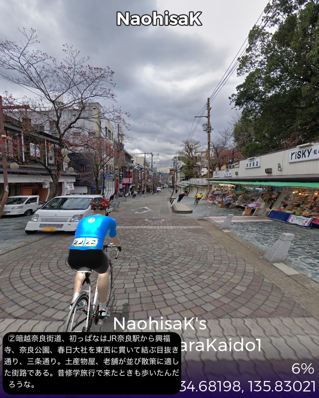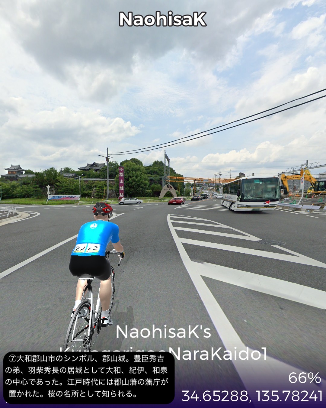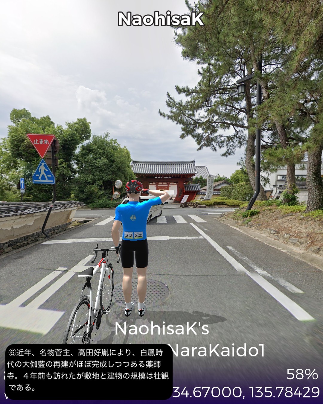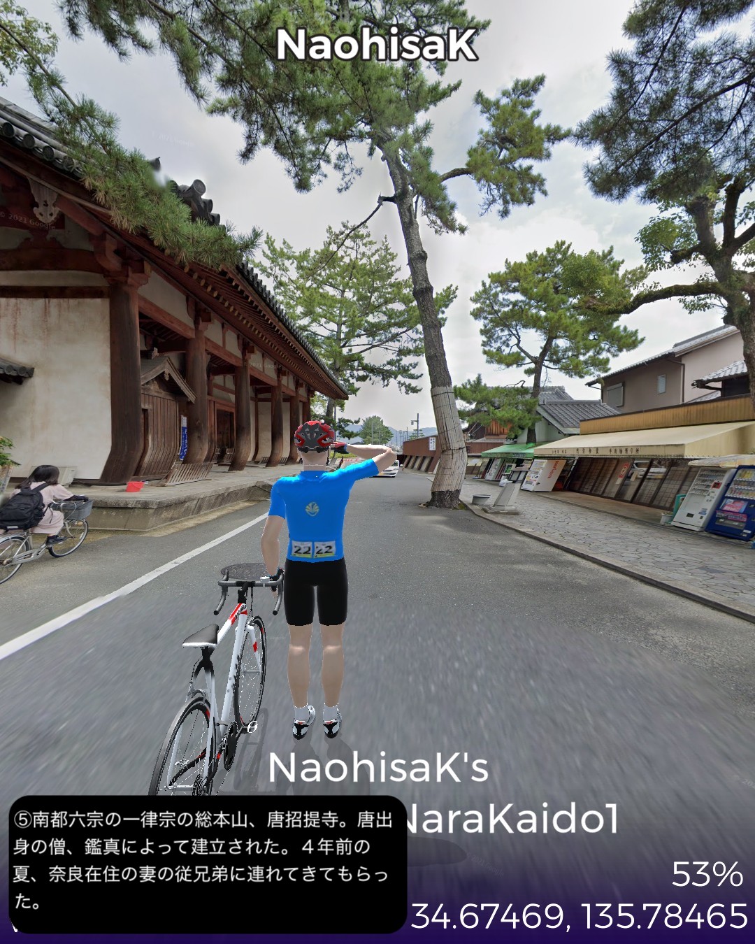 VRサイクリング 暗越(くらがりごえ)奈良街道1日目。古都奈良から再度大阪を目指すが、1日目の今回は、起点の奈良公園から平城京付近までは東へ街道を進むが、その後は奈良大和路トリップとして大和路を北から南へ縦断して名所旧跡を巡る脱線旅とあいなった。この間平城京跡、秋篠寺、西大寺、唐招提寺、薬師寺から郡山城のある大和郡山を抜けて斑鳩、法起寺、法輪寺、そしてゴールとした法隆寺まで27kmの行程。正に奈良大和路観光バスツアーのように詰め込んでみた。平城京跡は50年前(そんな前になるか)高校の修学旅行で立ち寄った時は何もない単なる草っ原だった。それが朱雀門や大極殿など朱塗りの巨大な建築物がいくつかポツポツと点在して壮大な平城京の全貌がイメージできるまでになった。後何十年かかるのかわからないが、完成形を見てみたいと切に思った。それから今まで行ったことのない斑鳩の世界遺産群が長閑な田園地帯に展開している様を体感できたのは良かった。なんとなく法隆寺とか名前がポピュラー過ぎて食わず嫌いなところもあったが、周りの雰囲気も含めて行って見たい場所となった。それにしてもたった27kmの中でこれだけのビッグネームの名所旧跡がひしめいている地域は日本広しと言えども京都とここだけであろう。次回は真面目に街道を進んで大阪へ再度入る予定。