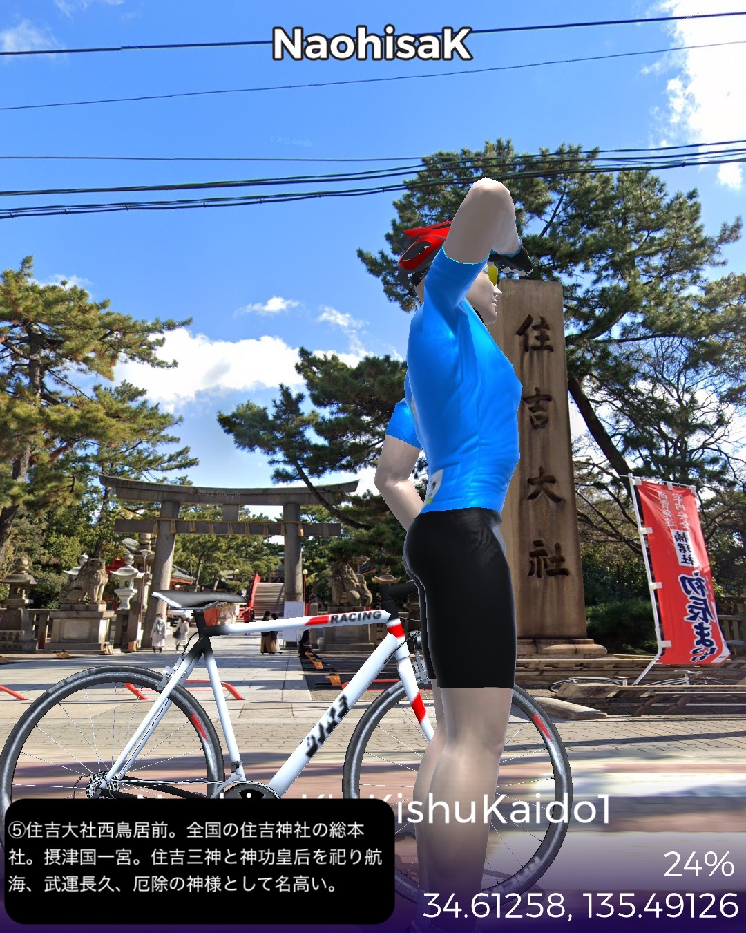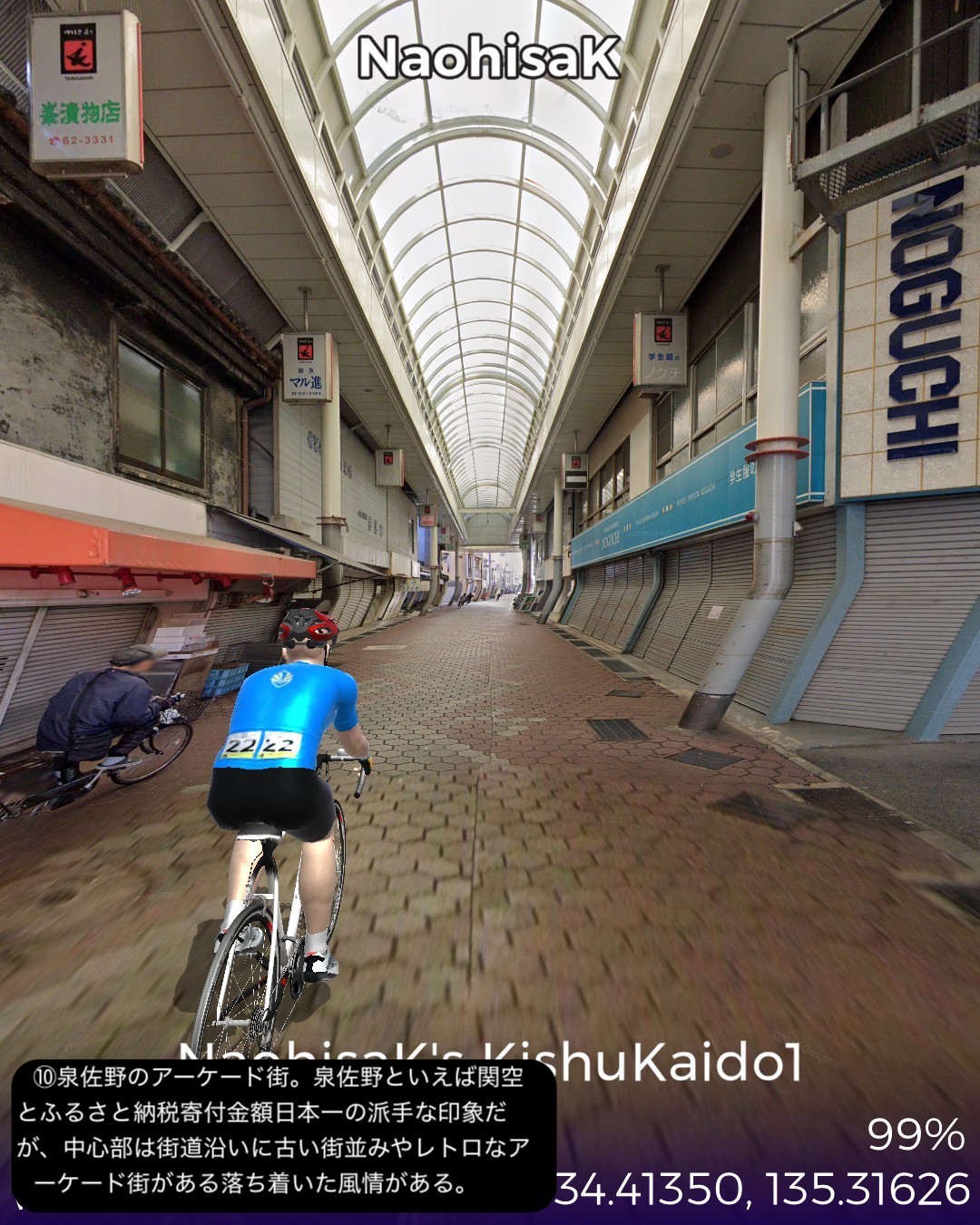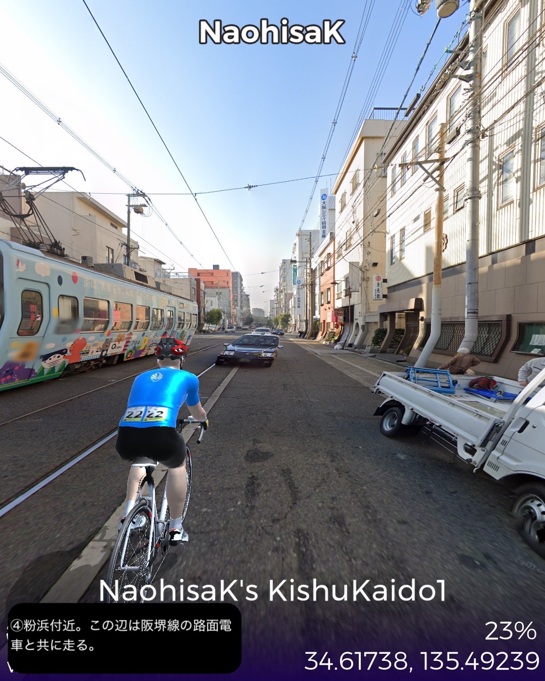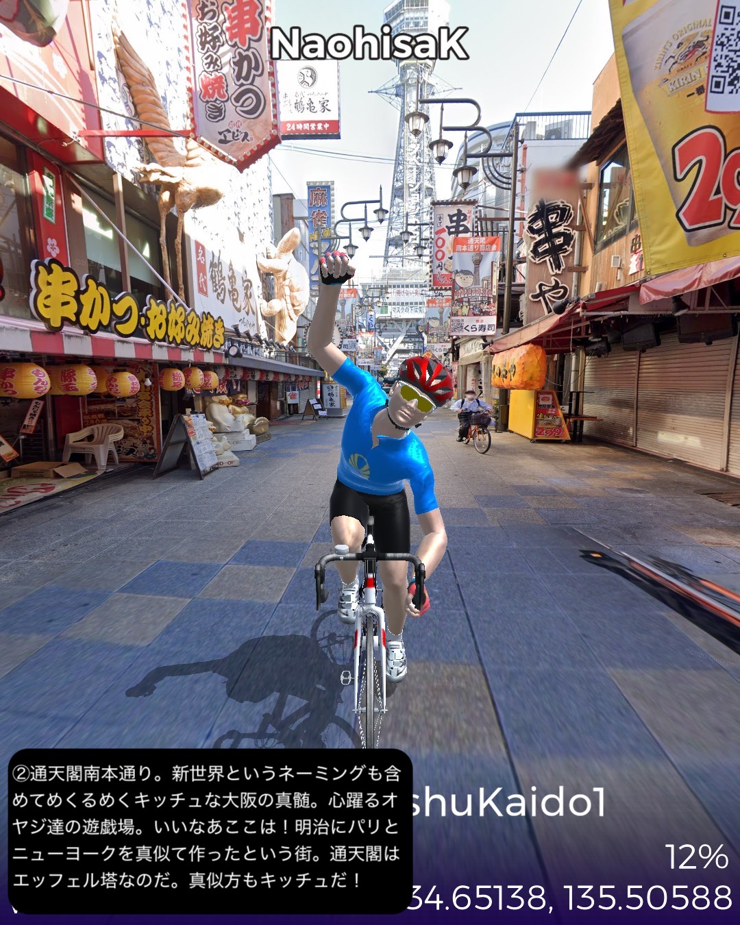 VRサイクリング 紀州街道1日目。大阪北浜を出発し日本橋、新世界、あいりん地区という大阪のコアな地域を通り抜け、阪堺線の路面電車と併走して昔の商人の町堺へ向かう。さらに泉大津、岸和田、貝塚の街並みを抜けて関空のお膝元、泉佐野に至る39kmの行程。今回街道からちょっと外れてより寄り道した、通天閣のあるいわゆる「新世界」がなぜか大阪で一番好きなスポットである。明治の頃にパリとニューヨークを真似て新世界という大胆な名前を付けたという。確かに通天閣はエッフェル塔に似ているが、最初に建造された通天閣は何と凱旋門の上にエッフェル塔を乗っけたデザインだったらしい。それでパリのエトワール広場の如く放射線状の街路になっているわけだ。それにしても雰囲気は本家と似ても似つかない似せ方をした結果浪速的なキッチュの極みの他のどこにもない雰囲気に仕上がっているのが興味深く魅惑的である。ところで今回から次回にかけて走る紀州街道は、4/3〜4/7に走った熊野古道紀伊路とほぼ1kmも離れていないところを並行する街道であるが、熊野古道が参詣のための道であるのに対し、紀州街道は徳川御三家の紀州藩の城下である和歌山に通じる参勤交代路として位置付けられる。そういう経緯からか、以前走った熊野古道は堺、岸和田、泉佐野といった町も端の方を通っていて裏の道という雰囲気であったが、紀州街道はこれらの市街のメインストリートを通る。住吉大社も熊野古道では裏手になるが紀州街道は鳥居の立つ表側を通る。その分今回の紀州街道の方がフォトジェニックな箇所が多く面白かった。次回は和歌山に進む。