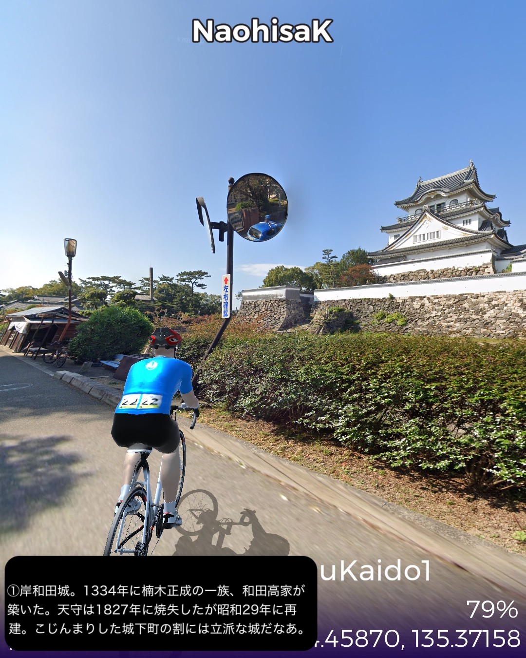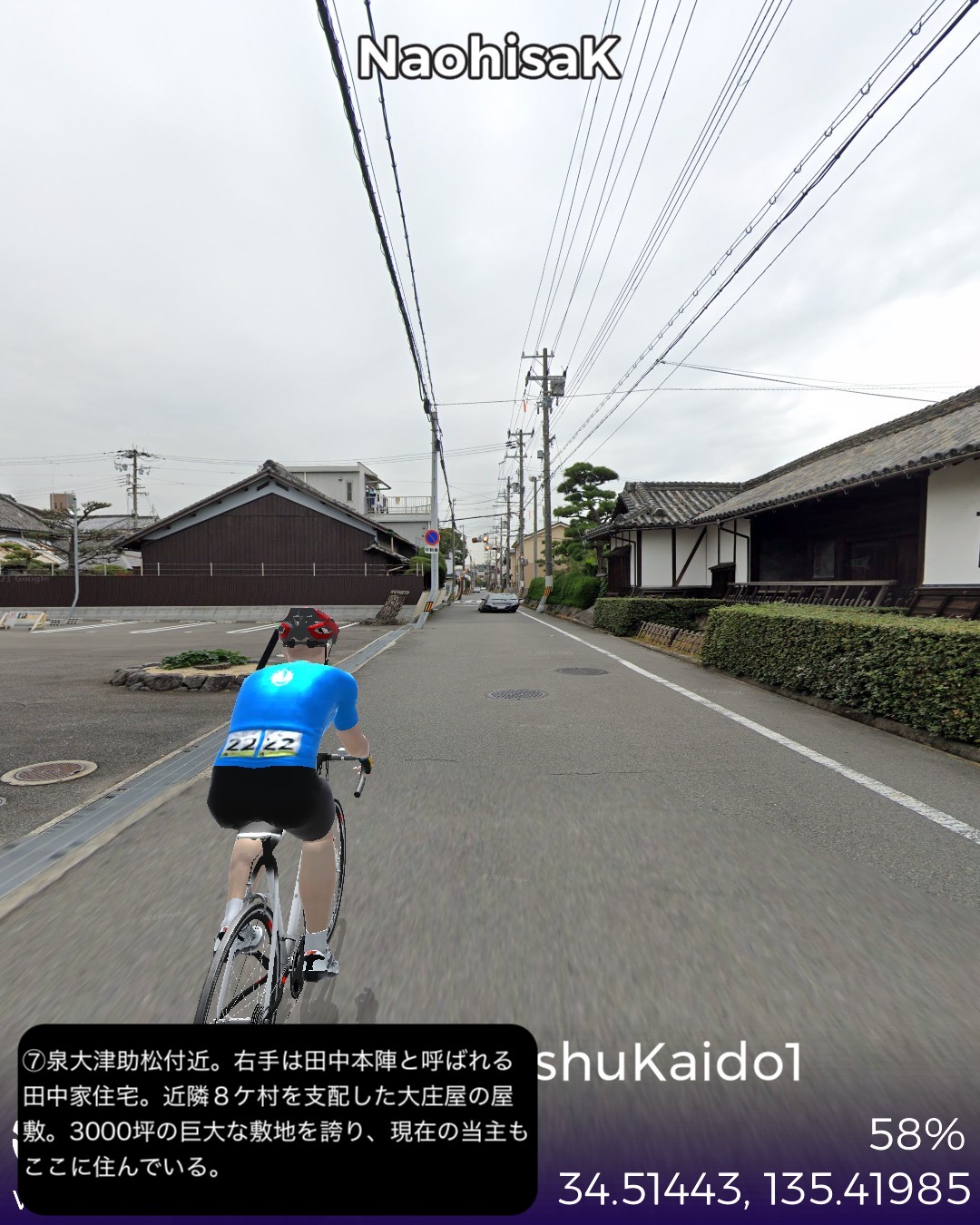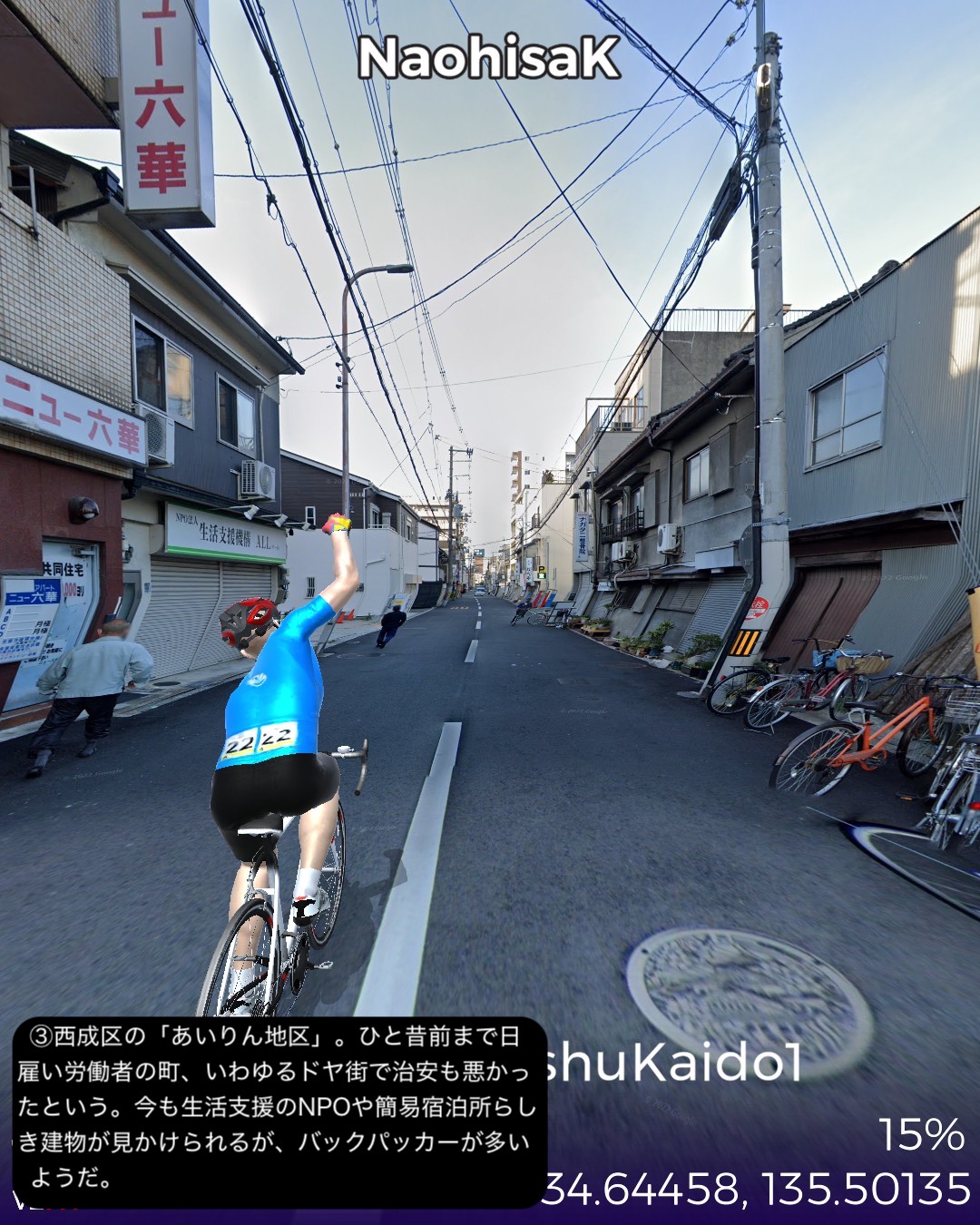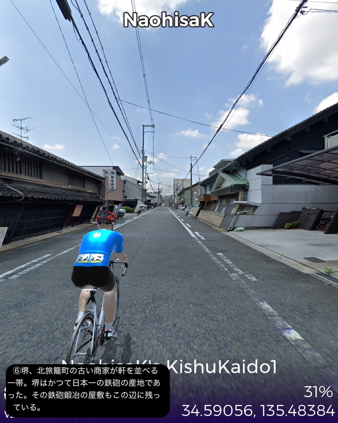 VRサイクリング 紀州街道1日目。大阪北浜を出発し日本橋、新世界、あいりん地区という大阪のコアな地域を通り抜け、阪堺線の路面電車と併走して昔の商人の町堺へ向かう。さらに泉大津、岸和田、貝塚の街並みを抜けて関空のお膝元、泉佐野に至る39kmの行程。今回街道からちょっと外れてより寄り道した、通天閣のあるいわゆる「新世界」がなぜか大阪で一番好きなスポットである。明治の頃にパリとニューヨークを真似て新世界という大胆な名前を付けたという。確かに通天閣はエッフェル塔に似ているが、最初に建造された通天閣は何と凱旋門の上にエッフェル塔を乗っけたデザインだったらしい。それでパリのエトワール広場の如く放射線状の街路になっているわけだ。それにしても雰囲気は本家と似ても似つかない似せ方をした結果浪速的なキッチュの極みの他のどこにもない雰囲気に仕上がっているのが興味深く魅惑的である。ところで今回から次回にかけて走る紀州街道は、4/3〜4/7に走った熊野古道紀伊路とほぼ1kmも離れていないところを並行する街道であるが、熊野古道が参詣のための道であるのに対し、紀州街道は徳川御三家の紀州藩の城下である和歌山に通じる参勤交代路として位置付けられる。そういう経緯からか、以前走った熊野古道は堺、岸和田、泉佐野といった町も端の方を通っていて裏の道という雰囲気であったが、紀州街道はこれらの市街のメインストリートを通る。住吉大社も熊野古道では裏手になるが紀州街道は鳥居の立つ表側を通る。その分今回の紀州街道の方がフォトジェニックな箇所が多く面白かった。次回は和歌山に進む。