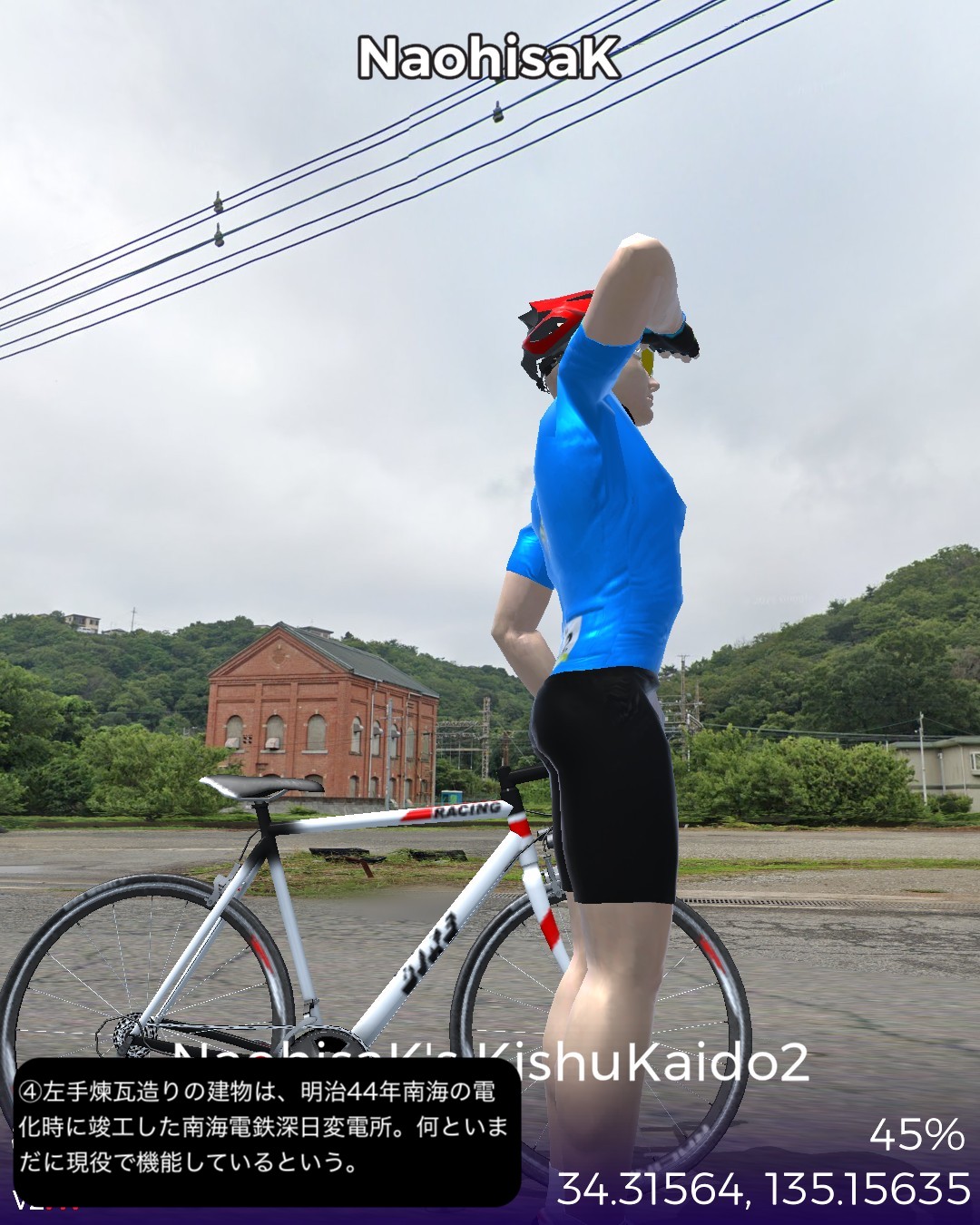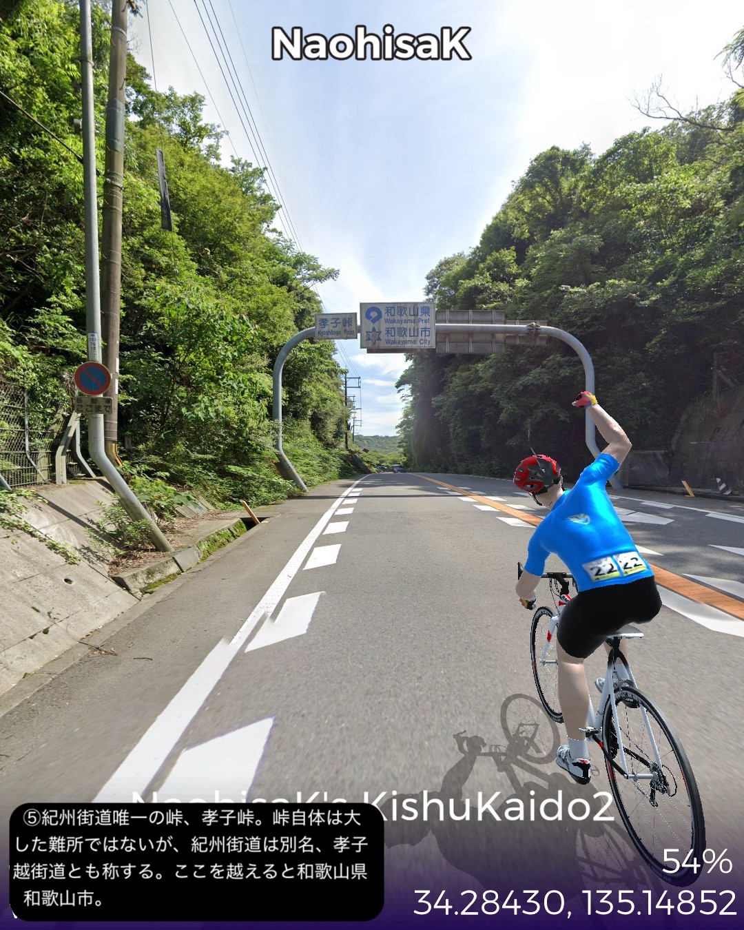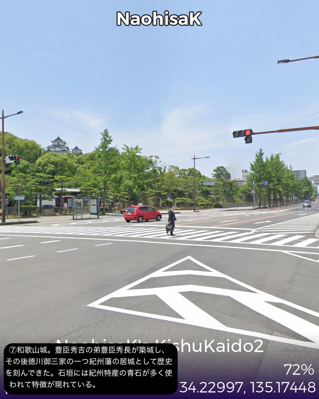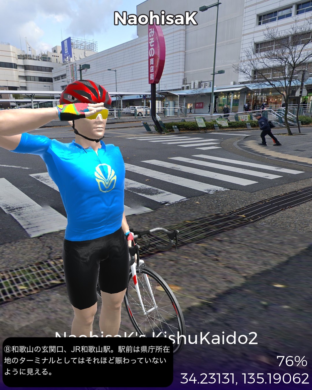 VRサイクリング 紀州街道2日目。泉佐野をスタートし、華やかなりんくうタウンを右手に感じつつ古い家並が点在する地味な街道を大阪湾に沿って進む。泉南市、阪南市を通りすぎ大阪府最南端の岬町まで進んだ後、山の中へ入り孝子峠を越えて和歌山市へ下ってゆく。和歌山では、紀ノ川を渡り市街地を進み、紀州街道終点の京橋からさらにAdditional tourで和歌山城、和歌山駅を巡った後、日本遺産に選出された天下の絶景、和歌浦を見晴らす紀州東照宮をゴールとする47kmの行程。和歌山市はリアルに行ったことがない町であるが、中心街が薄い割りに市街地が広いのが印象に残った。ビル街や洗練された繁華街がほとんど見当たらなかったが、低層の住宅や商店、町工場、所々にマンションという感じの密集した街並みがどこまでも続いている。そうした分厚い市街地の端の浜辺が和歌浦という古代からの景勝地となっている。次回からは和歌山をスタートして紀ノ川沿いに和歌山街道で東へ進む。
