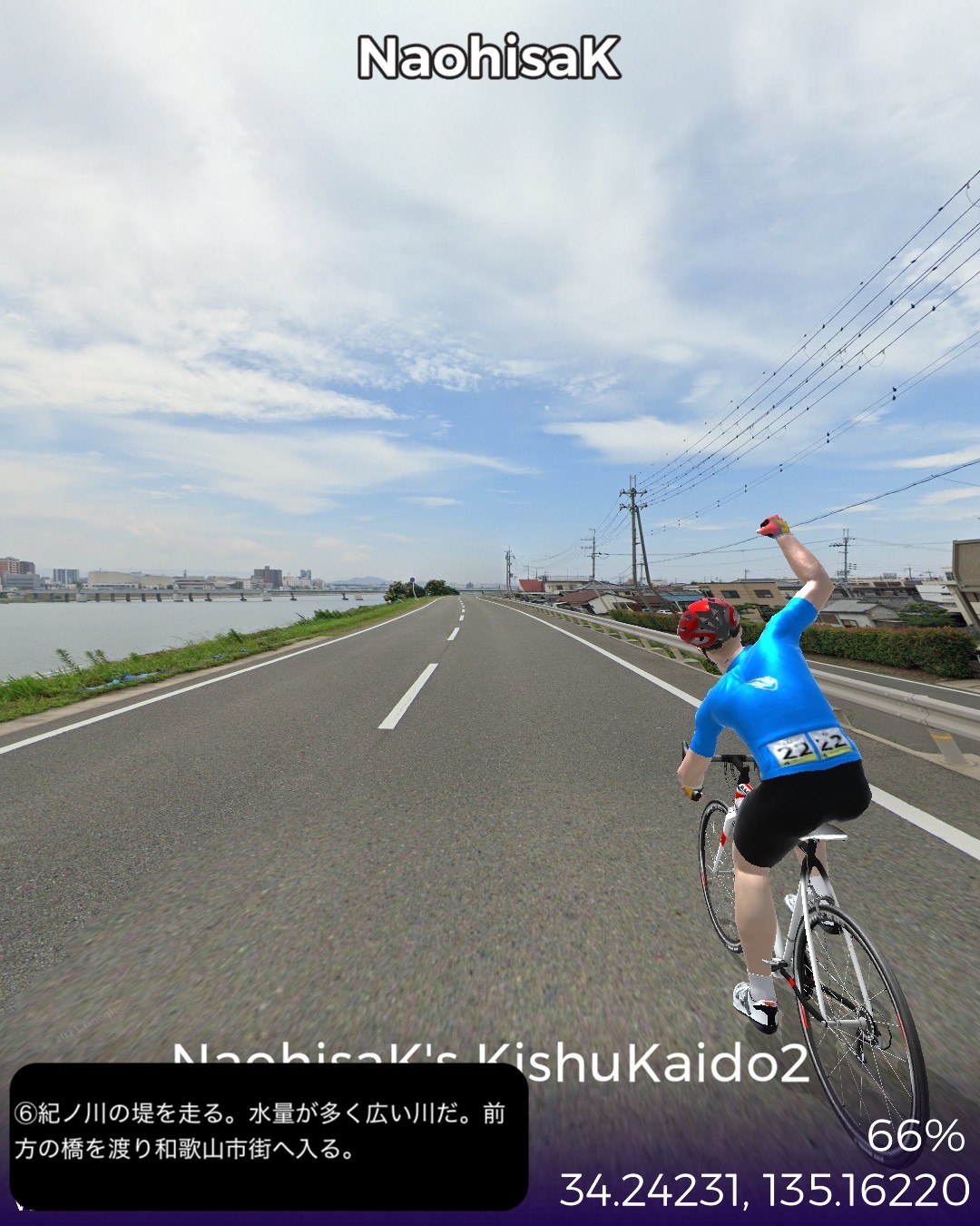 VRサイクリング 紀州街道2日目。泉佐野をスタートし、華やかなりんくうタウンを右手に感じつつ古い家並が点在する地味な街道を大阪湾に沿って進む。泉南市、阪南市を通りすぎ大阪府最南端の岬町まで進んだ後、山の中へ入り孝子峠を越えて和歌山市へ下ってゆく。和歌山では、紀ノ川を渡り市街地を進み、紀州街道終点の京橋からさらにAdditional tourで和歌山城、和歌山駅を巡った後、日本遺産に選出された天下の絶景、和歌浦を見晴らす紀州東照宮をゴールとする47kmの行程。和歌山市はリアルに行ったことがない町であるが、中心街が薄い割りに市街地が広いのが印象に残った。ビル街や洗練された繁華街がほとんど見当たらなかったが、低層の住宅や商店、町工場、所々にマンションという感じの密集した街並みがどこまでも続いている。そうした分厚い市街地の端の浜辺が和歌浦という古代からの景勝地となっている。次回からは和歌山をスタートして紀ノ川沿いに和歌山街道で東へ進む。