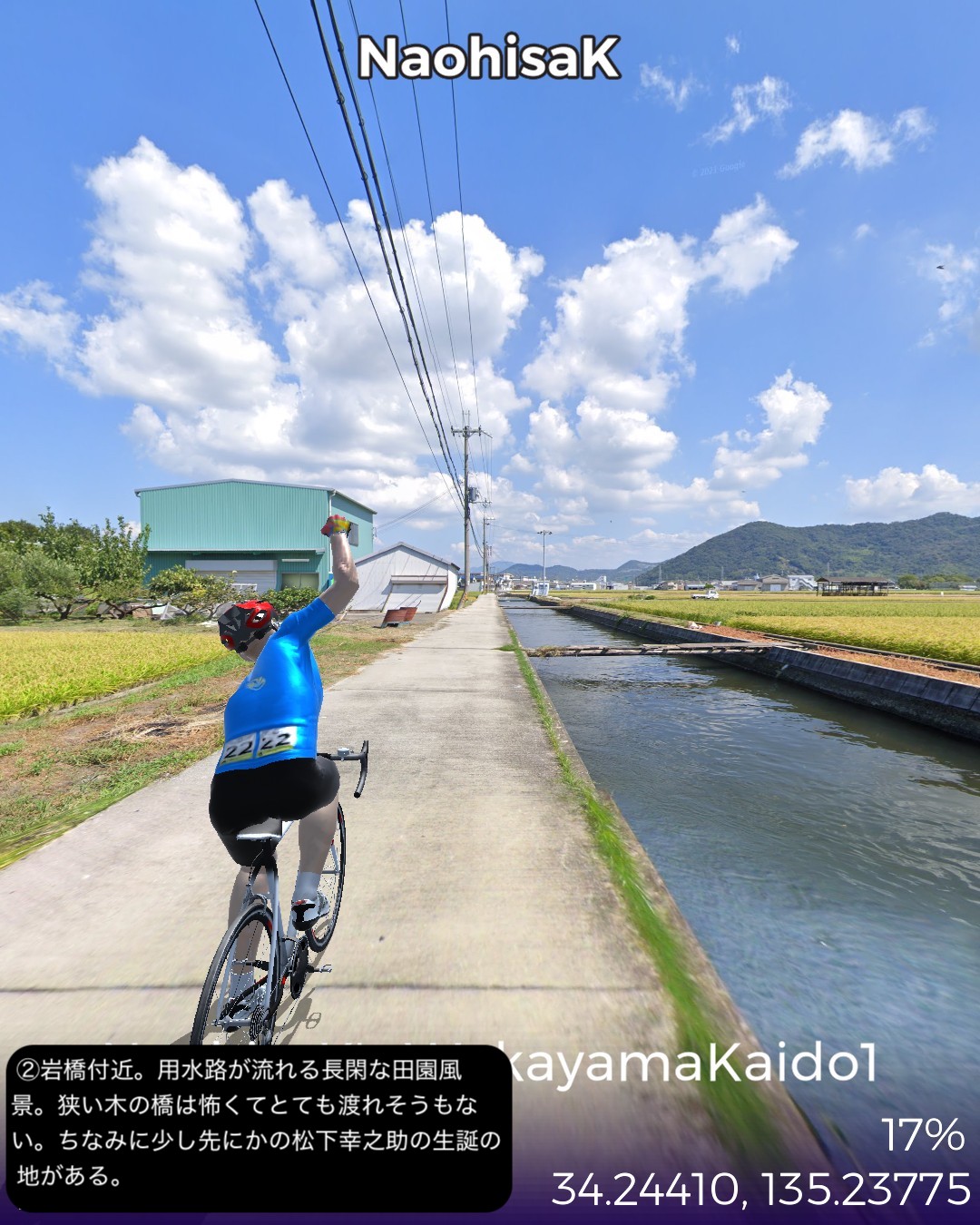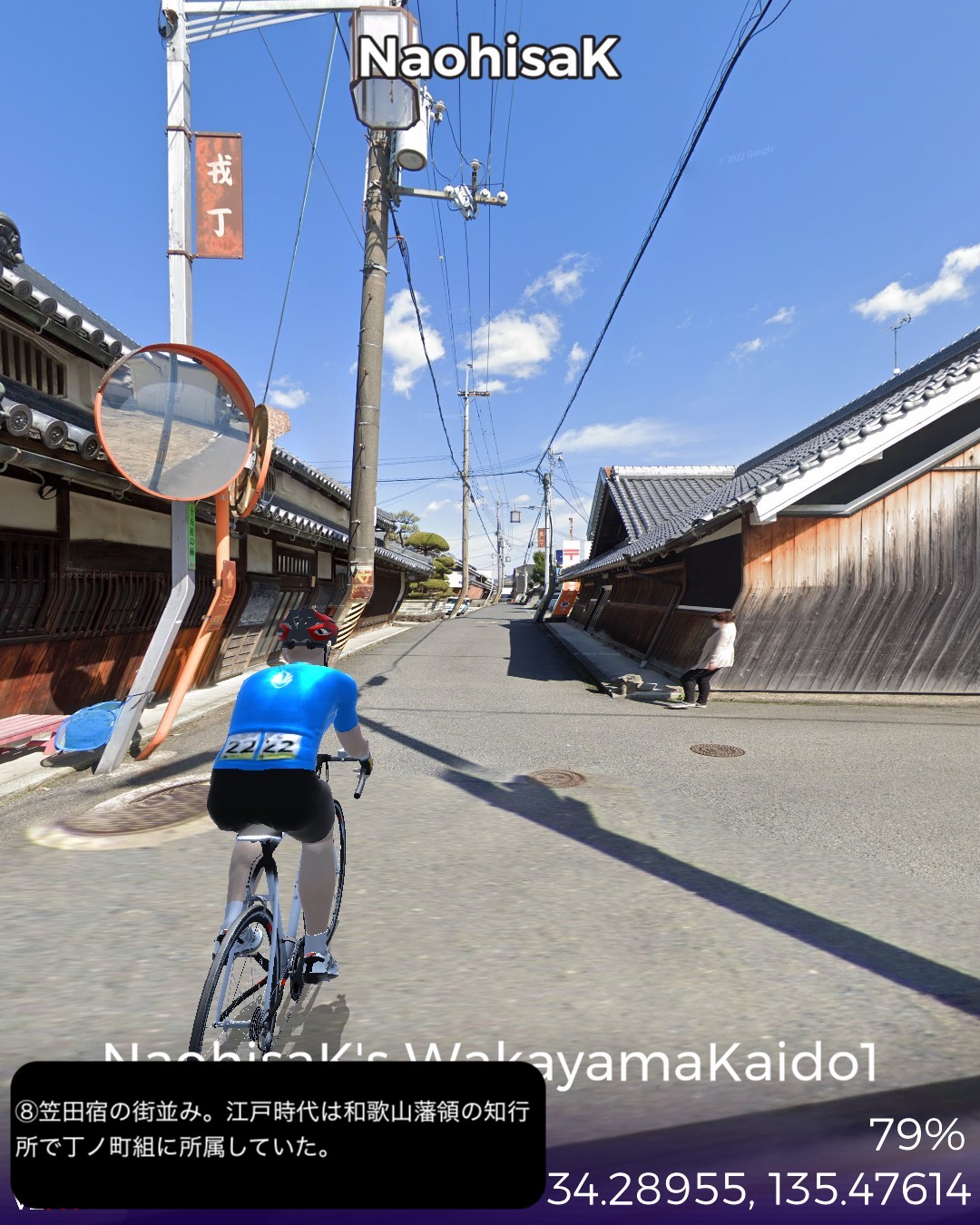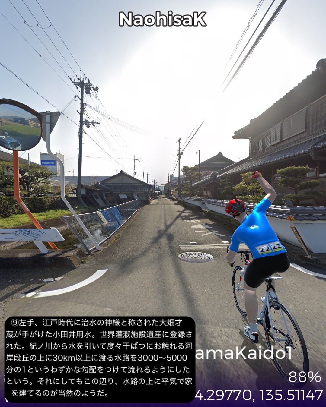 VRサイクリング 和歌山街道1日目。和歌山から紀ノ川沿いの和歌山街道を走って、岩出市の清水宿、紀ノ川市の名手宿、かつらぎ市の笠田宿を経て橋本市の高野口に至る40kmの行程。今更ではあるが、日本の旧街道はどうやら本来相対的な名称が使われることが多く全国的にユニークな名称になっていないようだ。例えば今回和歌山街道と称しているのは本来三重県だけで、今回走った和歌山県内では伊勢街道とか大和街道と呼ばれていた。つまりその場所から街道でたどり着く土地の名前で称することが一般的である。現在では旧街道を区別するためにとりあえず便宜上ユニークな名称が使われているが、それも特に国土交通省が定めたというわけでなく曖昧に多く使われている名称を利用している感じである。その和歌山街道であるが、御三家の紀州藩の参勤交代のルートとして利用されていたらしく、途中の清水宿、名手宿、笠田宿など宿場町の名残が濃い古い家並みが見られる。街道沿いに用水路がずっと続いているところがあってちょっと調べてみると、紀ノ川右岸の河岸段丘の上は昔干ばつが多かったのを、江戸時代に治水の神様と称された大畑才蔵が紀ノ川から水を引いて河岸段丘の上30数kmに渡る用水路を引いて、豊かな田園地帯に変えたという。小田井用水として世界灌漑施設遺産に登録されている。面白いのは街道脇の用水路上に延々と家を建てて有効利用を図っている地域があったのだが、それは用水路上を管理している地方自治体が借地させているということなのか、勝手に建てているのか?建築物の強度とか防災上問題ないのか、色々興味は尽きないのであった。次回は一旦和歌山街道を進むのを止めて高野山参詣道で高野山を巡礼する。