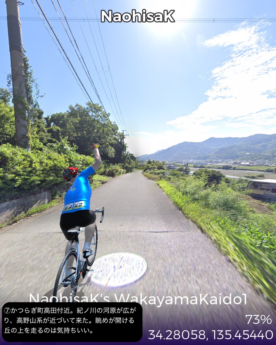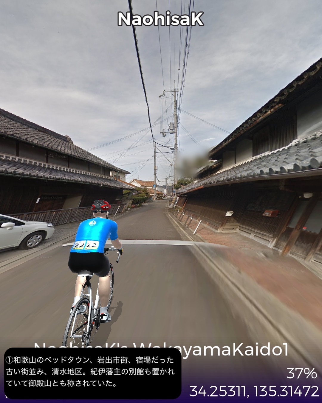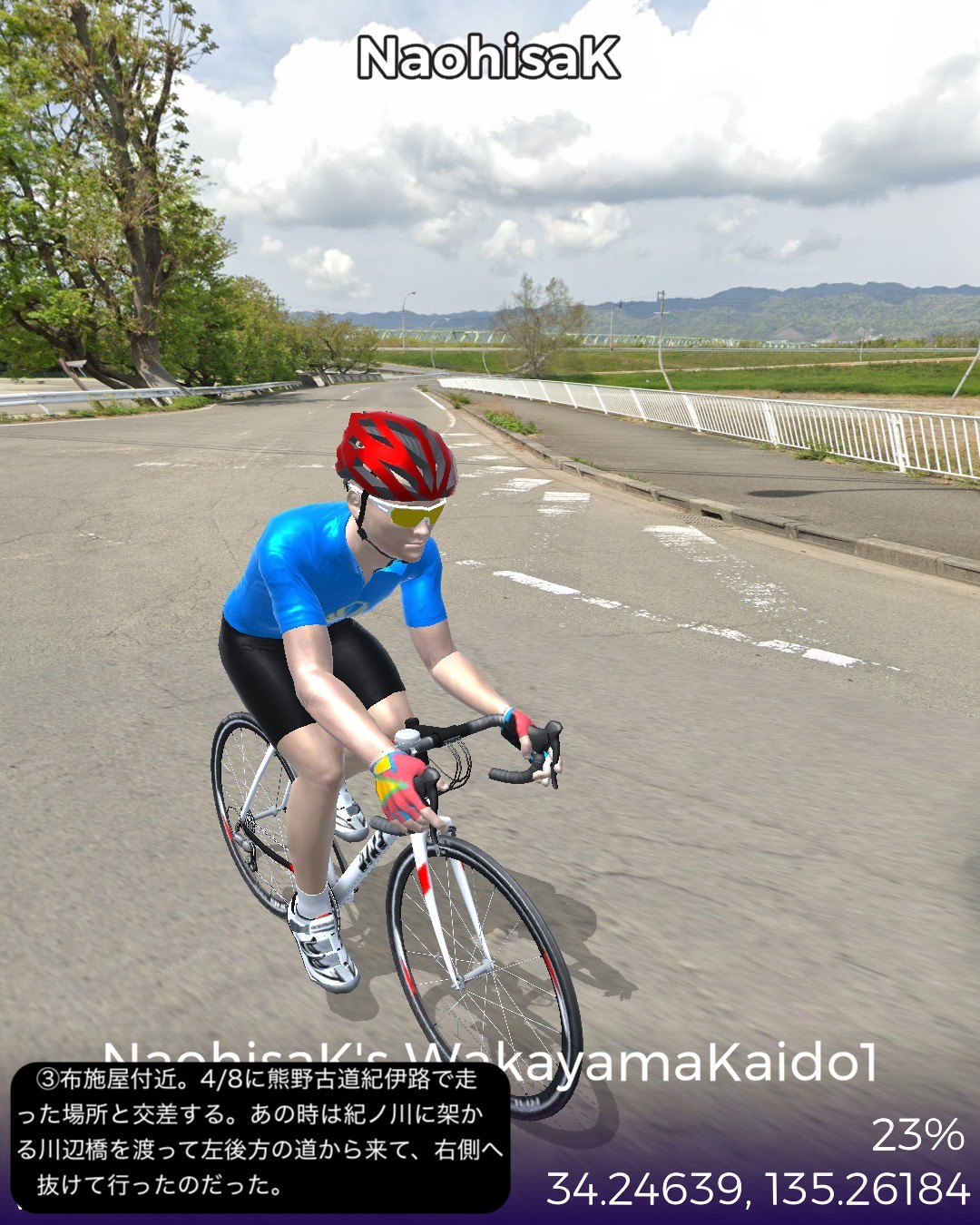 VRサイクリング 和歌山街道1日目。和歌山から紀ノ川沿いの和歌山街道を走って、岩出市の清水宿、紀ノ川市の名手宿、かつらぎ市の笠田宿を経て橋本市の高野口に至る40kmの行程。今更ではあるが、日本の旧街道はどうやら本来相対的な名称が使われることが多く全国的にユニークな名称になっていないようだ。例えば今回和歌山街道と称しているのは本来三重県だけで、今回走った和歌山県内では伊勢街道とか大和街道と呼ばれていた。つまりその場所から街道でたどり着く土地の名前で称することが一般的である。現在では旧街道を区別するためにとりあえず便宜上ユニークな名称が使われているが、それも特に国土交通省が定めたというわけでなく曖昧に多く使われている名称を利用している感じである。その和歌山街道であるが、御三家の紀州藩の参勤交代のルートとして利用されていたらしく、途中の清水宿、名手宿、笠田宿など宿場町の名残が濃い古い家並みが見られる。街道沿いに用水路がずっと続いているところがあってちょっと調べてみると、紀ノ川右岸の河岸段丘の上は昔干ばつが多かったのを、江戸時代に治水の神様と称された大畑才蔵が紀ノ川から水を引いて河岸段丘の上30数kmに渡る用水路を引いて、豊かな田園地帯に変えたという。小田井用水として世界灌漑施設遺産に登録されている。面白いのは街道脇の用水路上に延々と家を建てて有効利用を図っている地域があったのだが、それは用水路上を管理している地方自治体が借地させているということなのか、勝手に建てているのか?建築物の強度とか防災上問題ないのか、色々興味は尽きないのであった。次回は一旦和歌山街道を進むのを止めて高野山参詣道で高野山を巡礼する。