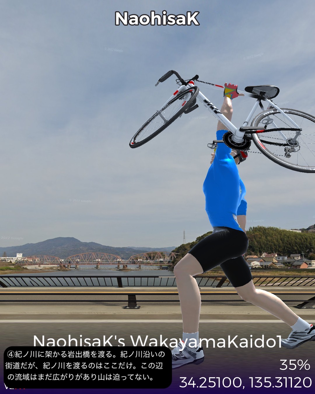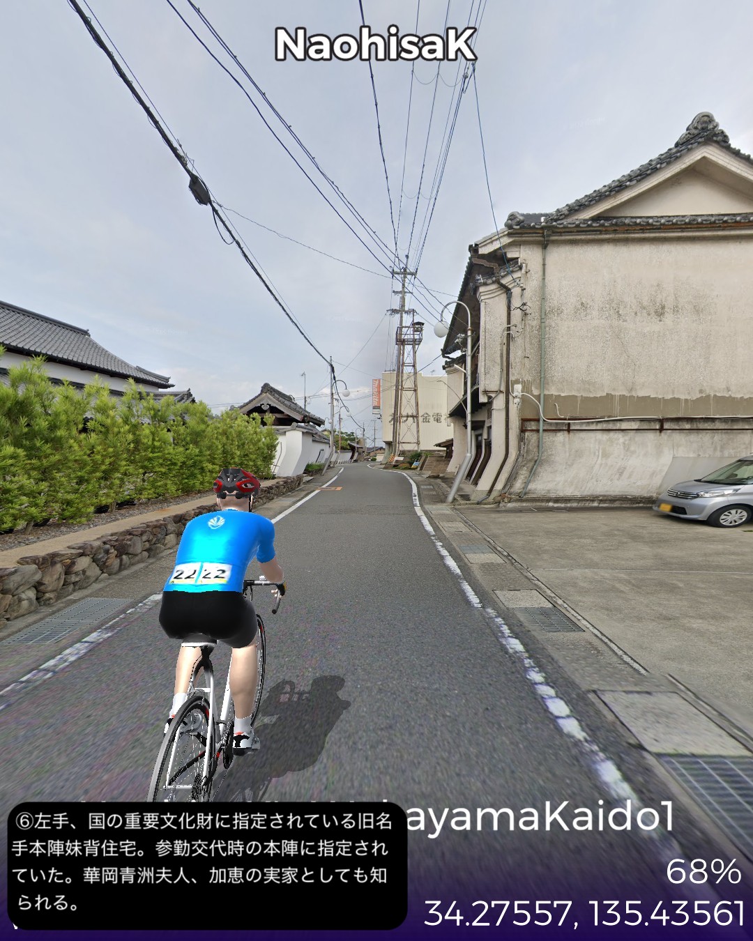 VRサイクリング 和歌山街道1日目。和歌山から紀ノ川沿いの和歌山街道を走って、岩出市の清水宿、紀ノ川市の名手宿、かつらぎ市の笠田宿を経て橋本市の高野口に至る40kmの行程。今更ではあるが、日本の旧街道はどうやら本来相対的な名称が使われることが多く全国的にユニークな名称になっていないようだ。例えば今回和歌山街道と称しているのは本来三重県だけで、今回走った和歌山県内では伊勢街道とか大和街道と呼ばれていた。つまりその場所から街道でたどり着く土地の名前で称することが一般的である。現在では旧街道を区別するためにとりあえず便宜上ユニークな名称が使われているが、それも特に国土交通省が定めたというわけでなく曖昧に多く使われている名称を利用している感じである。その和歌山街道であるが、御三家の紀州藩の参勤交代のルートとして利用されていたらしく、途中の清水宿、名手宿、笠田宿など宿場町の名残が濃い古い家並みが見られる。街道沿いに用水路がずっと続いているところがあってちょっと調べてみると、紀ノ川右岸の河岸段丘の上は昔干ばつが多かったのを、江戸時代に治水の神様と称された大畑才蔵が紀ノ川から水を引いて河岸段丘の上30数kmに渡る用水路を引いて、豊かな田園地帯に変えたという。小田井用水として世界灌漑施設遺産に登録されている。面白いのは街道脇の用水路上に延々と家を建てて有効利用を図っている地域があったのだが、それは用水路上を管理している地方自治体が借地させているということなのか、勝手に建てているのか?建築物の強度とか防災上問題ないのか、色々興味は尽きないのであった。次回は一旦和歌山街道を進むのを止めて高野山参詣道で高野山を巡礼する。