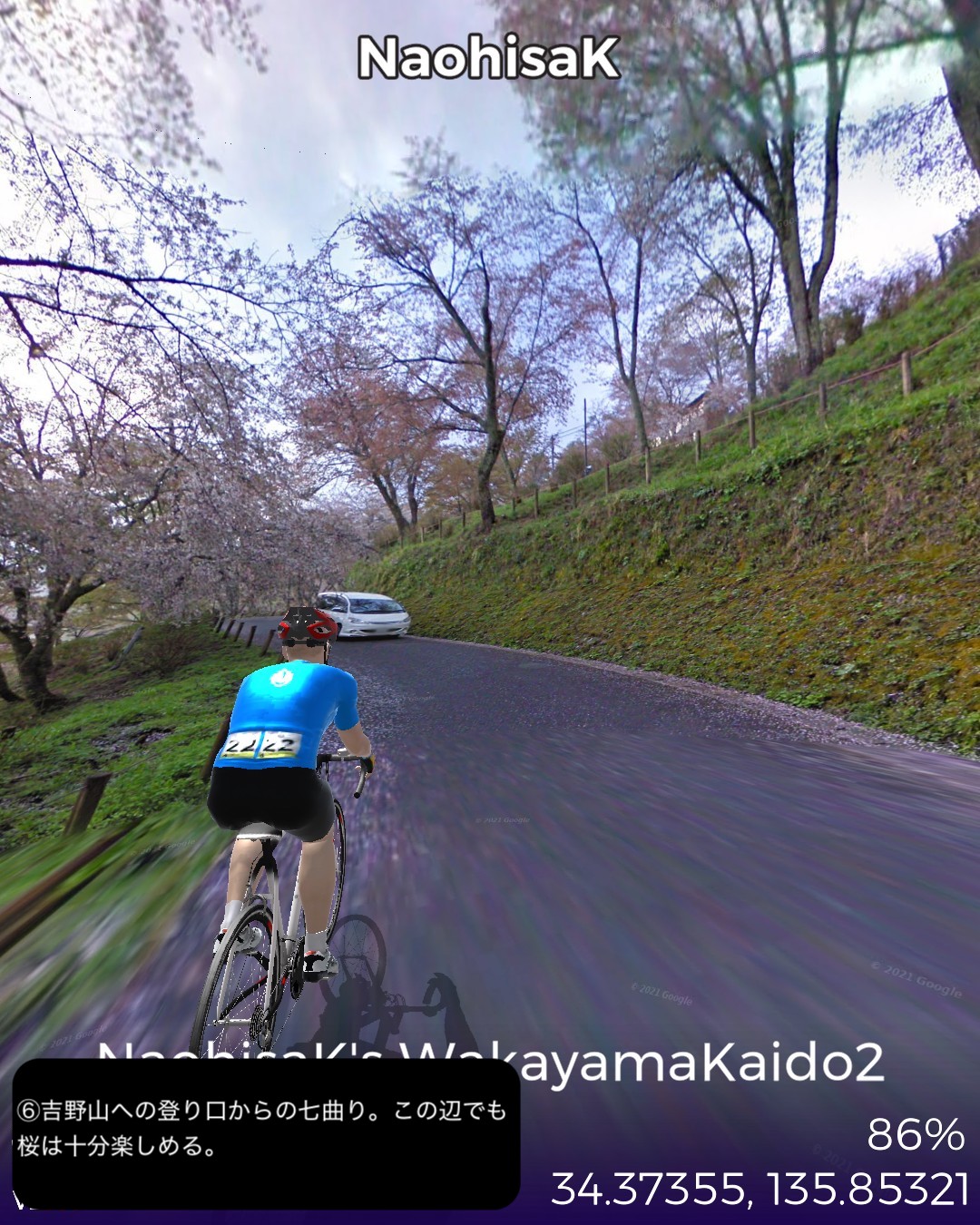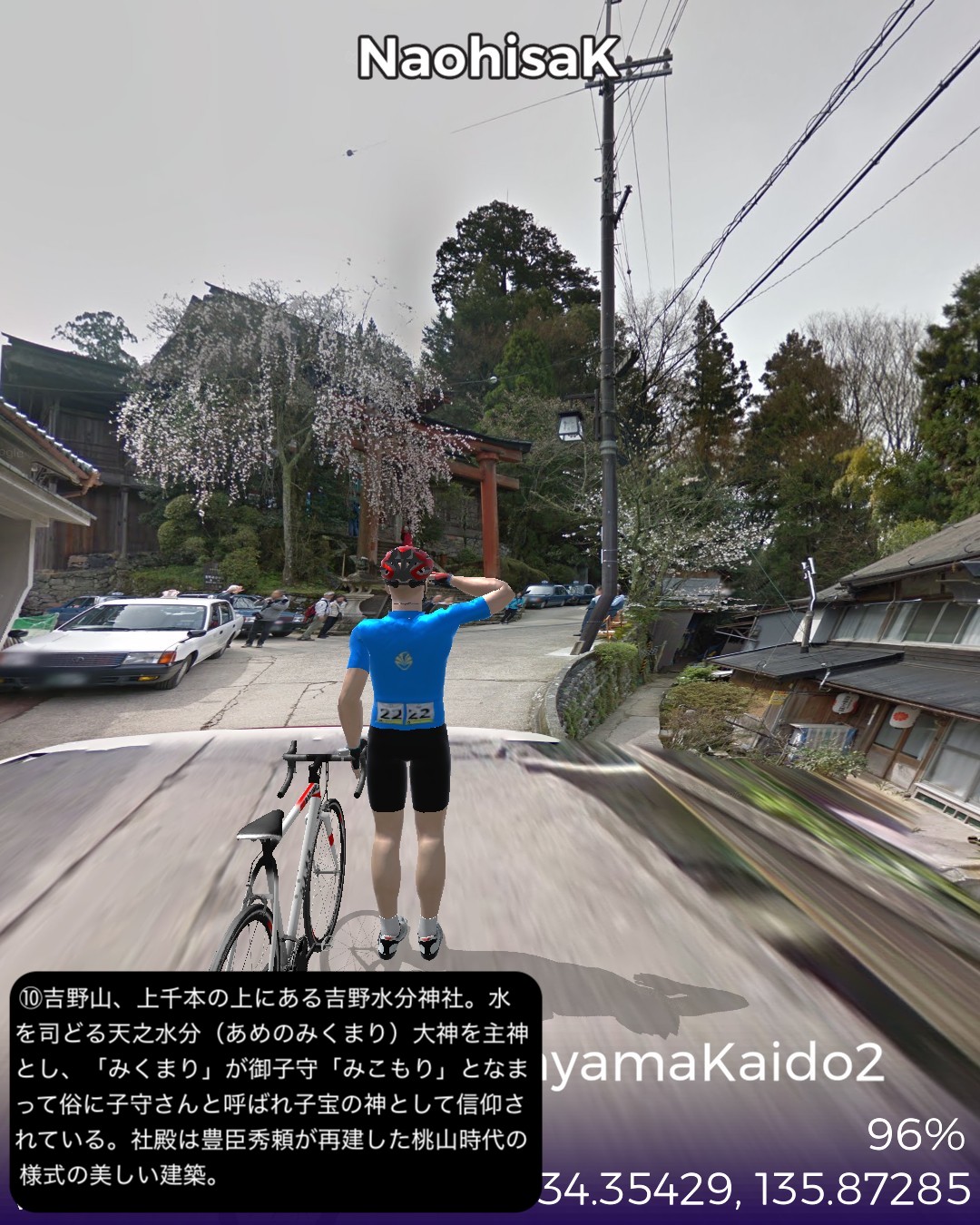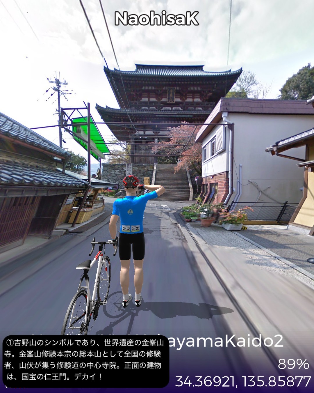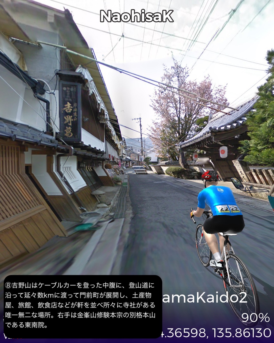VRサイクリング 和歌山街道2日目。高野口から街道の旅を続けよう。高野山参拝の表玄関として、また交通の要衝として発展した橋本、江戸幕府の天領として発展した五條を経て、天下の桜の名所吉野山の頂上に近い金峯神社に至る40kmの行程。橋本と五條は共に街道筋に古い町屋が立ち並び、これぞ旧街道という情緒を醸し出していて良かった。和歌山街道としては高野山と同様吉野山への入り口をかすめるだけであるが、また寄り道シリーズとして吉野山を登れるところまで登ってみた。ストリートビューが期待通り桜のシーズンの映像でまとまっており、素晴らしい景観を楽しめた。桜の名所は数々あれどこれだけ全山が桜のパッチワークで飾られる山は他にないであろう。また山の中腹に登山道に沿って数km続く土産物屋、旅館、飲食店と所々に寺社がある門前町が展開する場所も他に見たことがない。世界遺産としてのインパクトのある魅力的な観光地であった。ここも是非リアルに開花シーズンに訪れてみたいものだ。次回以降しばらく地味な展開が予想されるが和歌山街道をさらに東へ進んでゆく。