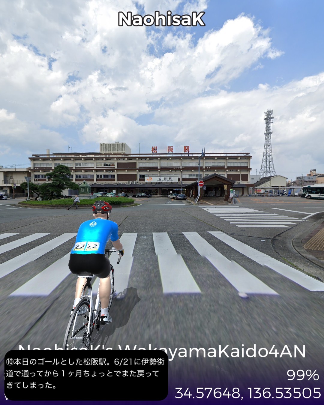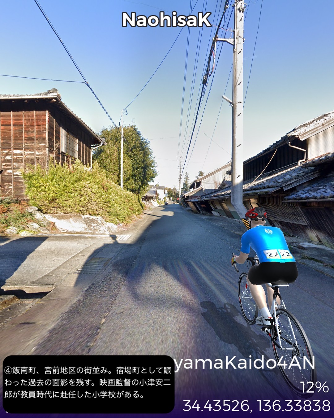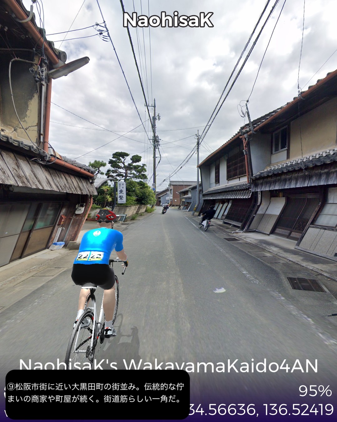 VRサイクリング 和歌山街道4日目。本日のルートは全て松阪市。松阪市飯高町の犬飼付近をスタートして宮前、さらに伊勢へ向かう追分を通り、大河内集落を抜けてつい1ヶ月ほど前に伊勢街道で通過した松阪市街の松阪駅をゴールとする46kmの行程。松阪市にはすでに前回ルートの後半、高見峠を越えた時点で足を踏み入れている。そこから延々今回のゴールまで50km以上松阪市は続く。またこの街道筋にほぼ付かず離れず横を流れる櫛田川は源流から河口まで松阪市内のみを流れる。何という広い市なのだ。前々回あたりからずっと紀伊山地の横断を続けてきて山は飽き飽きしてきたところでようやく海岸沿いの平野部に到達したが、次回からはまた山の中へ戻ってゆくことになる。島国日本だから仕方ないか。