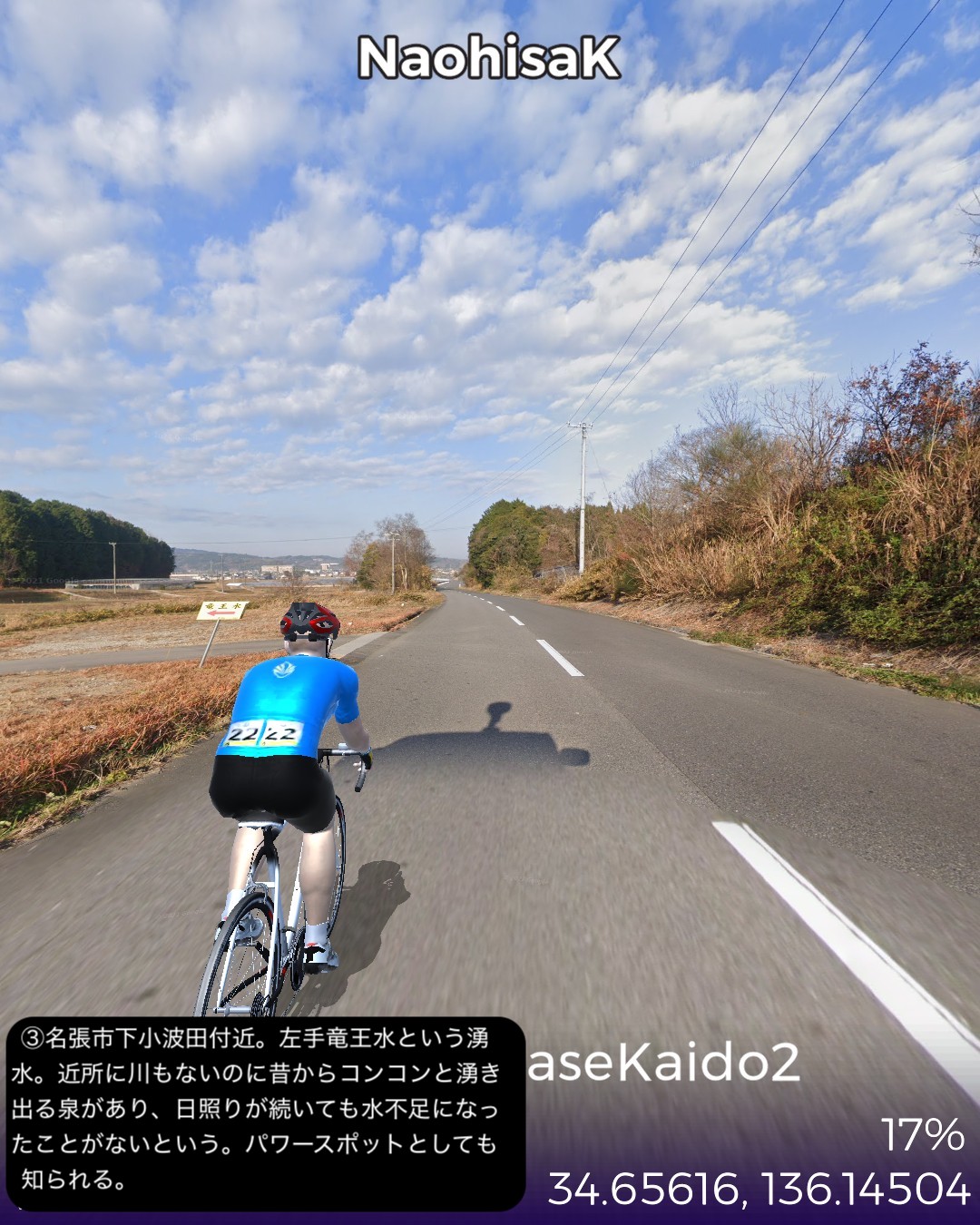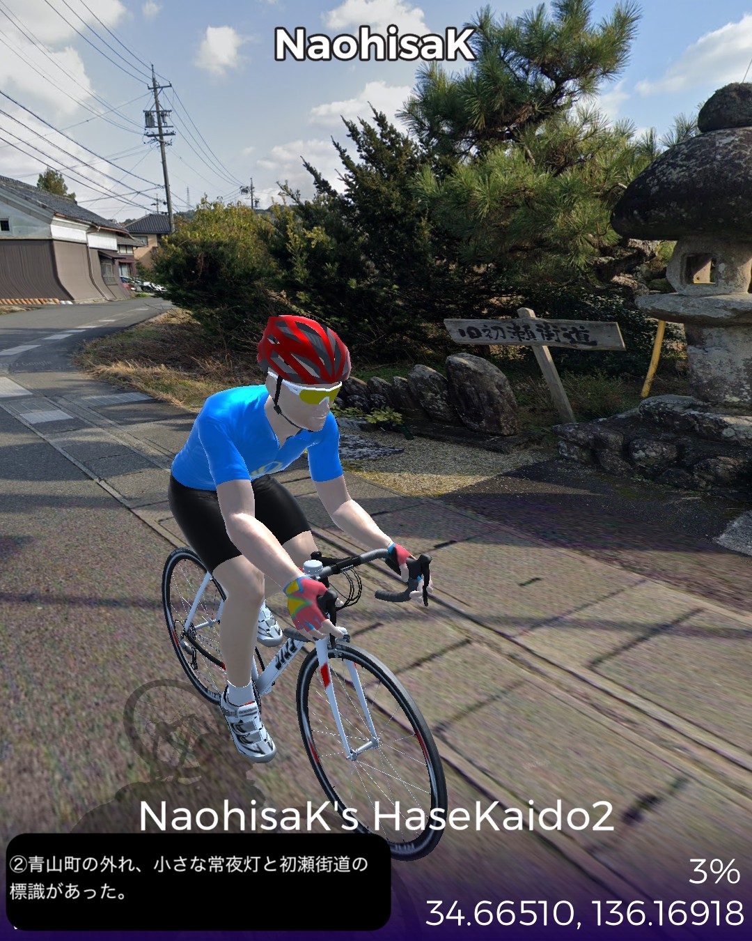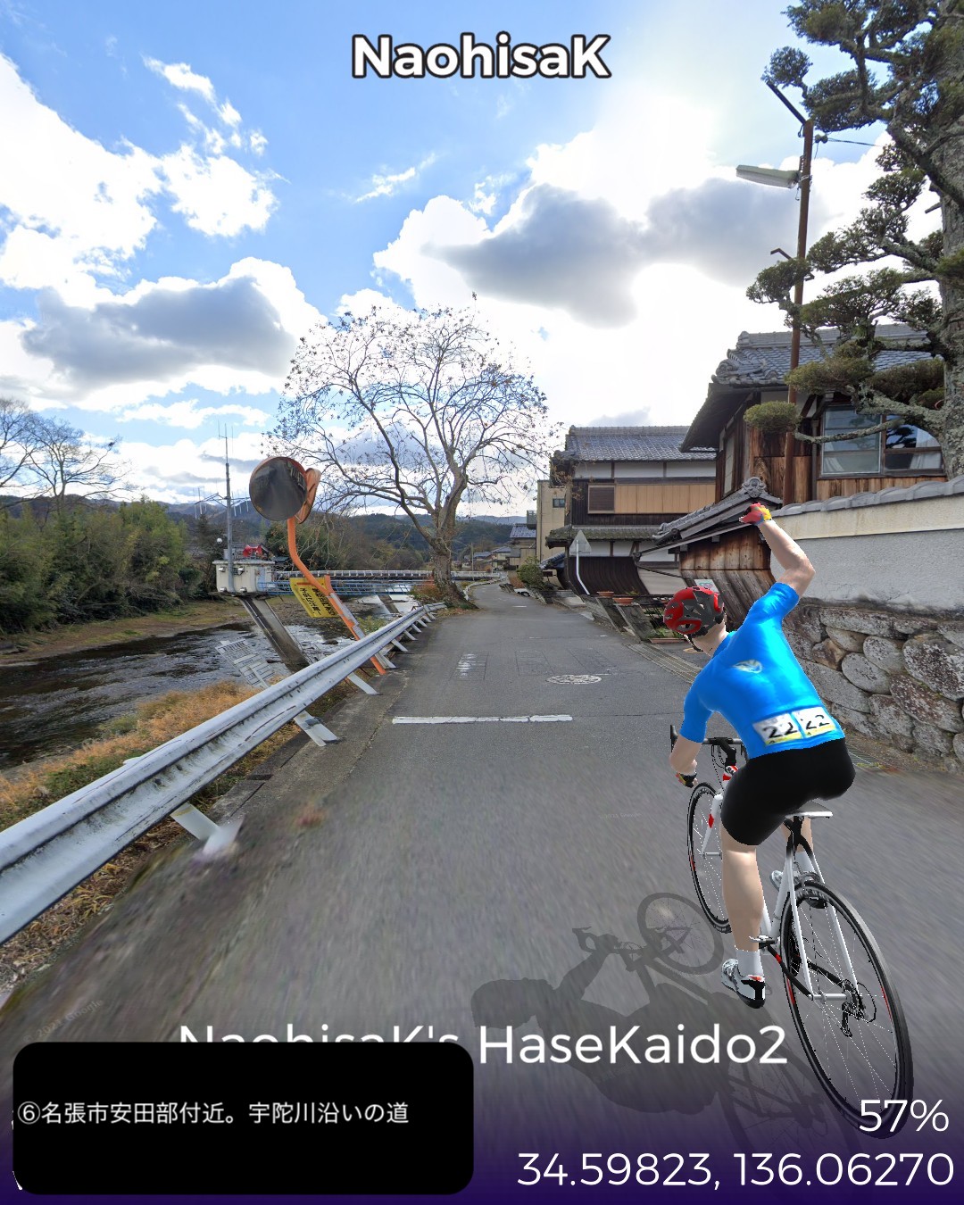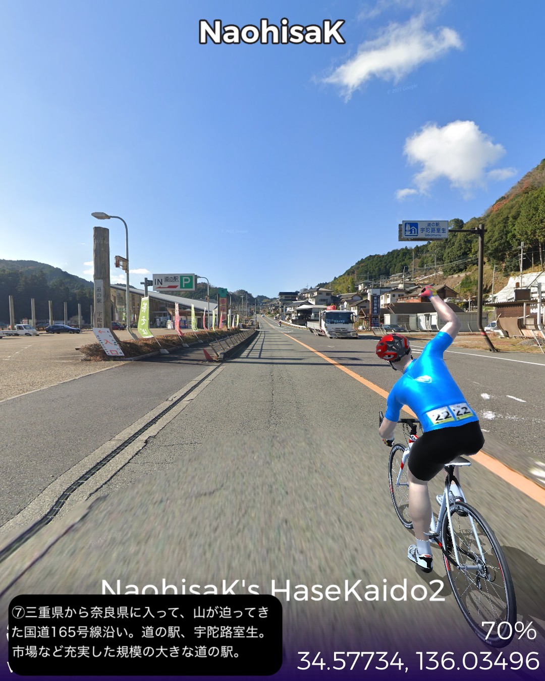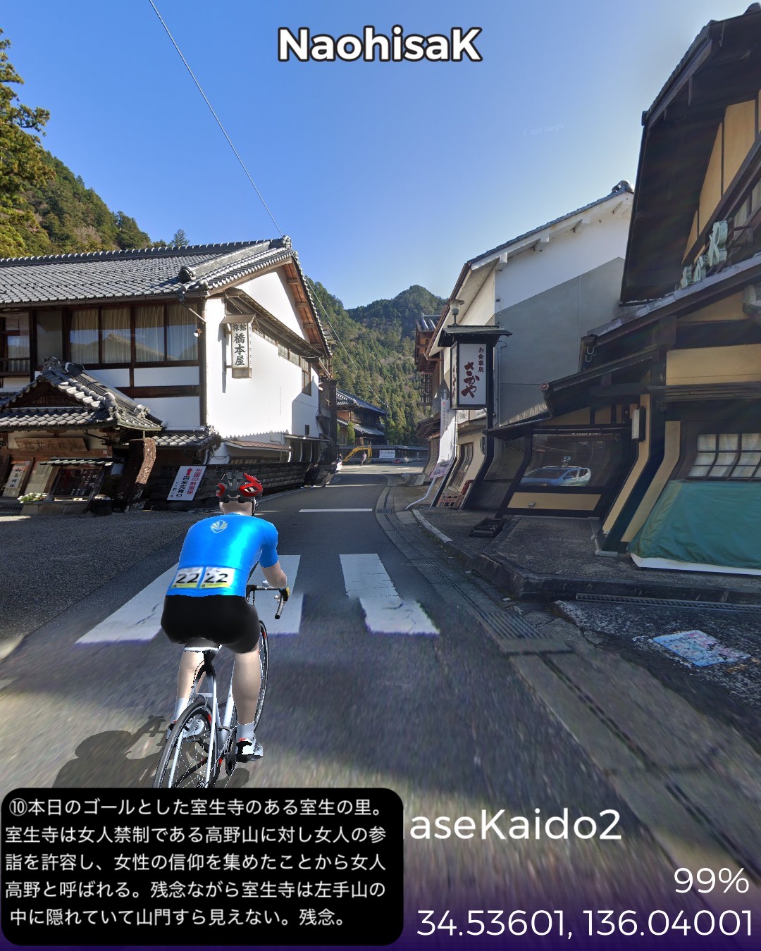 VRサイクリング 初瀬街道2日目。青山高原西側の伊賀地方の町青山の阿保宿をスタートし、古風な街並みが長く続く大きな宿場街道の交通の要衝地名張を通過。宇陀川に沿って山間の谷間へ分け入ってゆき、近鉄室生口大野駅から街道を外れて寄り道モード。さらに深い谷を遡り室生寺のある室生の里まで32kmの行程。名張は近鉄大阪線が通り、大阪まで1時間で行ける場所で大阪のベッドタウンとしても機能していると思うが市街地には高いマンションは目立たず、街道沿いに昔ながらの商家、町屋が建ち並び史跡も多い魅力的な町であった。それから街道沿いでいい感じだったのは宇陀川の狭い谷に展開する三本松宿。いくつかの集落に分かれてそれぞれ古い家並が維持されているが、中でも一番西側の元三集落が山の中の旧道に静かな佇まいで古い家並が点在し、街道ウォーカー(私のこと)の琴線に触れた。ゴールとした室生寺は昔から行ってみたい寺だったので、かなり街道から外れるが寄り道してみた。奥深い山の中にキリッとそびえる五重塔の絵に憧れていたが、残念ながら五重塔どころか山門も山の中でルート上から見えなかった。それでも室生川に沿って展開する室生の里の門前の雰囲気が味わえただけでも良かったかな。