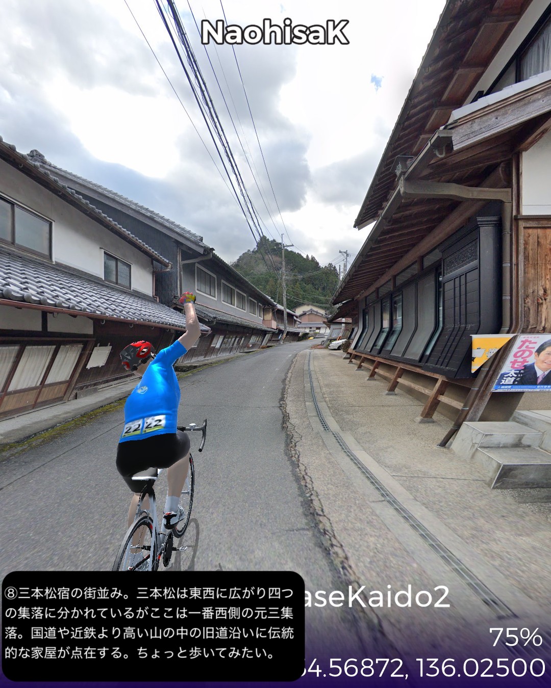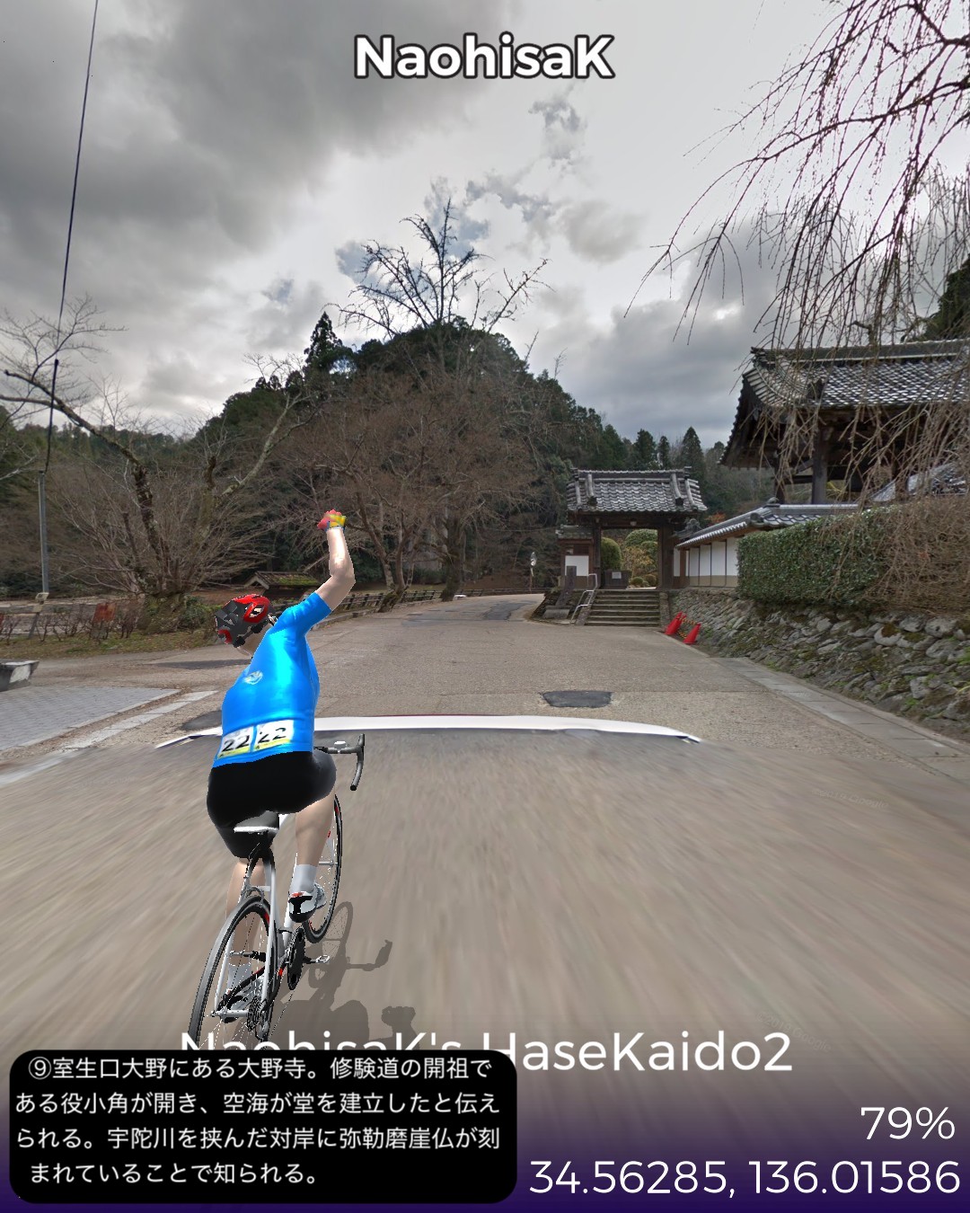 VRサイクリング 初瀬街道2日目。青山高原西側の伊賀地方の町青山の阿保宿をスタートし、古風な街並みが長く続く大きな宿場街道の交通の要衝地名張を通過。宇陀川に沿って山間の谷間へ分け入ってゆき、近鉄室生口大野駅から街道を外れて寄り道モード。さらに深い谷を遡り室生寺のある室生の里まで32kmの行程。名張は近鉄大阪線が通り、大阪まで1時間で行ける場所で大阪のベッドタウンとしても機能していると思うが市街地には高いマンションは目立たず、街道沿いに昔ながらの商家、町屋が建ち並び史跡も多い魅力的な町であった。それから街道沿いでいい感じだったのは宇陀川の狭い谷に展開する三本松宿。いくつかの集落に分かれてそれぞれ古い家並が維持されているが、中でも一番西側の元三集落が山の中の旧道に静かな佇まいで古い家並が点在し、街道ウォーカー(私のこと)の琴線に触れた。ゴールとした室生寺は昔から行ってみたい寺だったので、かなり街道から外れるが寄り道してみた。奥深い山の中にキリッとそびえる五重塔の絵に憧れていたが、残念ながら五重塔どころか山門も山の中でルート上から見えなかった。それでも室生川に沿って展開する室生の里の門前の雰囲気が味わえただけでも良かったかな。