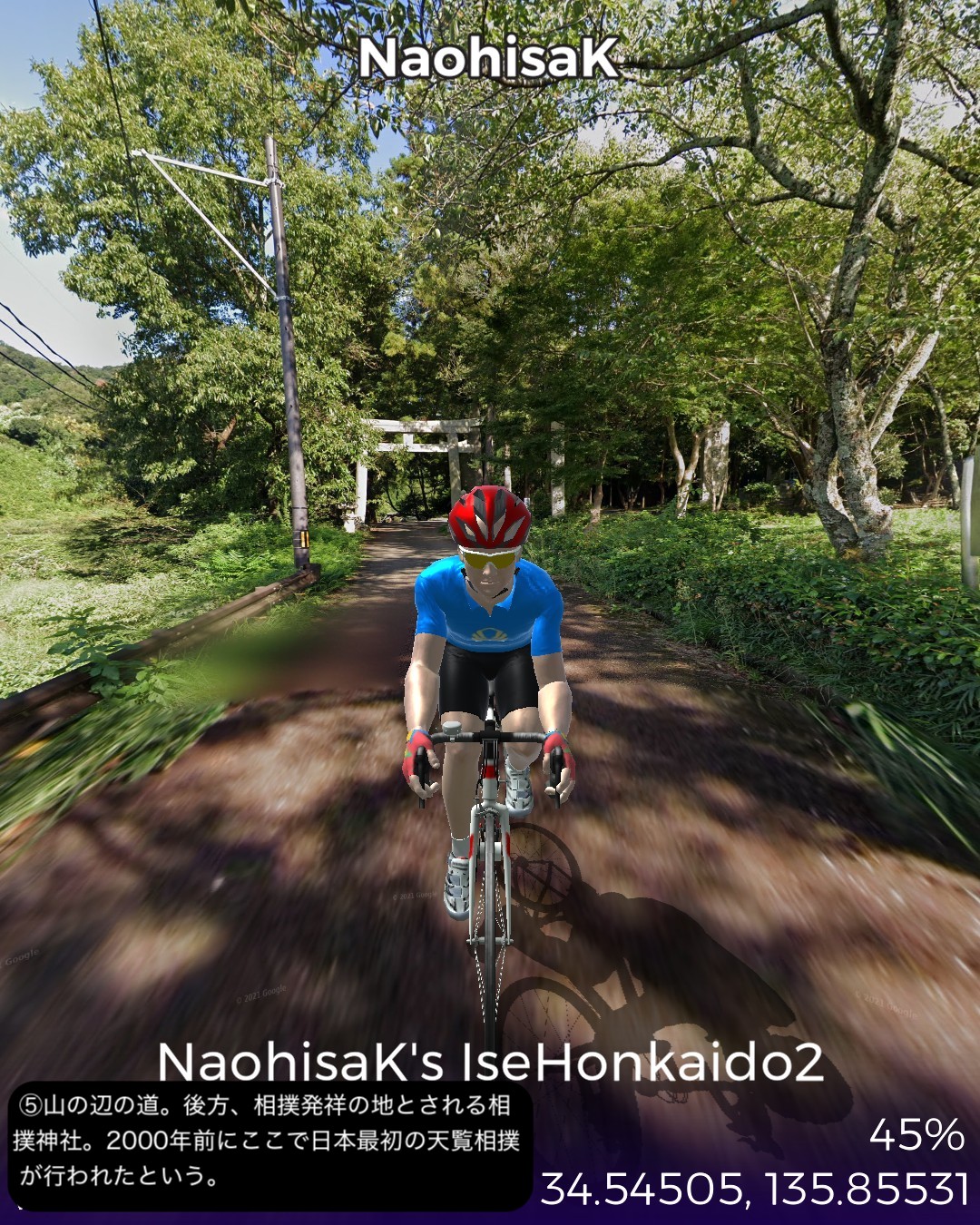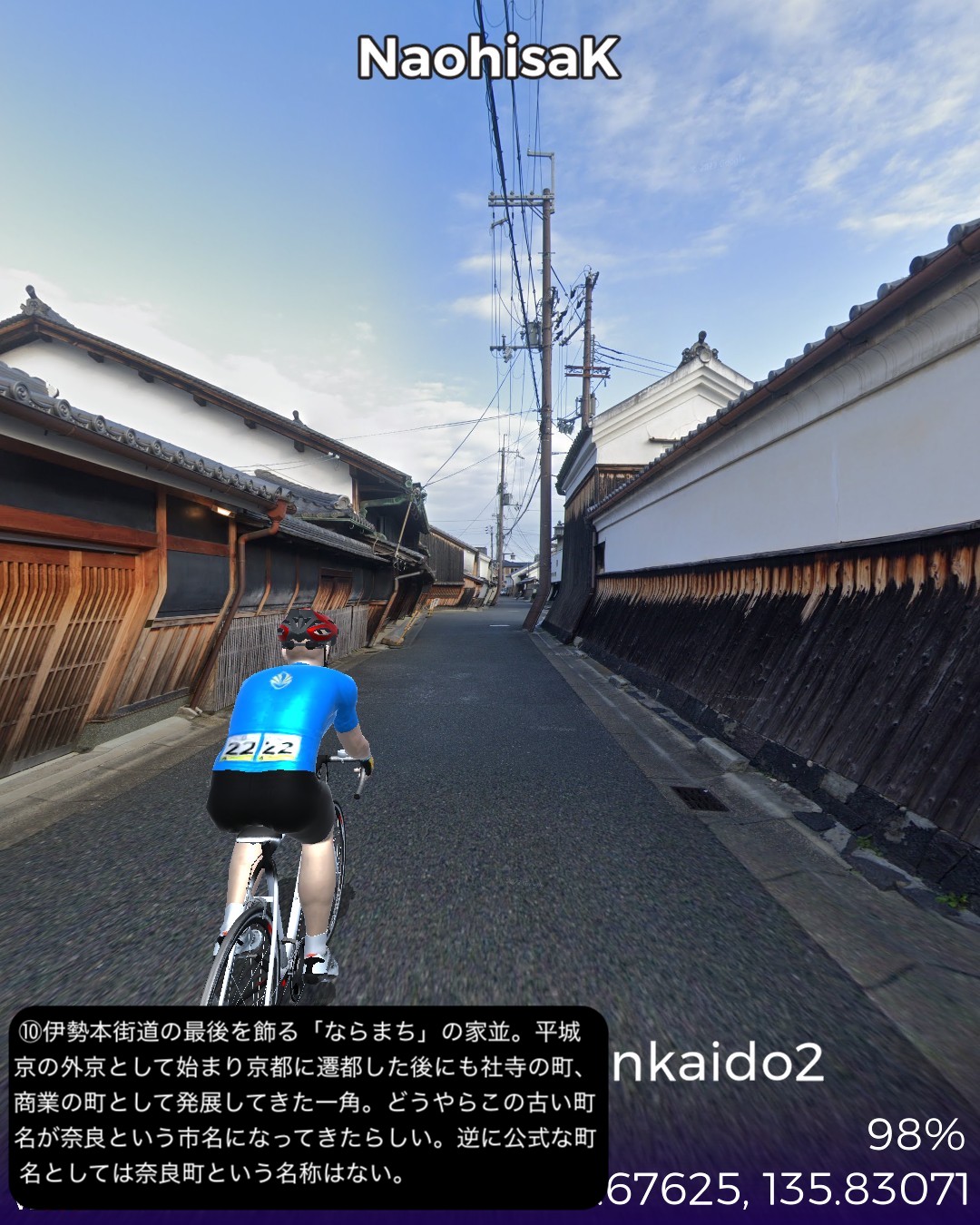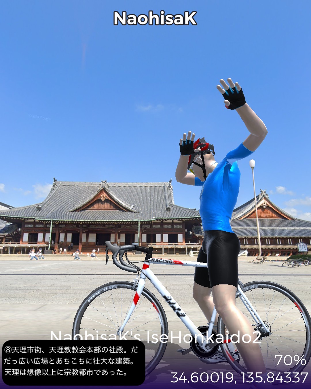 VRサイクリング 伊勢本街道2日目。と言いつつ今回も脱線寄り道大会。橿原神宮を出発し、平城京遷都前の都があった藤原宮跡を経て桜井市街を抜け、三輪山の麓の山の縁を北上する古道、山の辺の道を進み、日本最大の宗教都市天理からようやく本来の街道、伊勢本街道を進み奈良の猿沢池をゴールとする36kmの行程。中々贅沢な行程であった。まずは明日香にほど近い場所、飛鳥時代から奈良時代へのステップと位置付けられる初めての中国式の都、藤原宮跡でその前の飛鳥宮と一線を画す壮大さを実感する。古い街並みの桜井市街を通り抜け、古代の道、山の辺の道に入る。基本的にハイキングコースなのでストリートビューを完備したルートとして設定しきれないがそれでも結構かなりの部分をルートとして収録できた。リアルに訪れたことはないが、歴史ある寺社が散りばめられ、きつい山道はなく長閑な麓と田園の田舎道はほっこりする道筋だ。山の辺の道を外れ天理市街に入ると、天理教本部の壮大な伽藍とだだっ広い広場にびっくり。北京とかモスクワに来たみたい。天理市内には信者用と思われる天理教仕様の屋根庇付きのアパート・マンションがあちこちに建っていてココは何処?感が半端ない。天理からは今回初めて伊勢本街道に戻り奈良を目指すが、天理・奈良の10km弱の街道筋は周囲が田園が広がっているのに古い家並がびっちり建ち並び街道筋がいかに栄えていたかよくわかる。特にゴール直前、奈良の旧市街、ならまちの伝統的な町屋の街並みが素晴らしい。今回は名所てんこ盛りで入れきれなくて残念な場所も多かった。次回は奈良街道で再度京都を目指す。